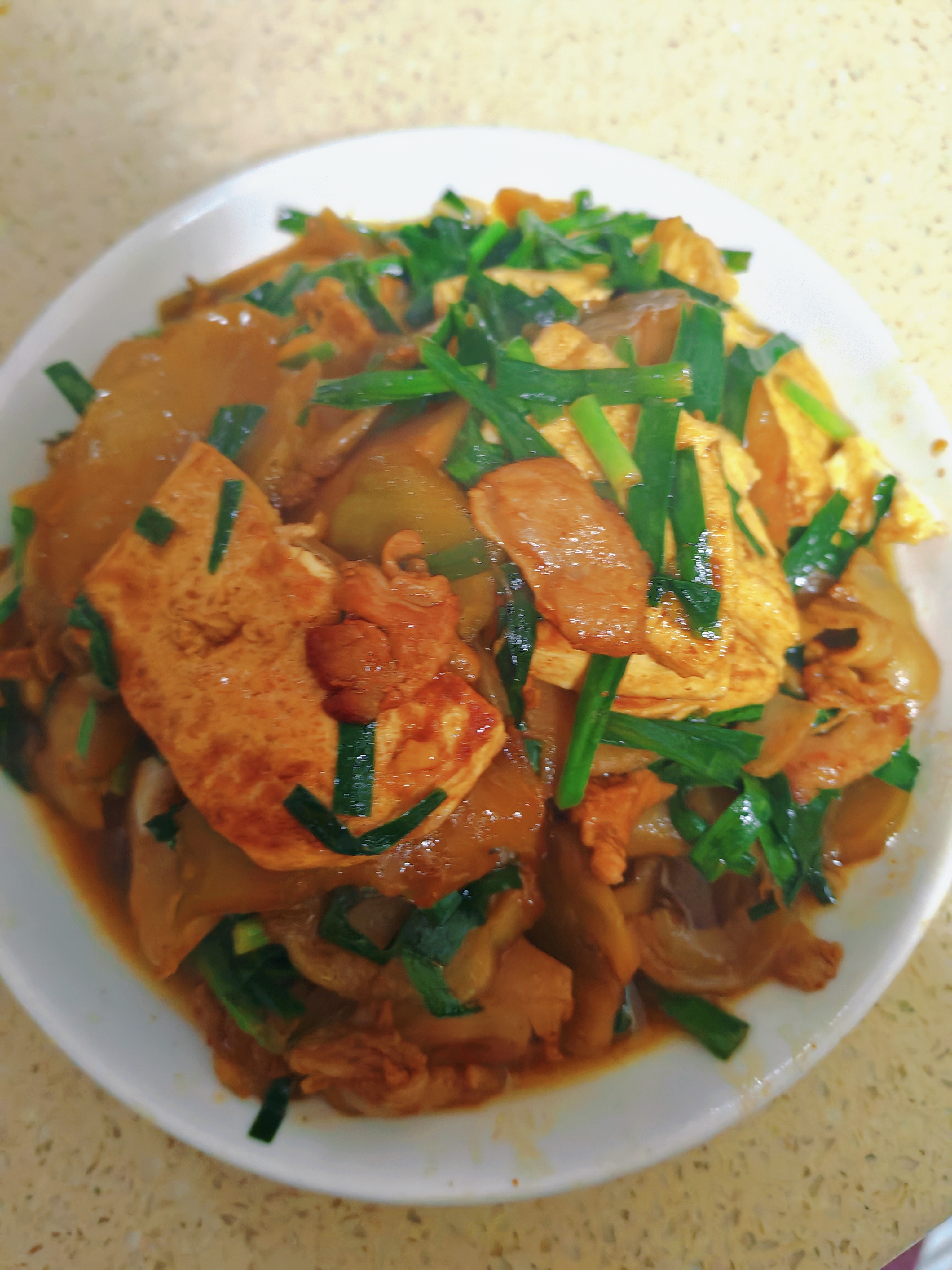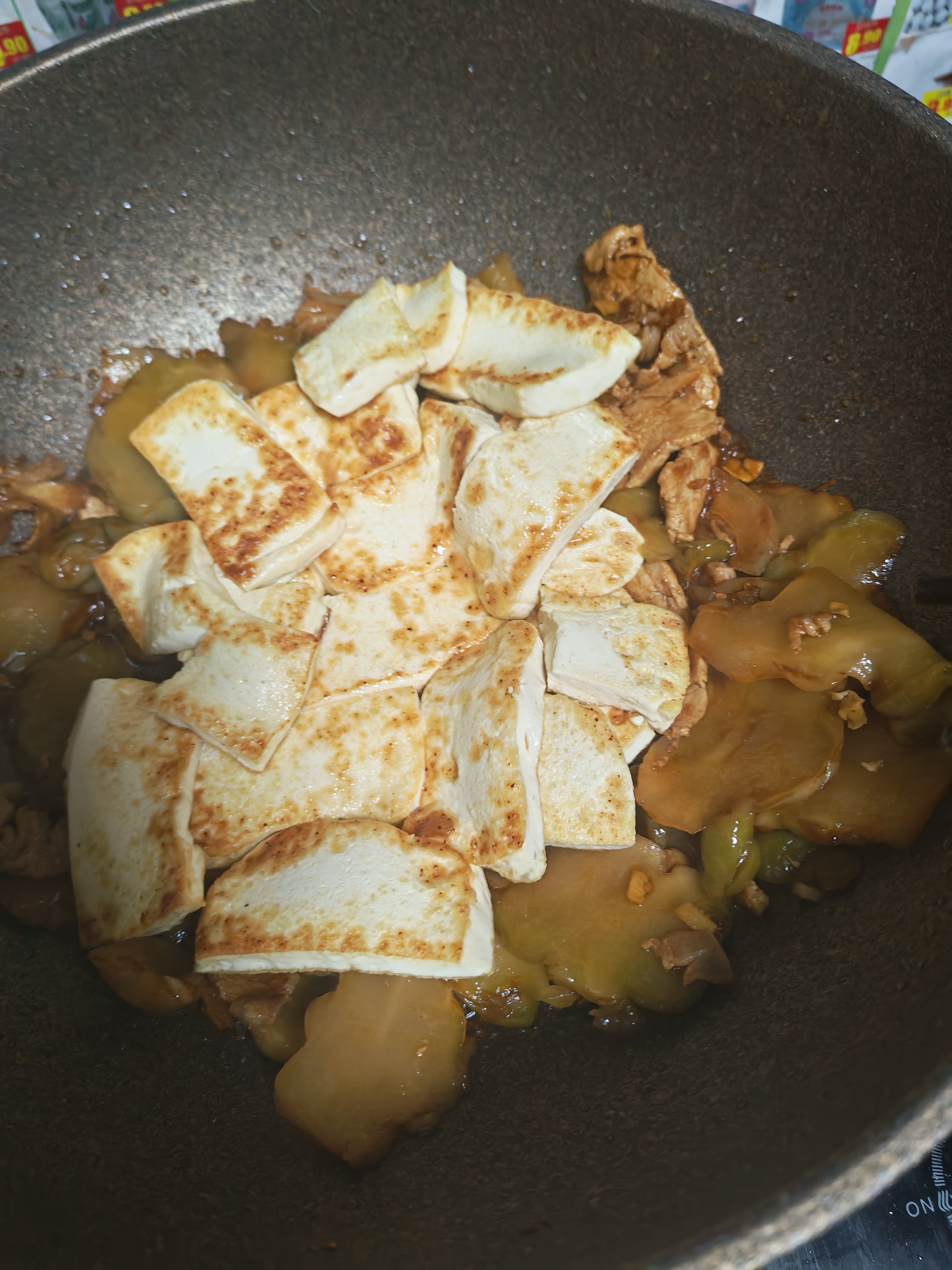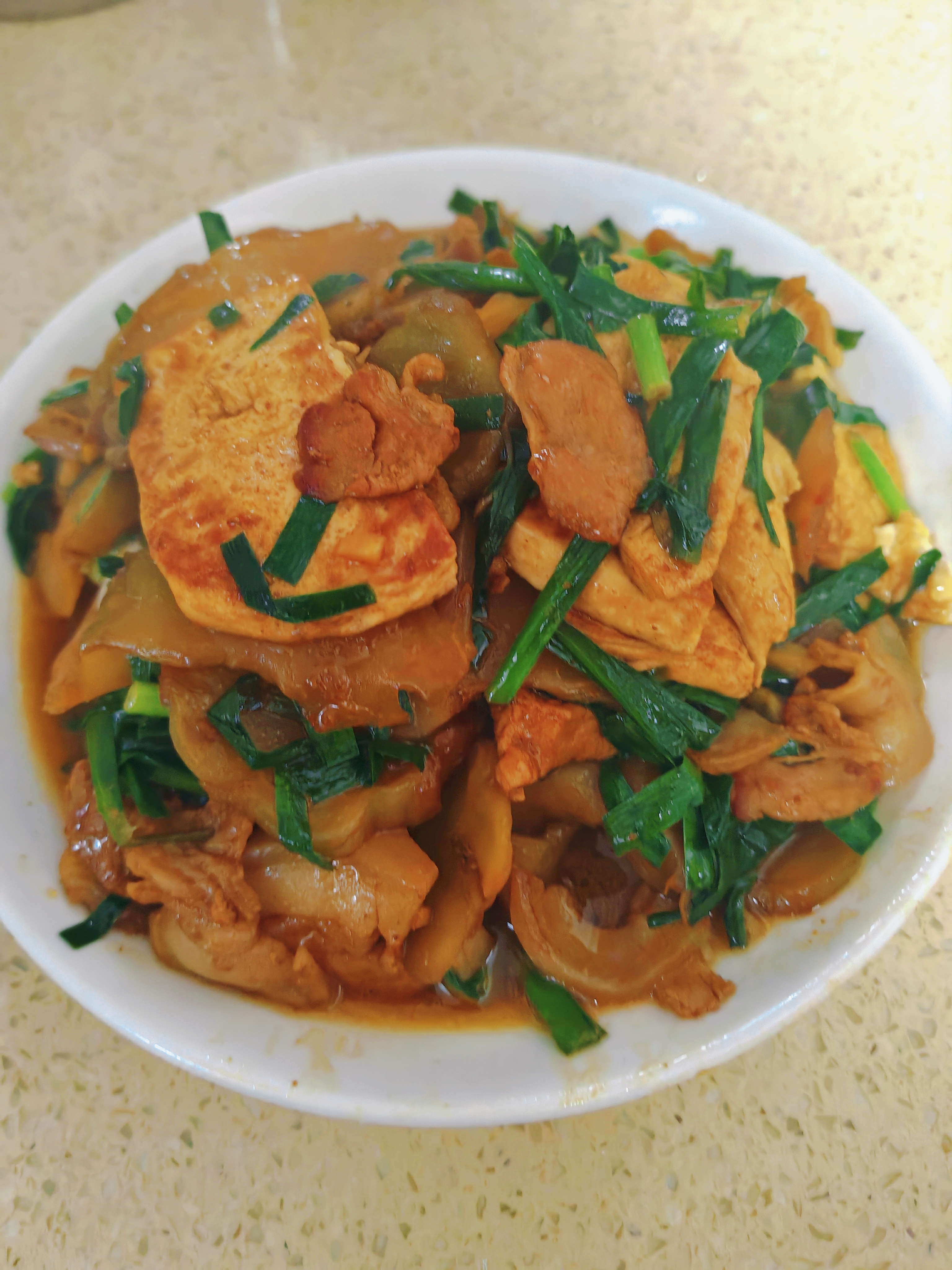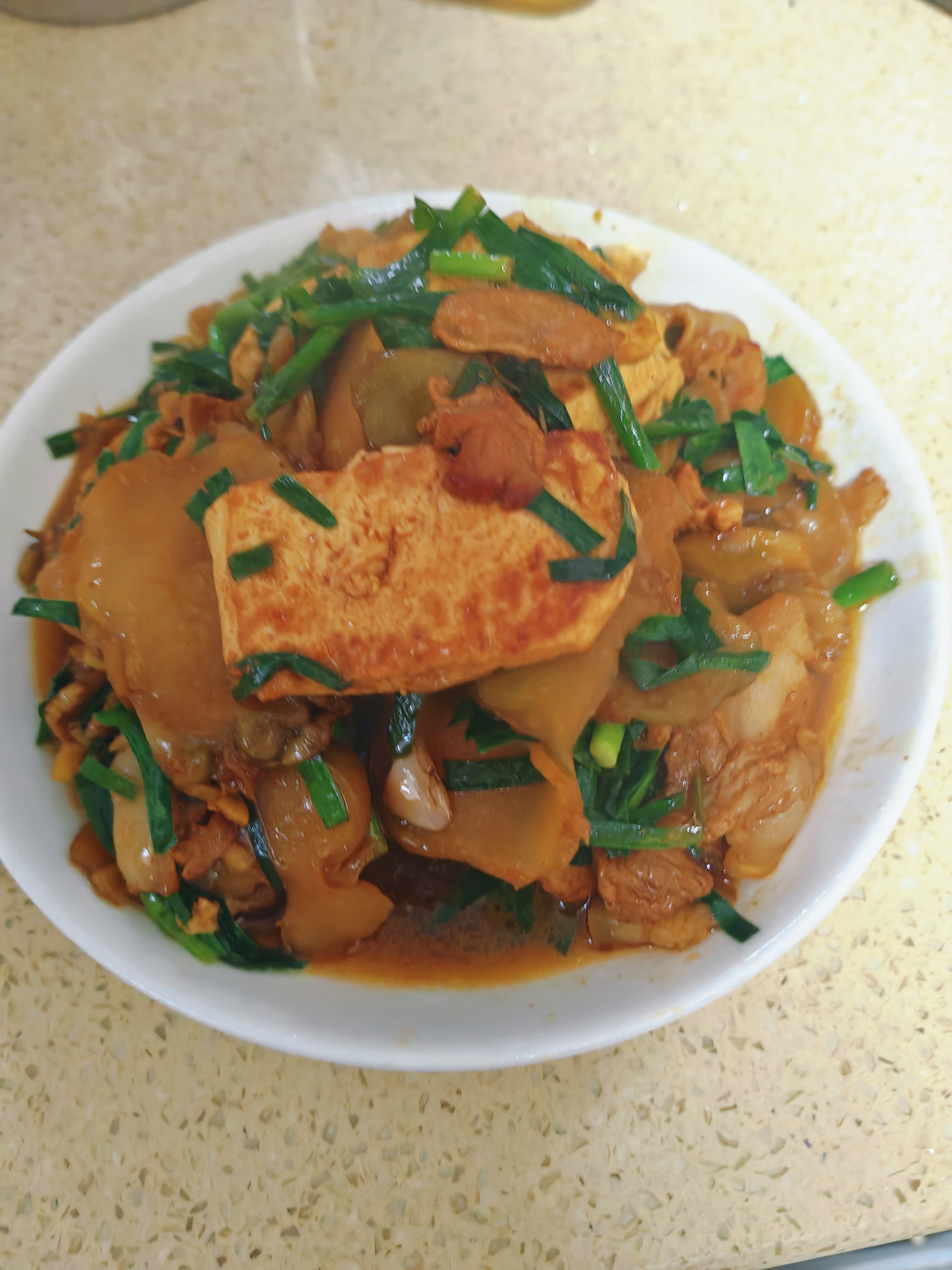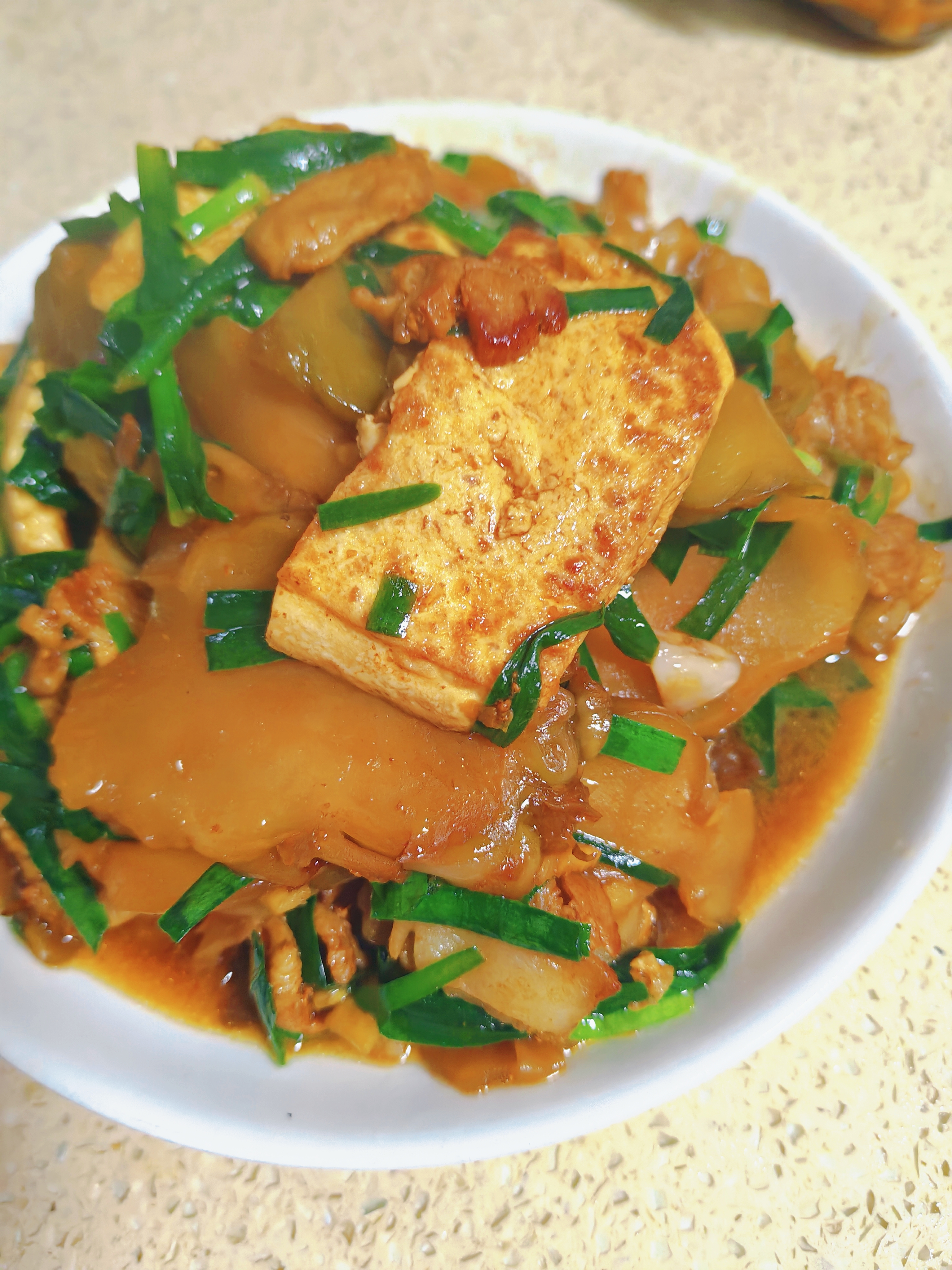 榨菜烧豆腐 平凡食材的神仙搭配!榨菜烧豆腐,鲜爽不齁咸,豆腐软嫩入味,拌饭拌面都绝配,厨房小白也能零失败! 详细烹饪步骤 1. 食材预处理:榨菜切成薄片,放入清水中浸泡10分钟去多余咸味,捞出沥干;五花肉切薄片,嫩豆腐切成均匀方块,韭菜洗净切段,姜切丝、蒜切片备用 2. 煎制豆腐:热锅冷油,油温六成热时放入豆腐块,小火慢煎至两面金黄定型,捞出控油备用 3. 煸香增味:锅中留底油,放入五花肉片,中小火煸炒至肉片变色、逼出油脂,接着下入姜丝、蒜片爆香 4. 翻炒调味:放入沥干的榨菜片,大火快速翻炒1分钟出香,沿锅边淋入少许料酒去腥提香 5. 焖煮入味:放入煎好的豆腐块,加适量热水没过食材一半,调入少许老抽上色、1小勺白糖提鲜,大火煮开后转小火焖煮5-8分钟,让豆腐充分吸饱汤汁 6. 收尾出锅:开盖后大火收浓少许汤汁,放入韭菜段快速翻炒至断生,加少许味精调味,淋入香油拌匀,关火即可装盘