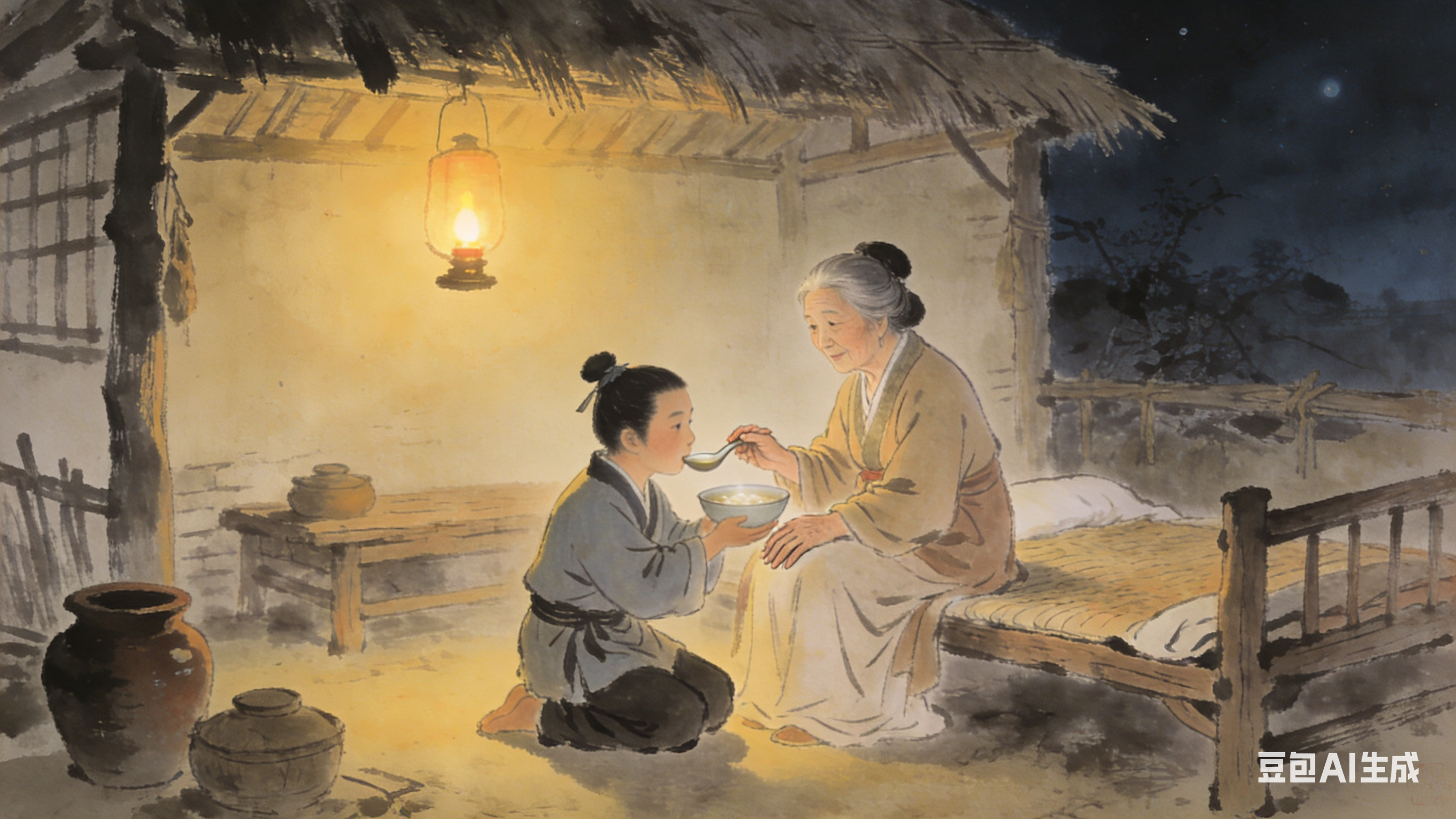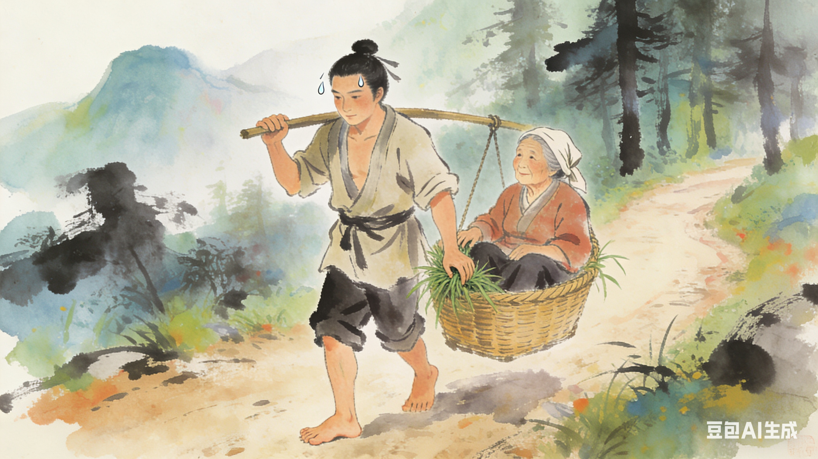 中华二十四孝之行佣供母 江革背母逃难,行佣供养,不离不弃。