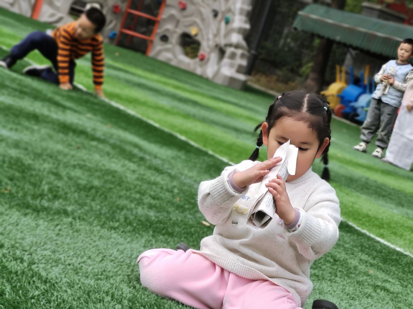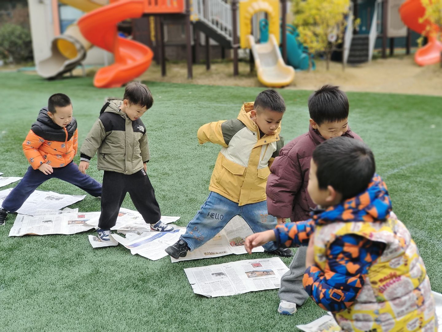 “小小报纸乐趣多”趣味游戏 为丰富幼儿的户外活动体验,激发幼儿的想象力与创造力,近日,兰亭中心幼儿园中(1)班开展了以“小小报纸乐趣多”为主题的趣味游戏活动。 活动中,孩子们与报纸开启了奇妙的互动:有的化身“小勇士”,在铺着报纸的草坪上踩、跳,感受报纸的触感与游戏的快乐;有的则发挥创意,将报纸卷成小喇叭,专注地摆弄、吹奏,探索报纸的多种玩法。一张张普通的报纸,在孩子们的手中变成了趣味十足的游戏道具,草坪上充满了欢声笑语。 此次活动,不仅让孩子们在轻松的氛围中锻炼了肢体协调性与动手能力,还培养了他们的想象力和合作意识。后续,我班将继续挖掘生活中常见物品的游戏价值,为幼儿设计更多趣味十足的活动,让孩子们在玩中学、学中乐。