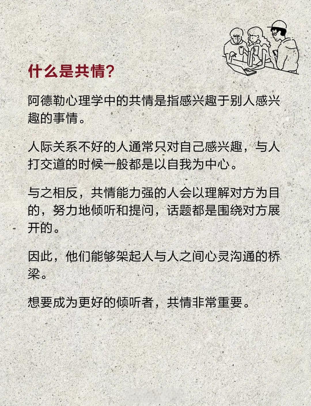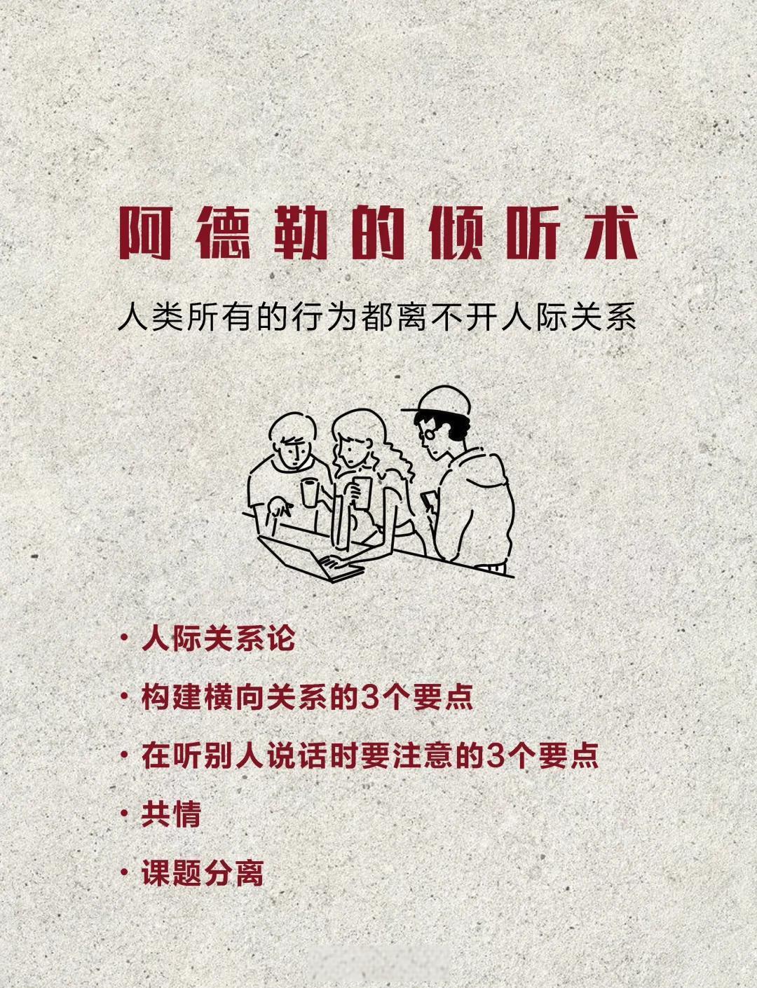 《阿德勒的倾听术》是潮新闻第九期阅读活动可免费阅读的书籍之一,其是一部专注于改善人际关系的阿德勒心理学实用指南。核心观点是:沟通的关键不在于“说”,而在于“听”,真正的倾听能赋予自己和他人面对生活的“勇气”。 阿德勒的倾听术 (2023年出版) · 核心观点:沟通的关键在于倾听,而非表达。 · 理论基石:阿德勒心理学的“勇气心理学”,强调尊重、信赖、共情。 · 内容特色:轻阅读口袋书,结合漫画与大量场景示例,易读实用。 · 作者地位:岩井俊宪,日本著名阿德勒心理学专家,与岸见一郎齐名。 💡 核心观点:从“对立的沟通”到“合作的倾听” 这本书的核心在于实践阿德勒心理学中横向、平等的人际关系理念。它认为,很多人际沟通的问题源于“纵向关系”,比如评价、说教、控制。而真正的倾听,需要建立在尊重、信赖和共情的基础上,目的是理解而非反驳,是协作而非征服。 📖 内容结构与特色 这本书结构清晰,从理念到方法再到场景,逐步深入: · 剖析常见问题:首先指出不善倾听的5个特征,如插嘴、否定他人等。 · 构建方法体系:详细介绍了成为善于倾听者的 12项基本技巧(如“附和与点头”、“重述确认”)和 14个应用方法(如“三明治提建议法”),并且强调了“非评价”态度的重要性。 · 覆盖丰富场景:书中包含超过33个职场与生活对话示例,覆盖了从初次见面、同事合作到安慰亲友、家庭沟通等具体情境。 ✨ 主要亮点与价值 · 化理论为实践:将“共同体感觉”、“目的论”等阿德勒核心概念,转化为可操作的倾听行为指南。 · 强调“赋予勇气”:书中反复强调倾听的最终目的不是解决问题,而是通过理解和接纳,让对方(或自己)感受到支持,重获面对课题的“勇气”。 · 形式轻松友好:采用漫画图解和大量对话对比(错误vs正确示范),降低了心理学门槛,读来没有负担。 🔍 潜在不足与阅读建议 这本书的定位是通俗实用的入门指南,这也意味着: · 深度相对有限:对阿德勒心理学体系本身的哲学探讨较浅,更像是一本专注于“倾听”这一具体技能的操作手册。 · 文化背景差异:书中一些高度依赖语境和微妙反应的日式沟通技巧,可能需要你结合自身文化环境进行理解和转化。 · 效果依赖练习:书中技巧看似简单,但如“不评价地倾听”需要刻意练习才能内化,仅阅读不实践效果有限。 💎 总结与建议 总的来说,《阿德勒的倾听术》是一本优秀的沟通改善入门书。它价值在于,为那些渴望改善人际关系、希望更深入理解他人的读者,提供了一套具体、易上手的行为框架。 如果你想深入了解阿德勒心理学更完整的哲学体系,可以将其作为起点,之后阅读《被讨厌的勇气》等更侧重于理论的著作。如果你在职场沟通、亲密关系或家庭交流中有具体的困扰,这本书能提供即学即用的思路。 大家是否对书中提到的某个具体技巧(比如如何应对愤怒的人,或者如何用“三明治法”提建议)特别感兴趣,我可以为你们进一步介绍哦~