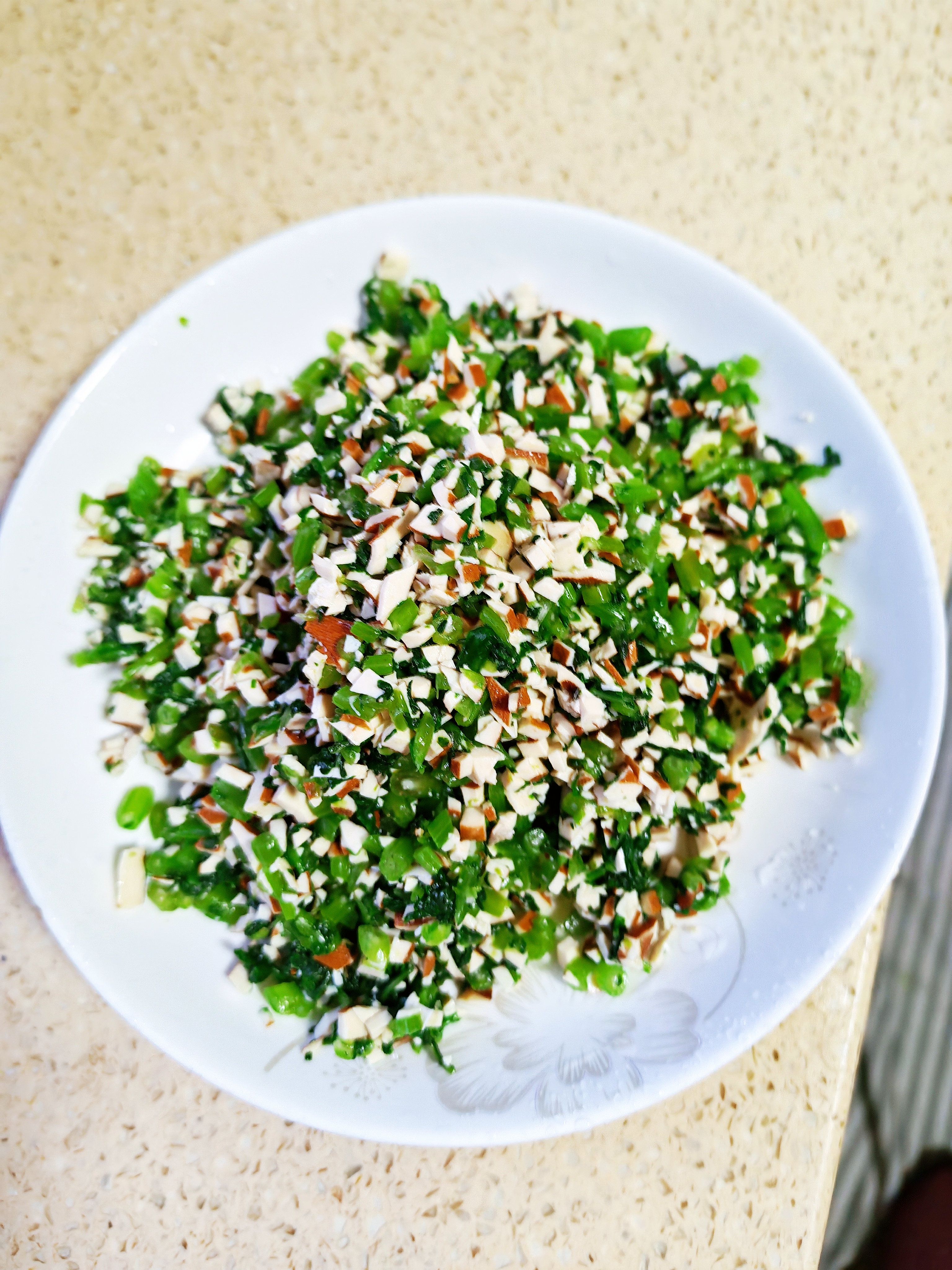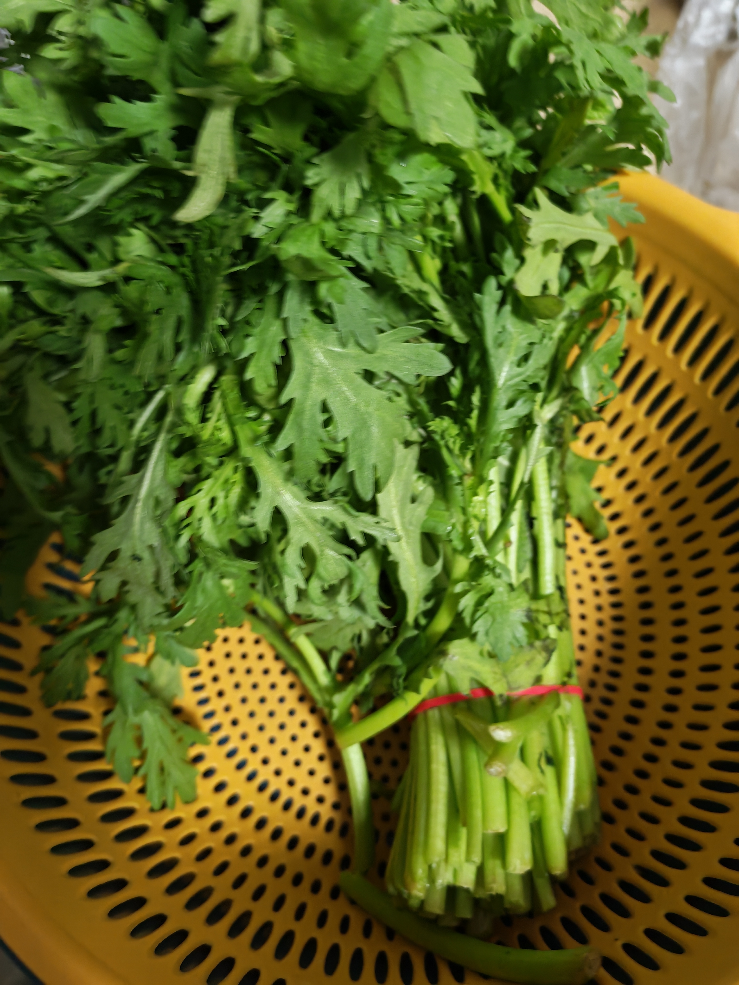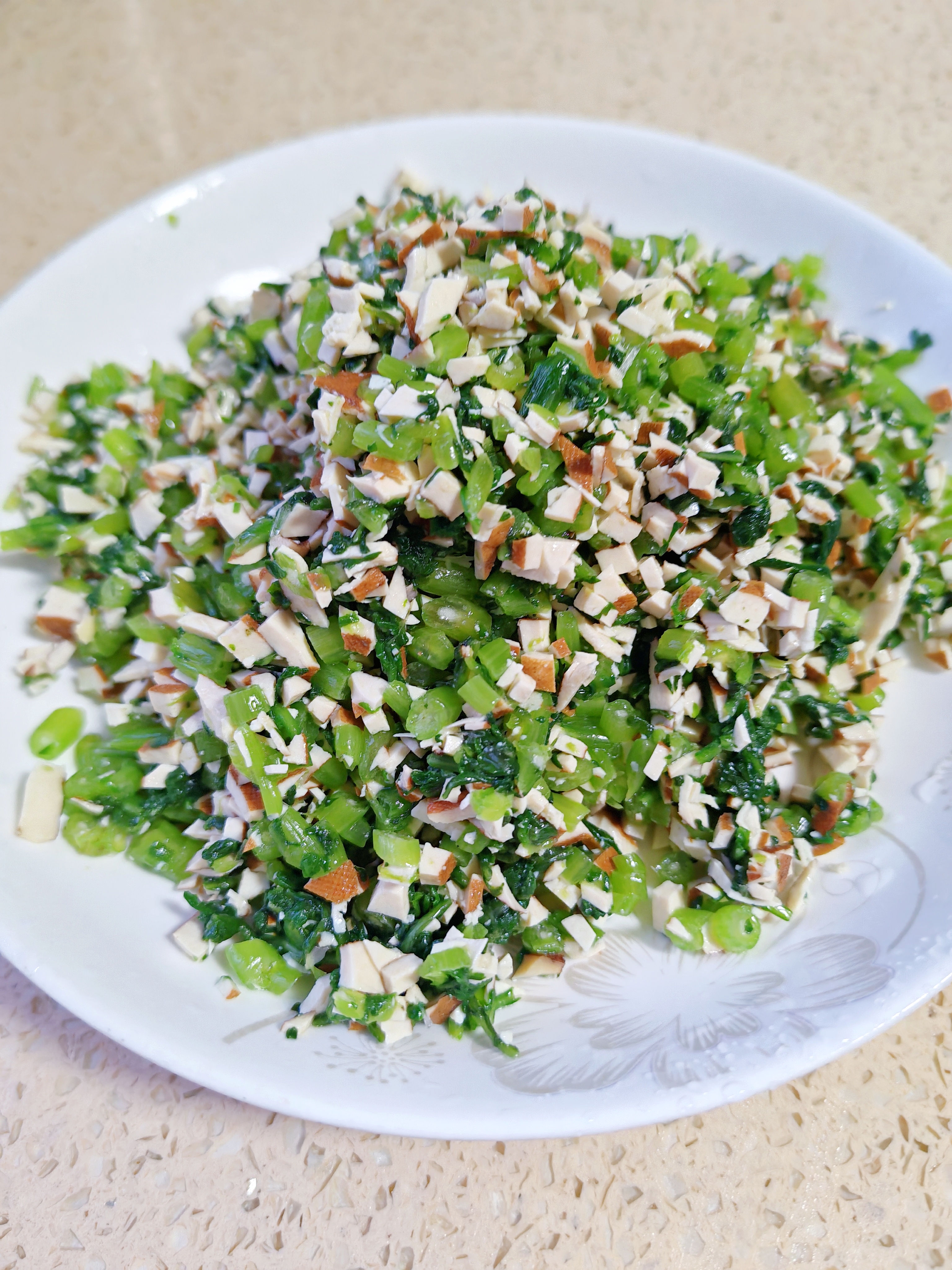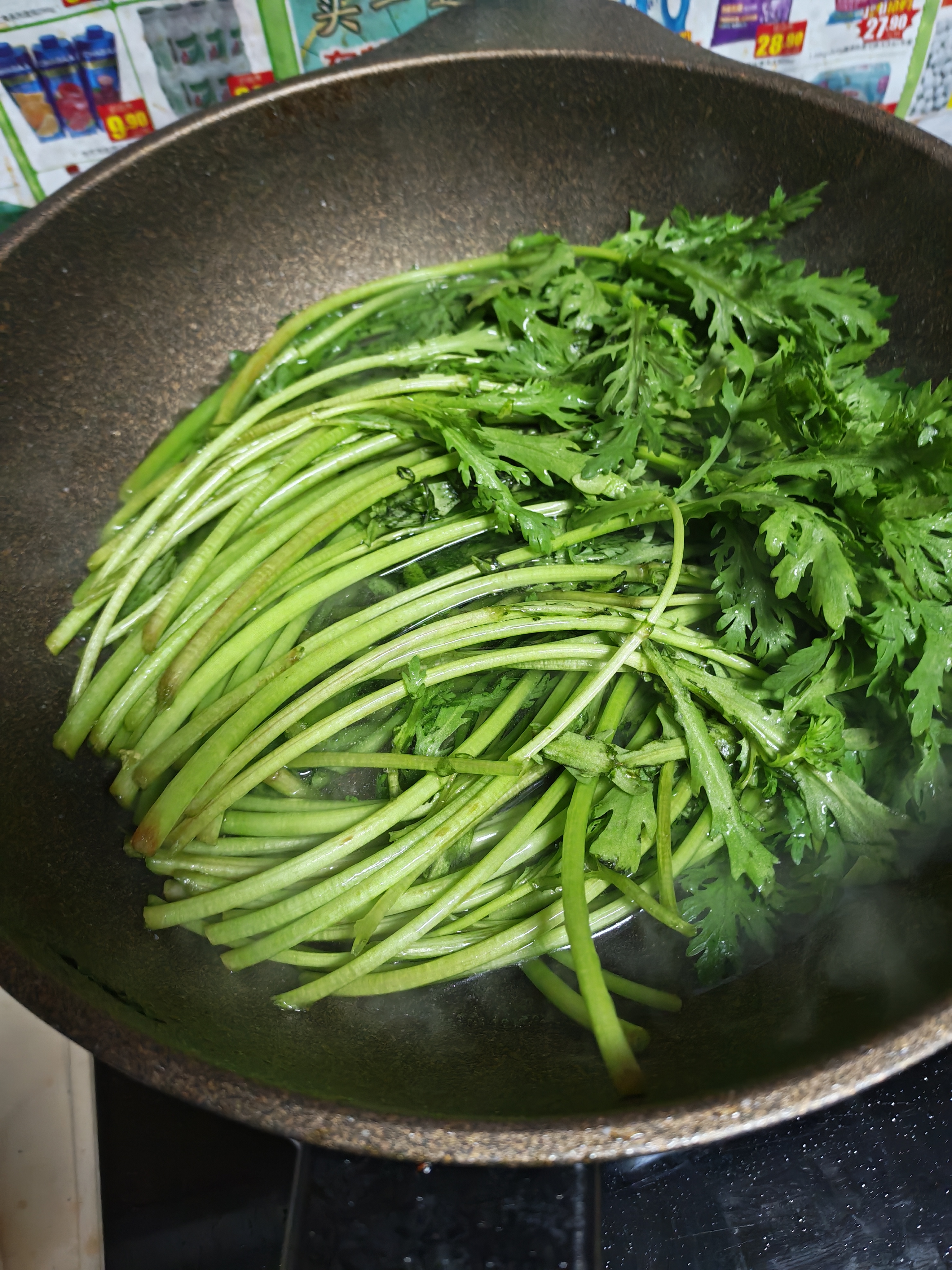 茼蒿拌香干 家常凉拌天花板!茼蒿拌香干,脆嫩爽口不油腻,拌一拌就能上桌,配粥下饭都绝了~ 极简家常做法 食材 茼蒿一把、香干2块、细盐少许、味精少许、香油适量 步骤 1. 香干先批成薄片状,再切细丝,最后剁成细末,装入碗中备用; 2. 茼蒿摘洗干净,锅中烧沸水,放入茼蒿焯水10秒至断生,捞出立即过凉水降温,避免发黄; 3. 放凉的茼蒿挤干多余水分,切成细末,和香干末混合在大碗中; 4. 加少许细盐、味精调味,淋上适量香油,充分拌匀即可装盘。 小窍门 茼蒿焯水别太久,10秒刚好,保持脆嫩口感; 水分一定要挤干,不然拌好后汤水多,影响口感; 不喜味精可省略,靠香油和食材本身提鲜就够味。 茼蒿可以换成荠菜,马兰菜,菠菜。