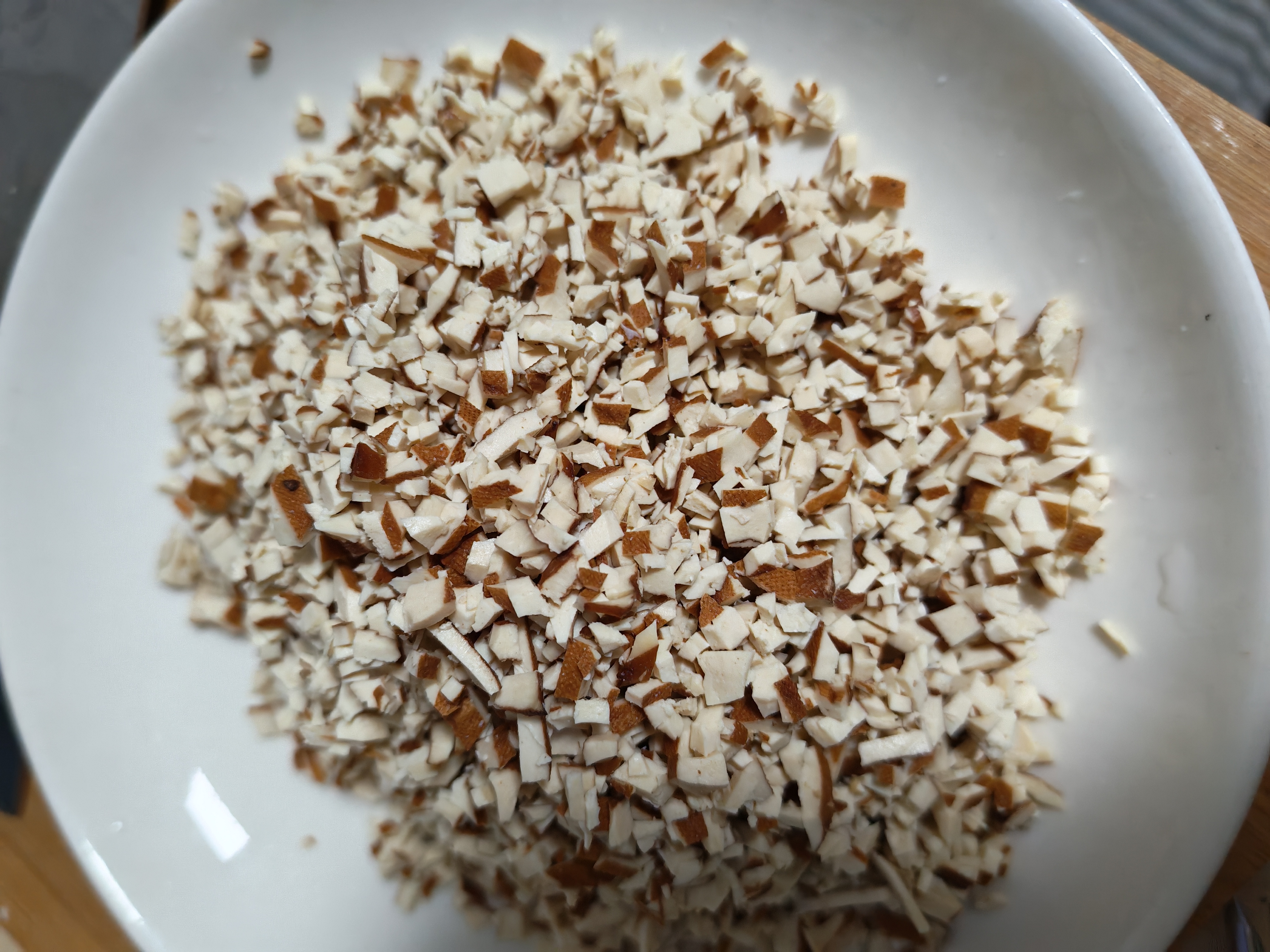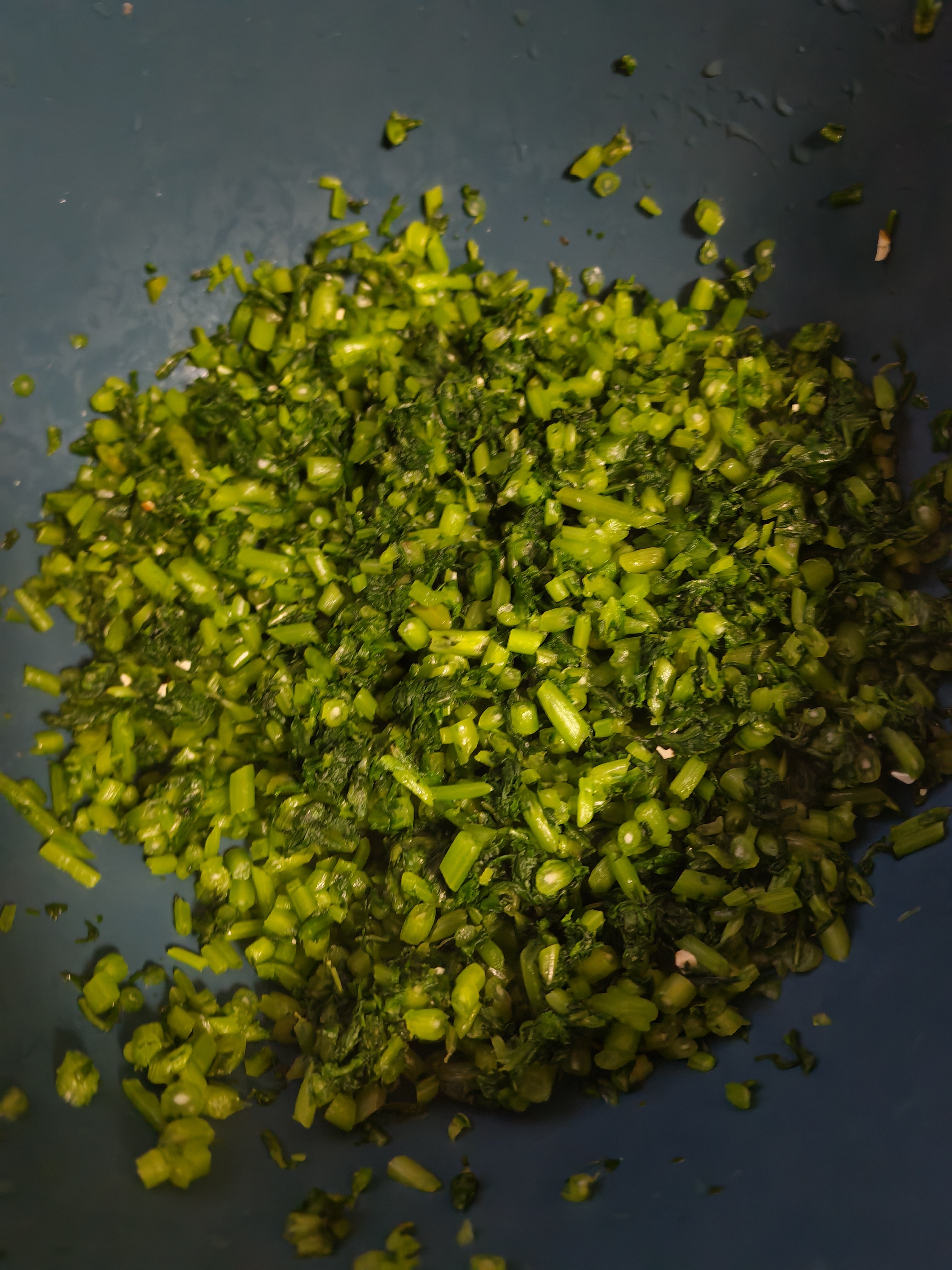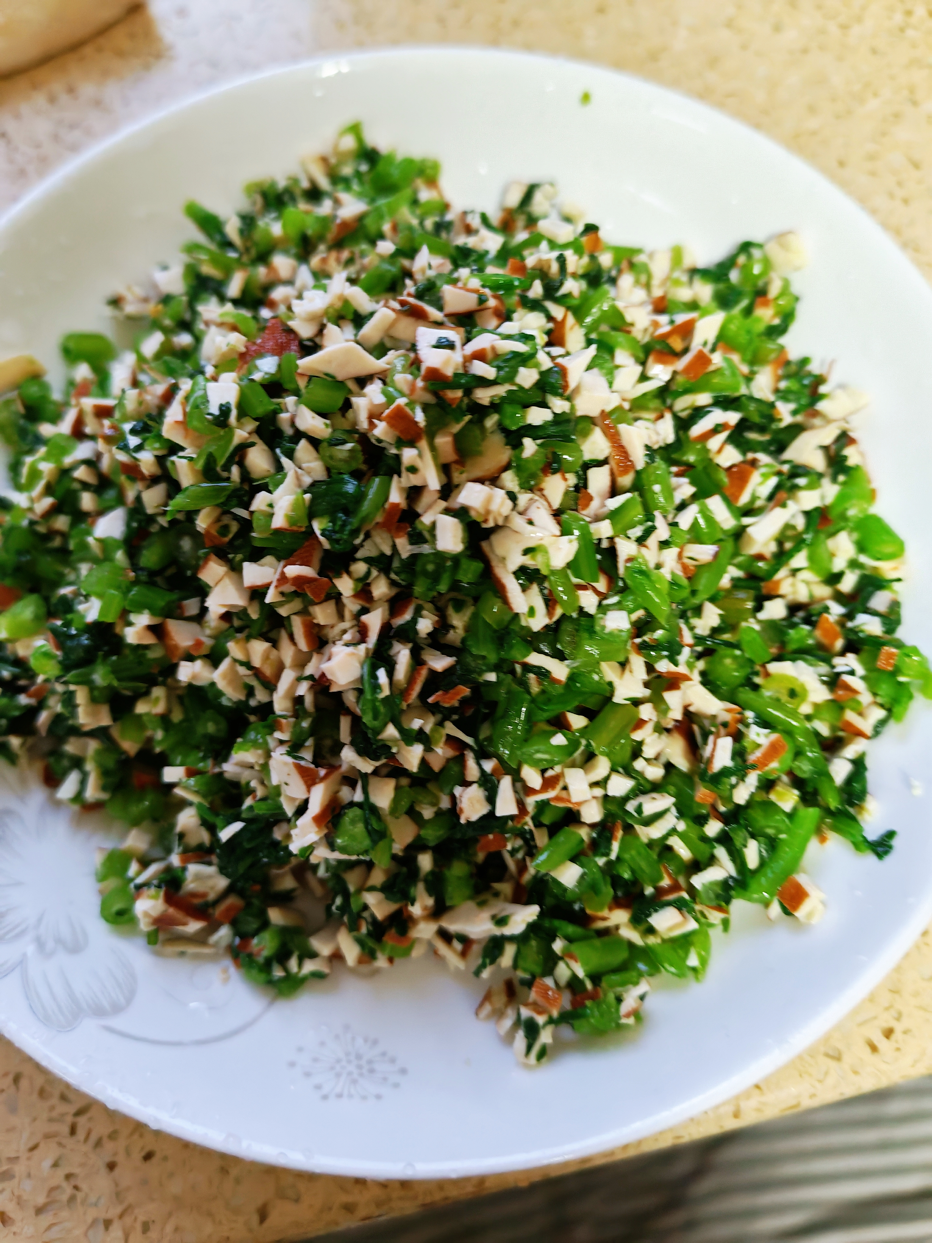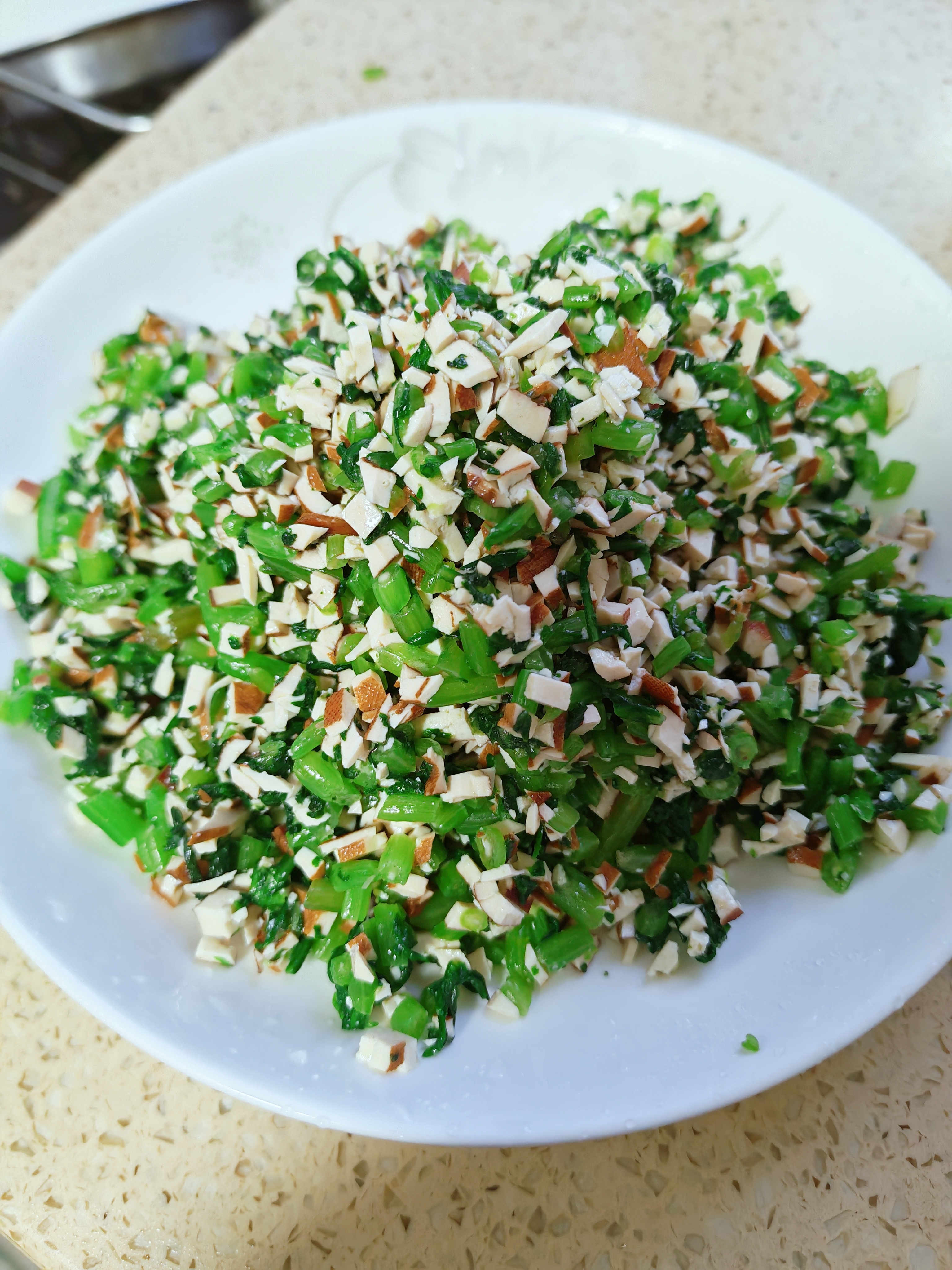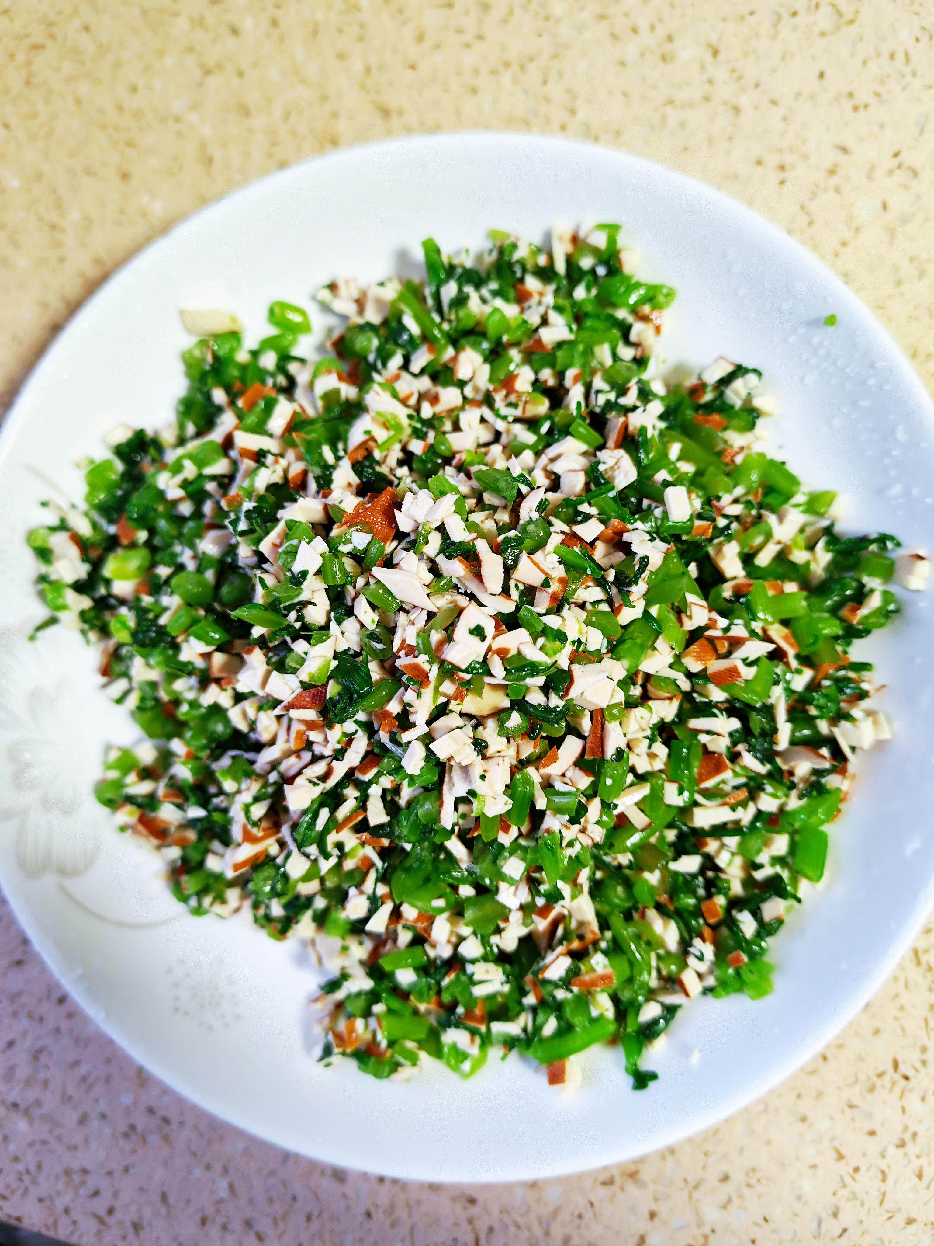茼蒿拌香干 家常凉拌天花板!茼蒿拌香干,脆嫩爽口不油腻,拌一拌就能上桌,配粥下饭都绝了~ 极简家常做法 食材 茼蒿一把、香干2块、细盐少许、味精少许、香油适量 步骤 1. 香干先批成薄片状,再切细丝,最后剁成细末,装入碗中备用; 2. 茼蒿摘洗干净,锅中烧沸水,放入茼蒿焯水10秒至断生,捞出立即过凉水降温,避免发黄; 3. 放凉的茼蒿挤干多余水分,切成细末,和香干末混合在大碗中; 4. 加少许细盐、味精调味,淋上适量香油,充分拌匀即可装盘。 小窍门 茼蒿焯水别太久,10秒刚好,保持脆嫩口感; 水分一定要挤干,不然拌好后汤水多,影响口感; 不喜味精可省略,靠香油和食材本身提鲜就够味。 茼蒿可以换成荠菜,马兰菜,菠菜。