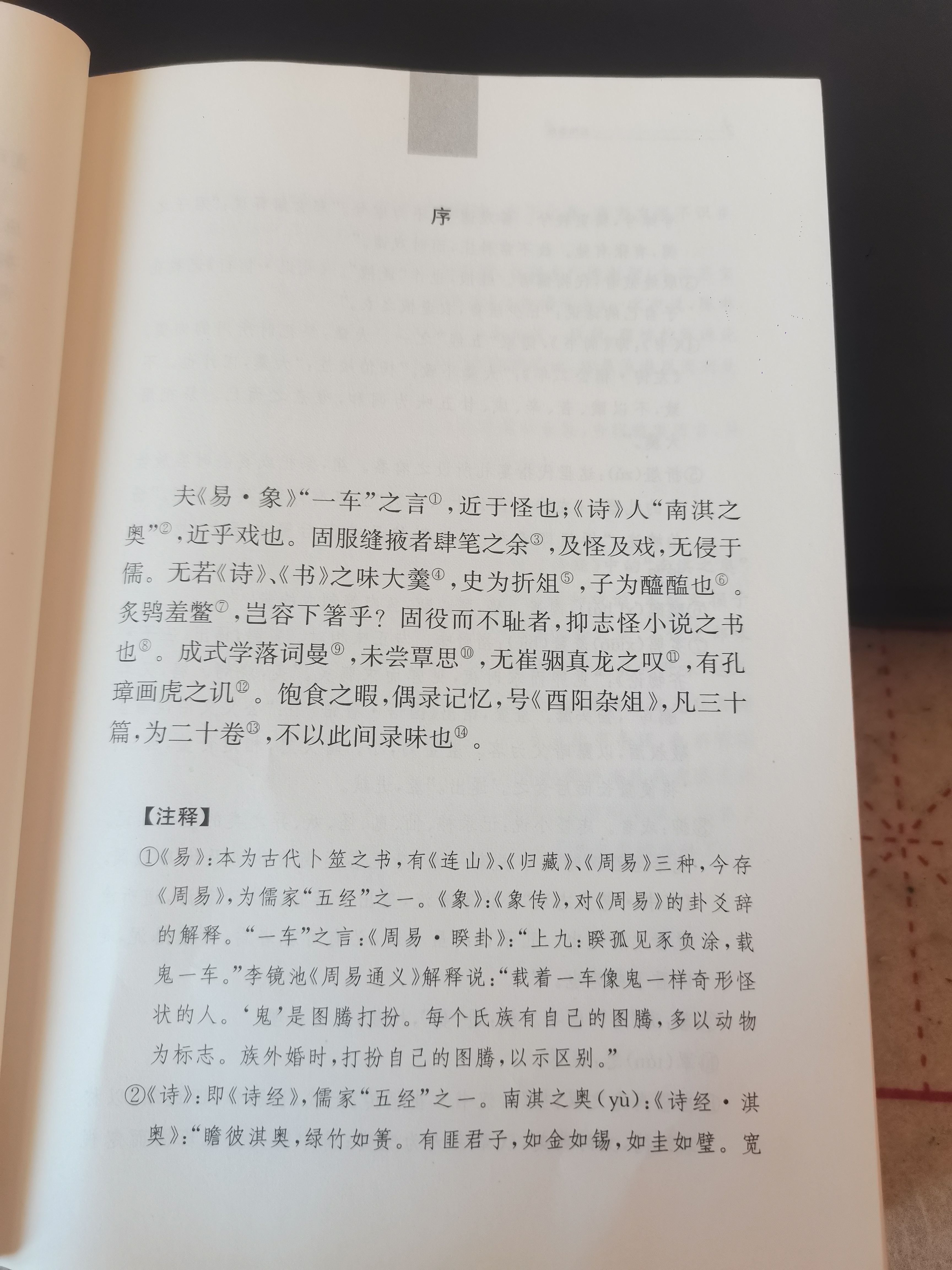 《酉阳杂俎》序: 夫《易·象》"一车"之言,近于怪也;《诗》人"南淇之奥",近乎戏也。固服缝掖者肆笔之余,及怪及戏,无侵于儒。无若《诗》、《书》之味大羹,史为折俎,子为醯醢也。炙鸮羞鳖,岂容下箸乎?固役而不耻者,抑志怪小说之书也。成式学落词曼,未尝覃思,无崔驱真龙之叹,有孔璋画虎之讥。饱食之暇,偶录记忆,号《酉阳杂俎》,凡三十篇,为二十卷,不以此间录味也。 【译文】 《周易·象传》"载鬼一车"的话,近于怪诞;《诗经》中的"南淇之奥"一诗,近于戏谑。儒士在著书立说之余,笔涉怪诞和戏谑,本就无损于儒道。本书不像《诗经》、《尚书》等经部之作那样味如大羹,不像史部味如肴烝,也不像子部味如肉酱。这部书就如炙鸮羞鳖之类的野味,达人君子岂肯动筷子?我之所以执着于此,不以为耻,或许因为这是独具特色的志怪小说之书吧。本人所学,杂乱无章,表达没有条理,也不曾深入思考,不像崔骃那样具有真才实学,只会如陈琳那样招致画虎类犬的嘲笑。饱食之余,偶尔抄录所记怪异之事,命名为《酉阳杂俎》,总共三十篇,编为二十卷,这本书里就不记录那些大羹、肴烝之类的正味了。