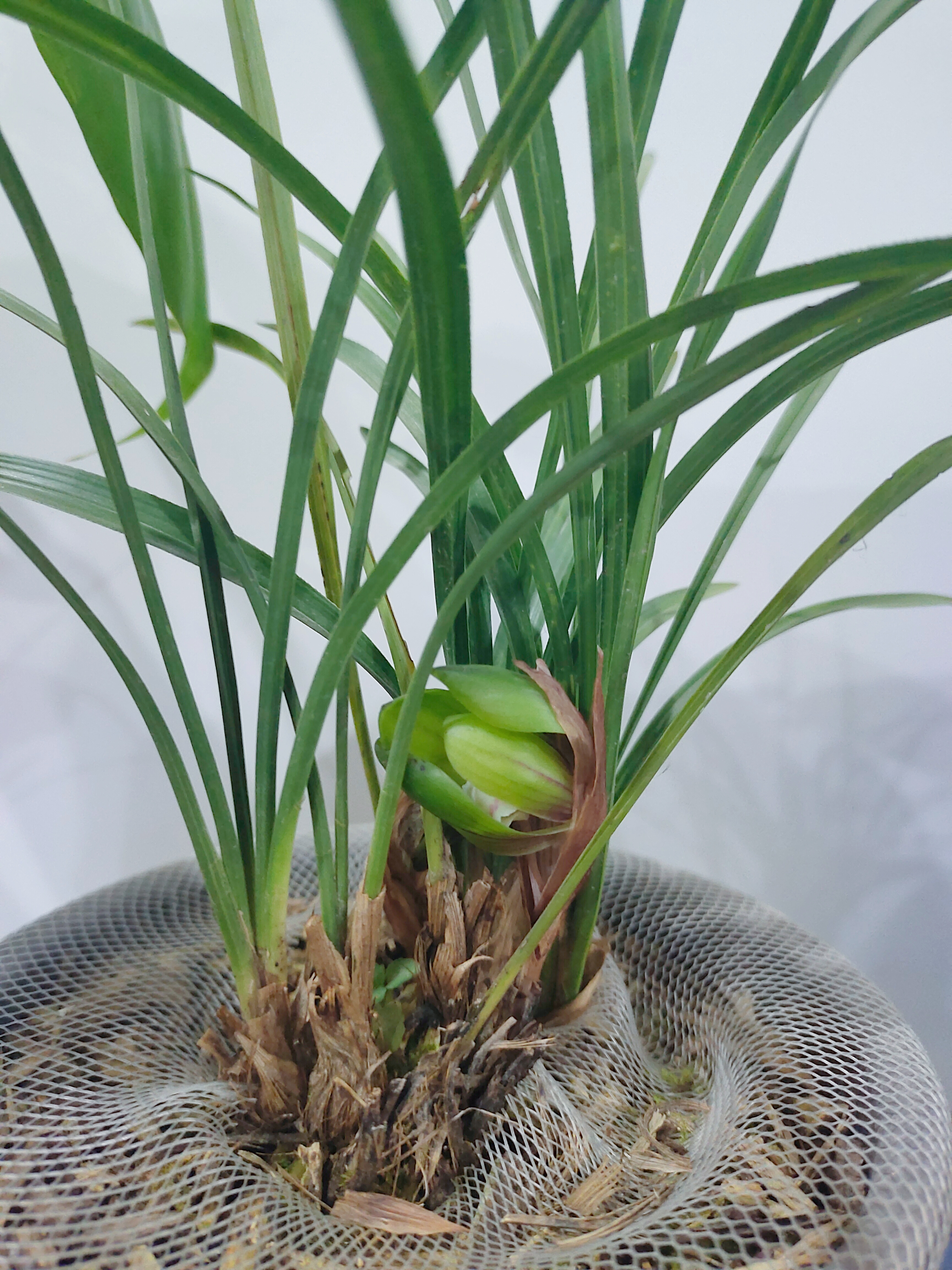窗台边的兰花又冒新花苞啦,网状盆里根系舒展,绿叶在自然光下透着生机,静静等它开花。
