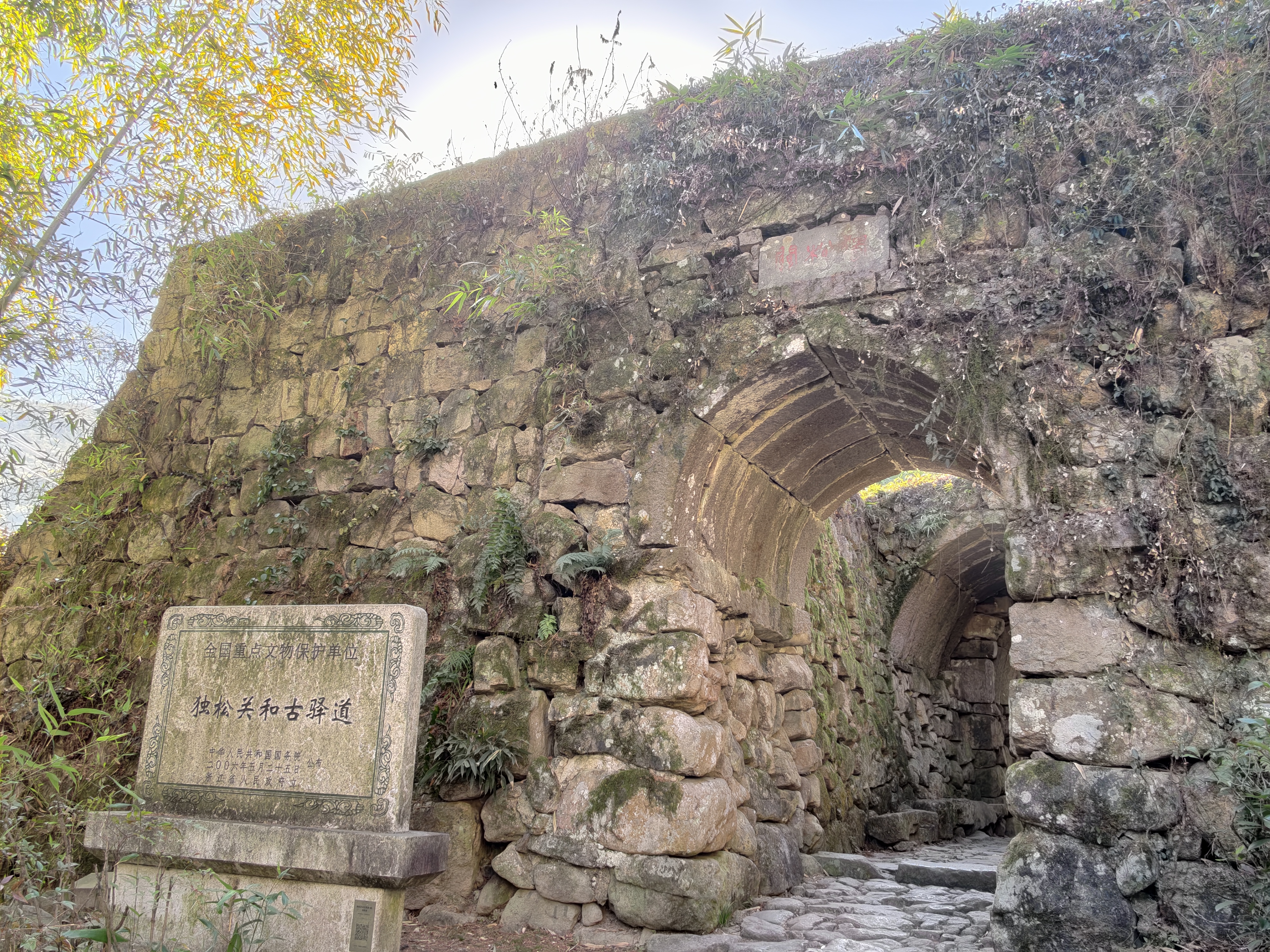 那日与朋友们一起去了独松关,独松关是中国古代临安(今浙江杭州)西北重要关隘,位于浙江省安吉县递铺镇双溪口关上村独松岭,东西连接山崖,南北有峡谷相通,系临安经广德通往南京的咽喉要道。南宋建炎年间(1127~1130年)垒石筑关抵御金兵,与幽岭关、百丈关并称“独松三关”,独松关被列为第六批全国重点文物保护单位。 关隘南面独松岭因曾有一棵独松而得名,现存门洞深10米、宽不足1米,顶部设天窗兼具采光与防御功能。