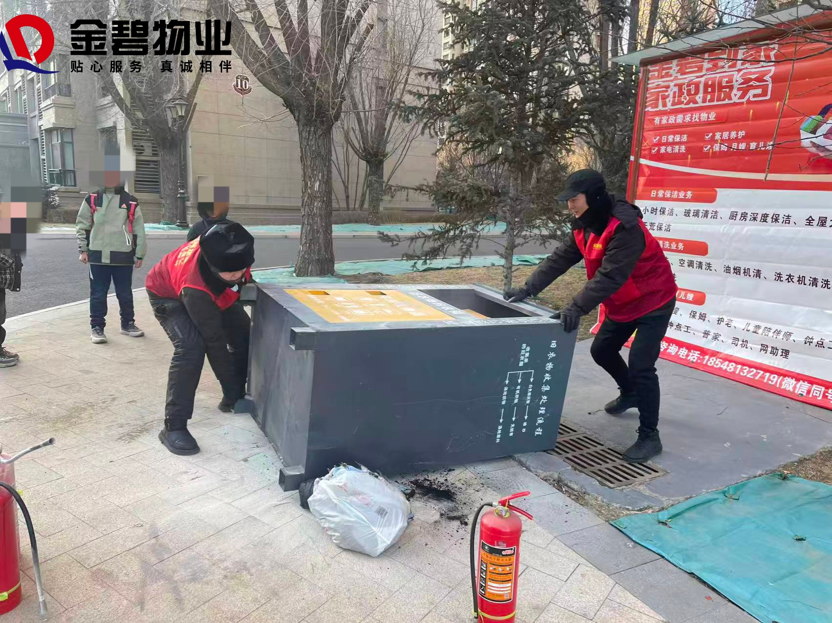冬日小区,落叶铺地,物业小哥穿着红色马甲清运垃圾,保洁阿姨默默擦着消防器材。贴心服务,就在身边。