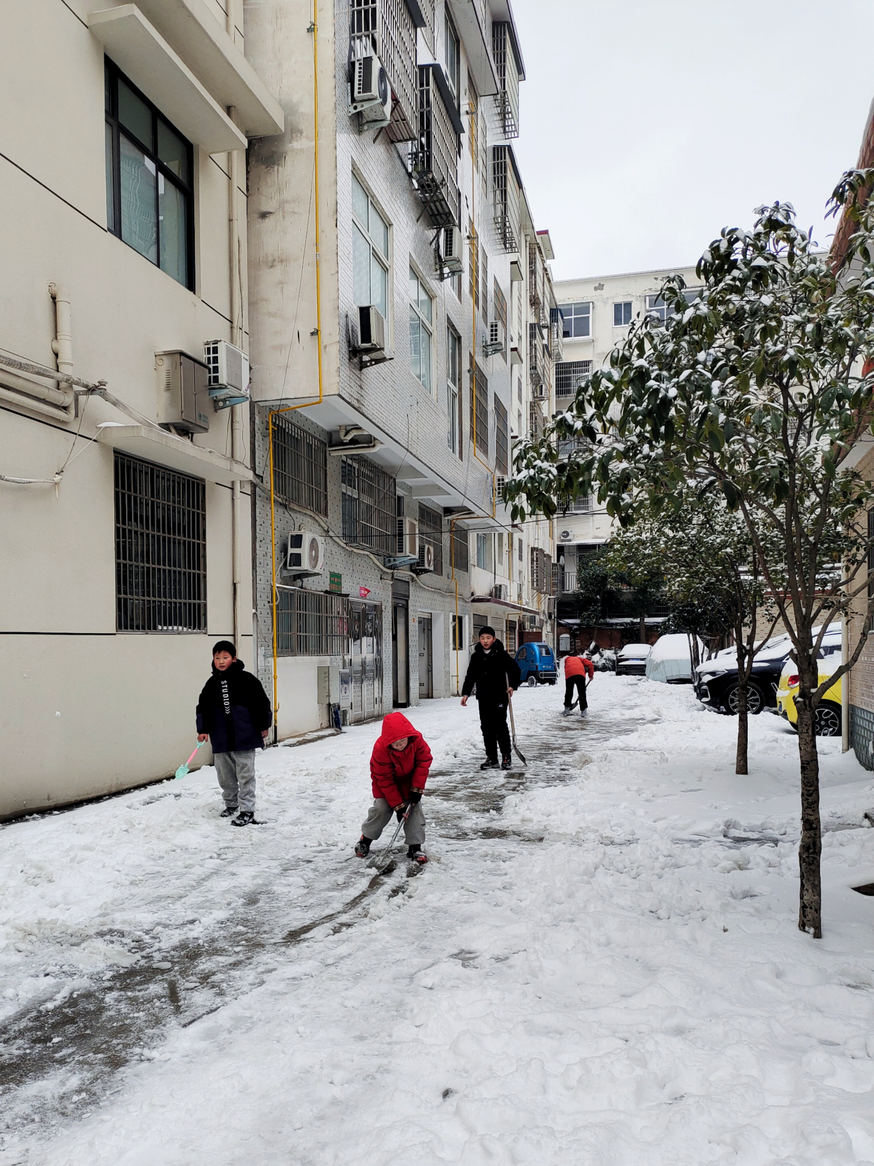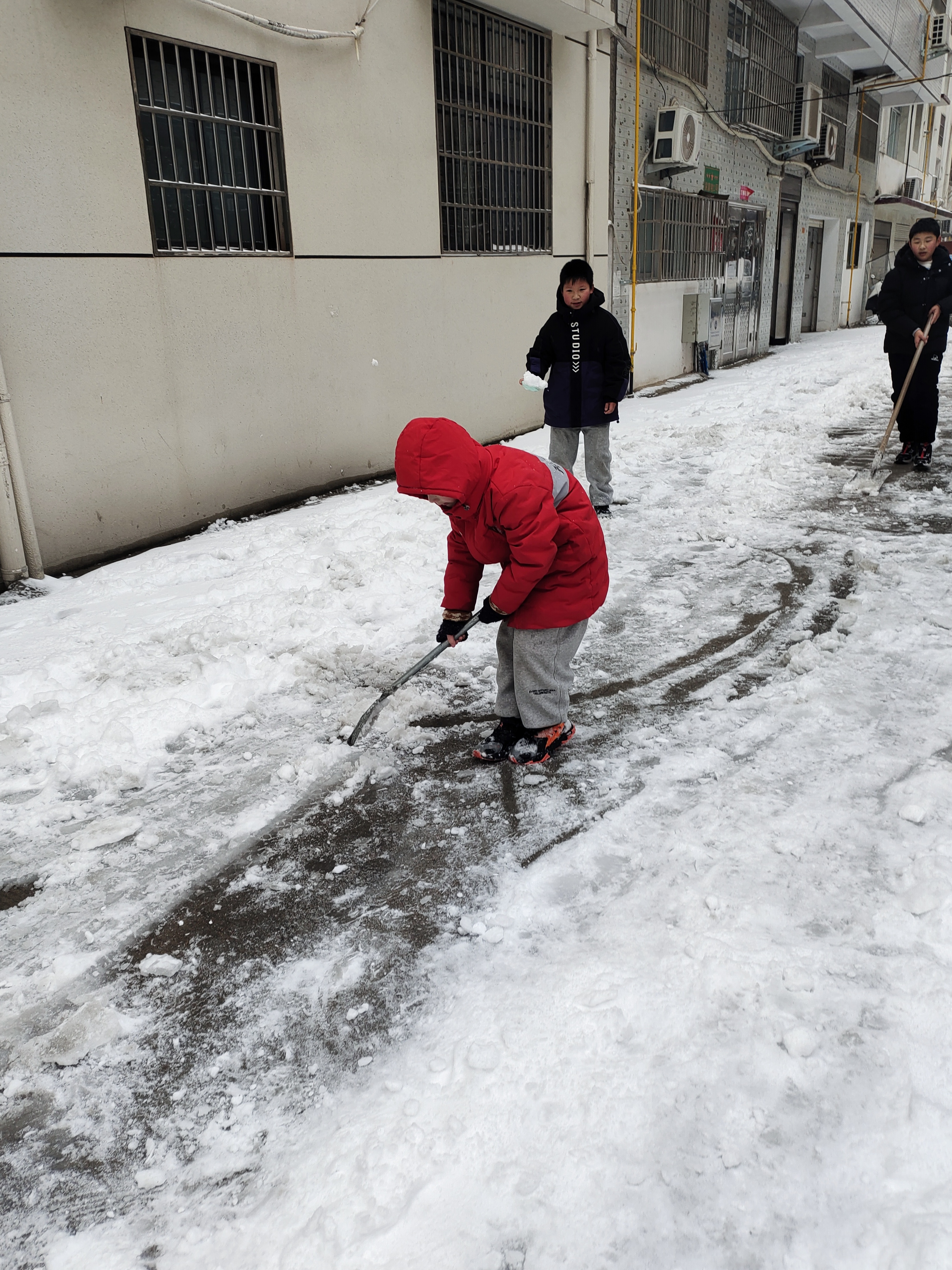 小朋友也参与了铲雪队伍,大家齐心协力,没有办不成的事