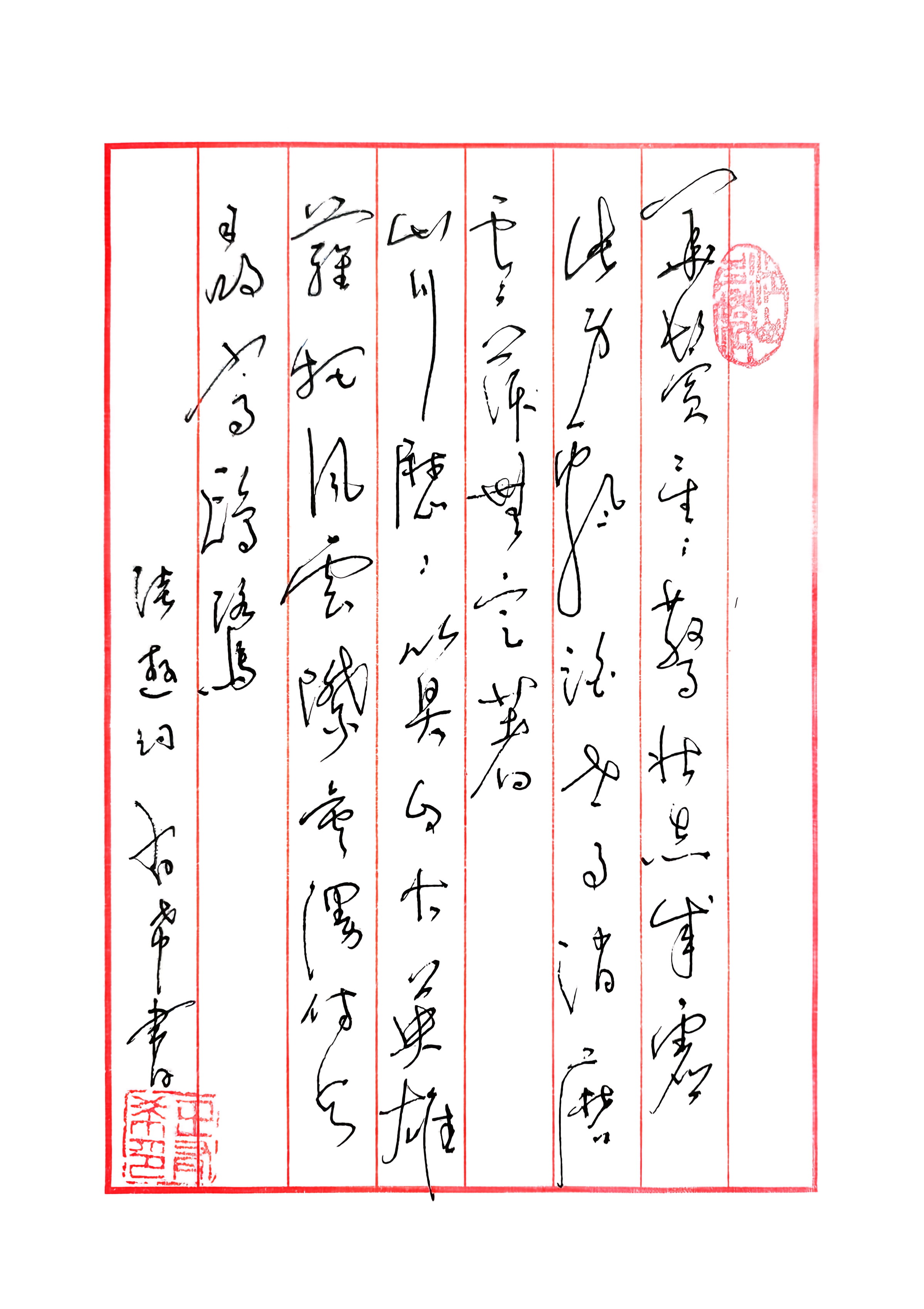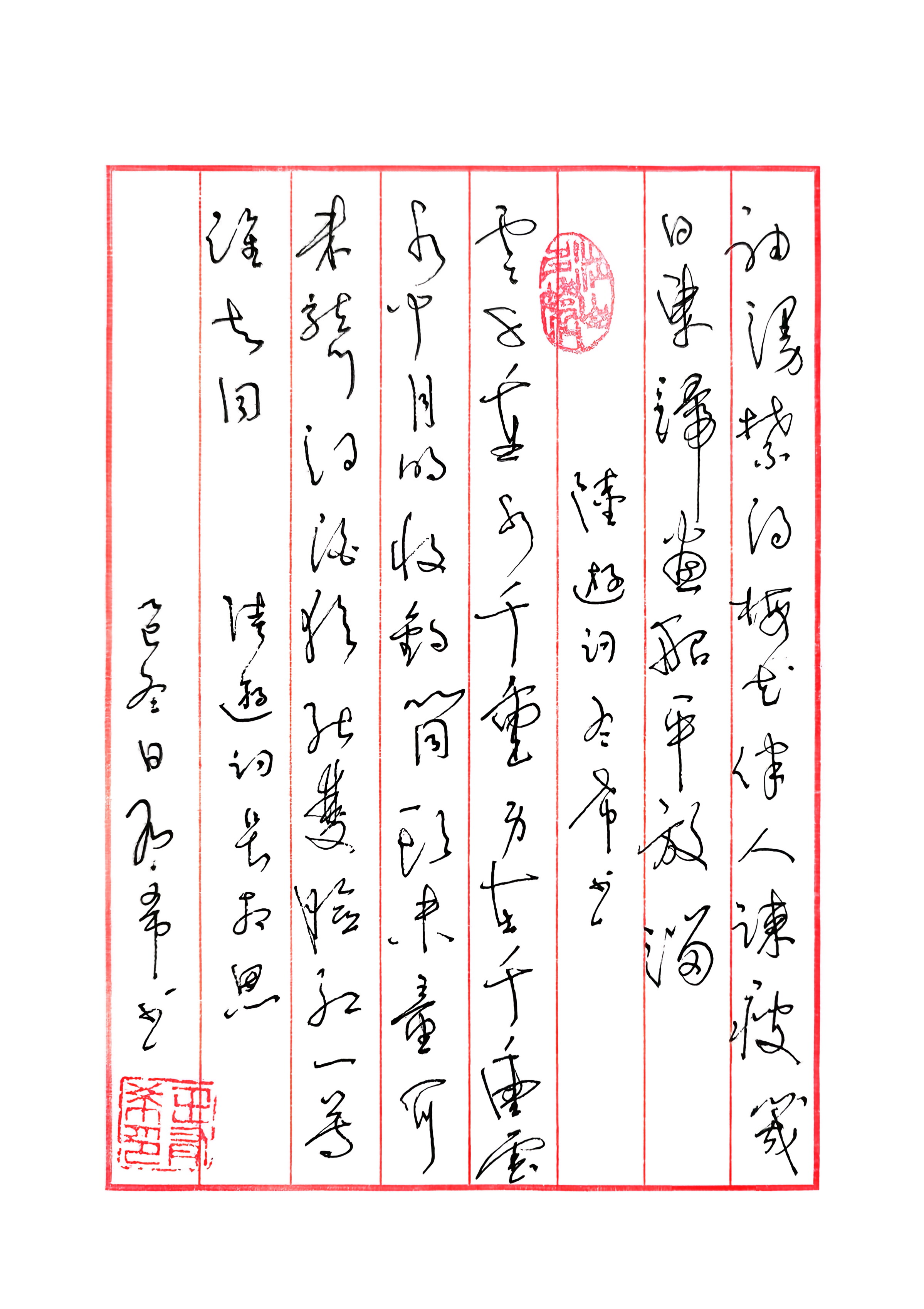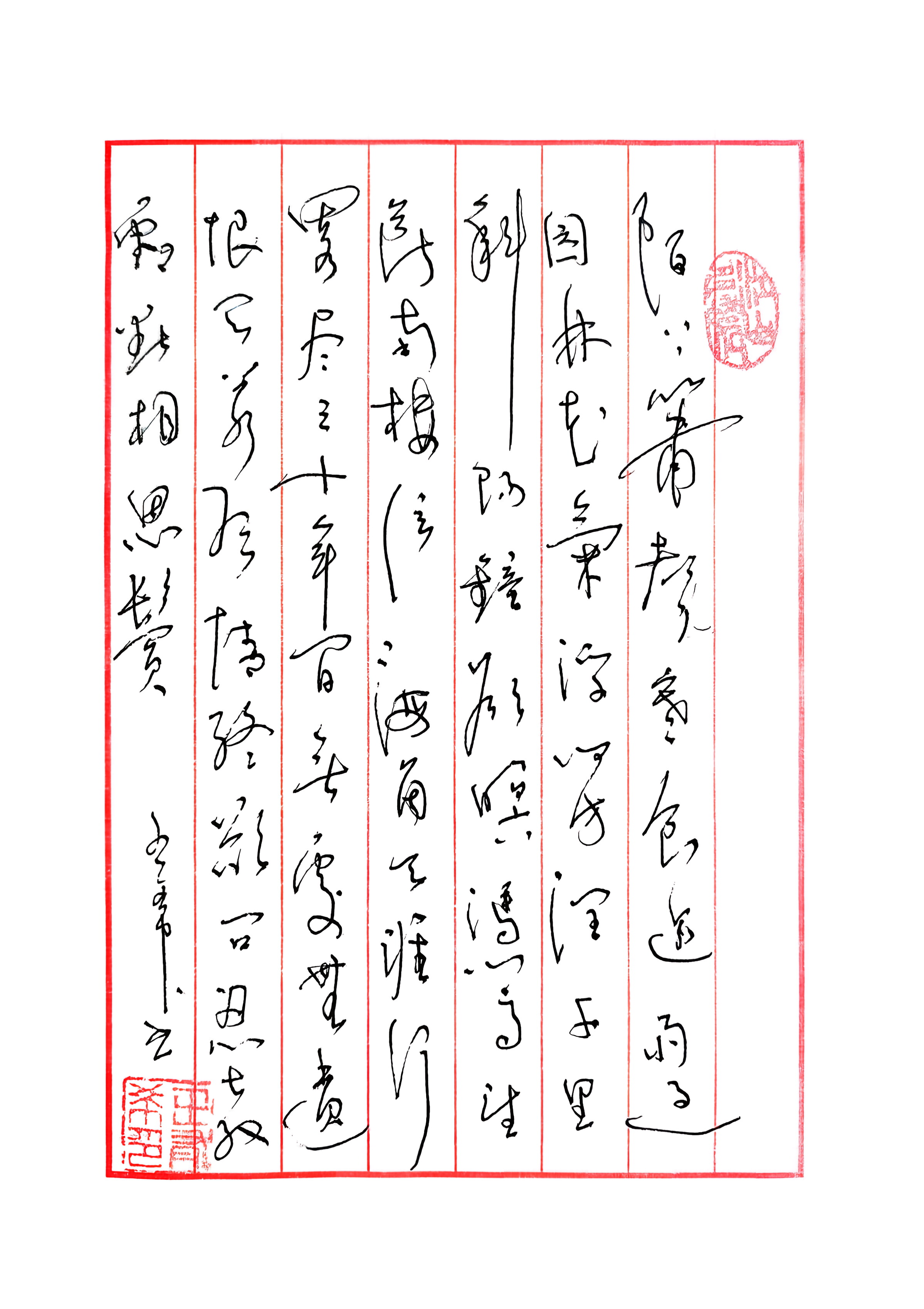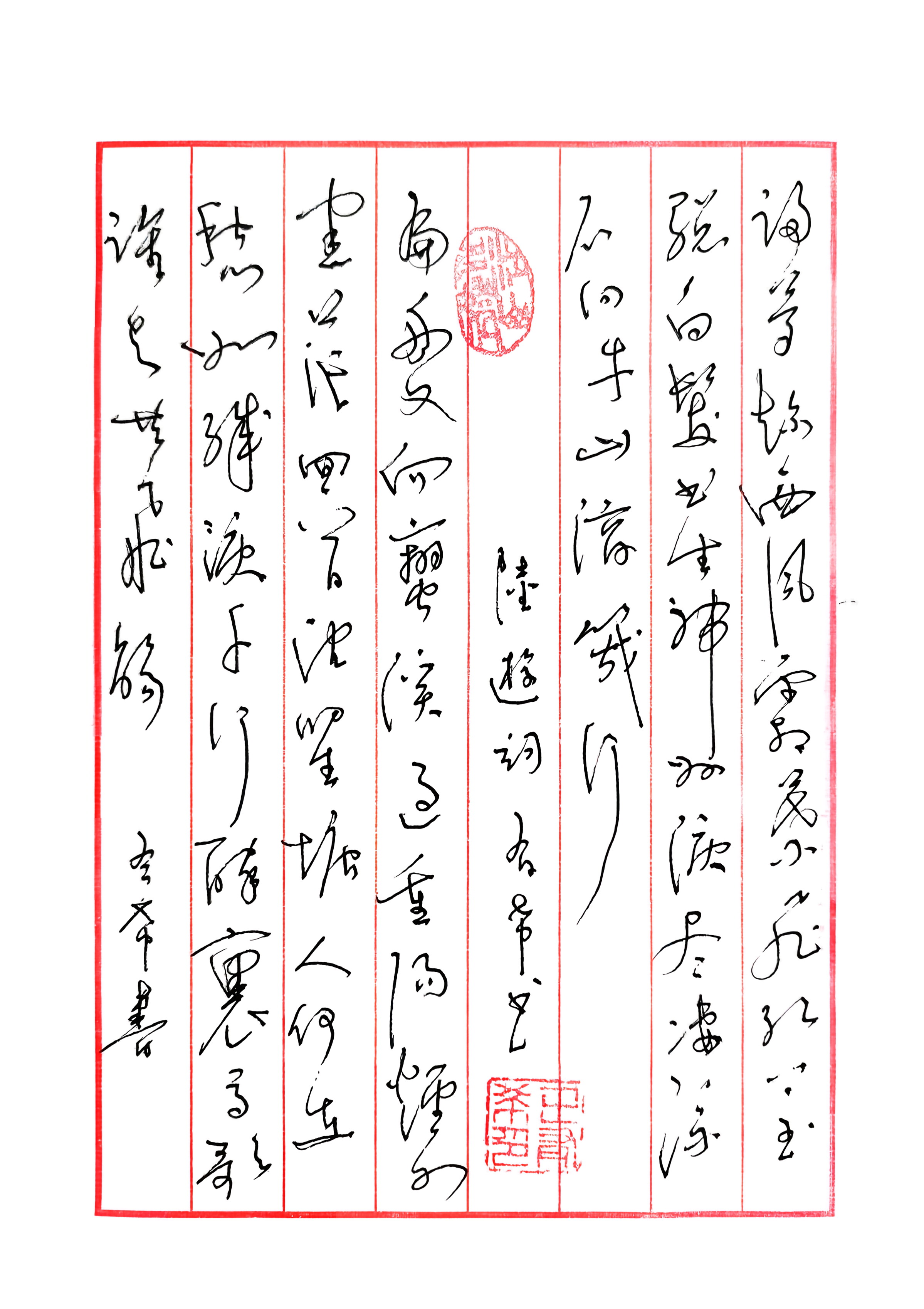 陆游旅行词书法作品赏析 这组硬笔草书作品,整体呈现出流畅奔放、意韵悠长的艺术特点。 1. 笔法与线条 - 灵动流畅:行笔迅捷连贯,线条粗细变化自然。比如“云千重”“水千重”等连绵书写,体现了草书“流而不滑”的节奏感。 - 提按分明:起笔处常有尖锐的切入,收笔时偶带飞白,让线条既有飘逸感,又不失骨力。例如“霜点相思鬓”的“霜”字,转折处的顿笔清晰可见。 - 墨韵层次:虽为硬笔书写,但通过控制行笔速度和力度,营造出浓淡、枯湿的变化,让单字和整幅作品都富有呼吸感。 2. 结体与布局 - 疏密有致:字形大小错落,如“归梦寄吴樯”的“樯”字舒展开阔,而“愁鬓点新霜”的“霜”字紧凑内敛,形成视觉上的张弛对比。 - 行气贯通:字与字之间多以牵丝相连,如“海角天涯行略尽”一句,笔画连绵不绝,让整行字如行云流水般一气呵成。 - 章法协调:红格纸的框架下,字距与行距保持着和谐的节奏,印章的点缀也恰到好处,让整幅作品在规整中不失灵动。 3. 气韵与情感 - 文墨交融:书写内容是陆游的羁旅词,书法风格也贴合了原作沉郁又疏放的情感。比如“却恐他乡胜故乡”的悲慨,通过略带涩意的行笔得到了呼应。 - 个人风格:整体风格偏向“二王”一脉的潇洒,又融入了现代硬笔的爽利,既有传统草书的法度,又不失当代书写的表现力。 4. 细节亮点 - 呼应内容:在《长相思·云千重》《蝶恋花·离小益作》等篇章中,书写节奏与词的韵律感高度契合,让文字的声律美与书法的线条美相得益彰。 - 落款与用印:落款小字与正文风格统一,印章的红色与红格纸形成呼应,提升了作品的完整性和专业感。