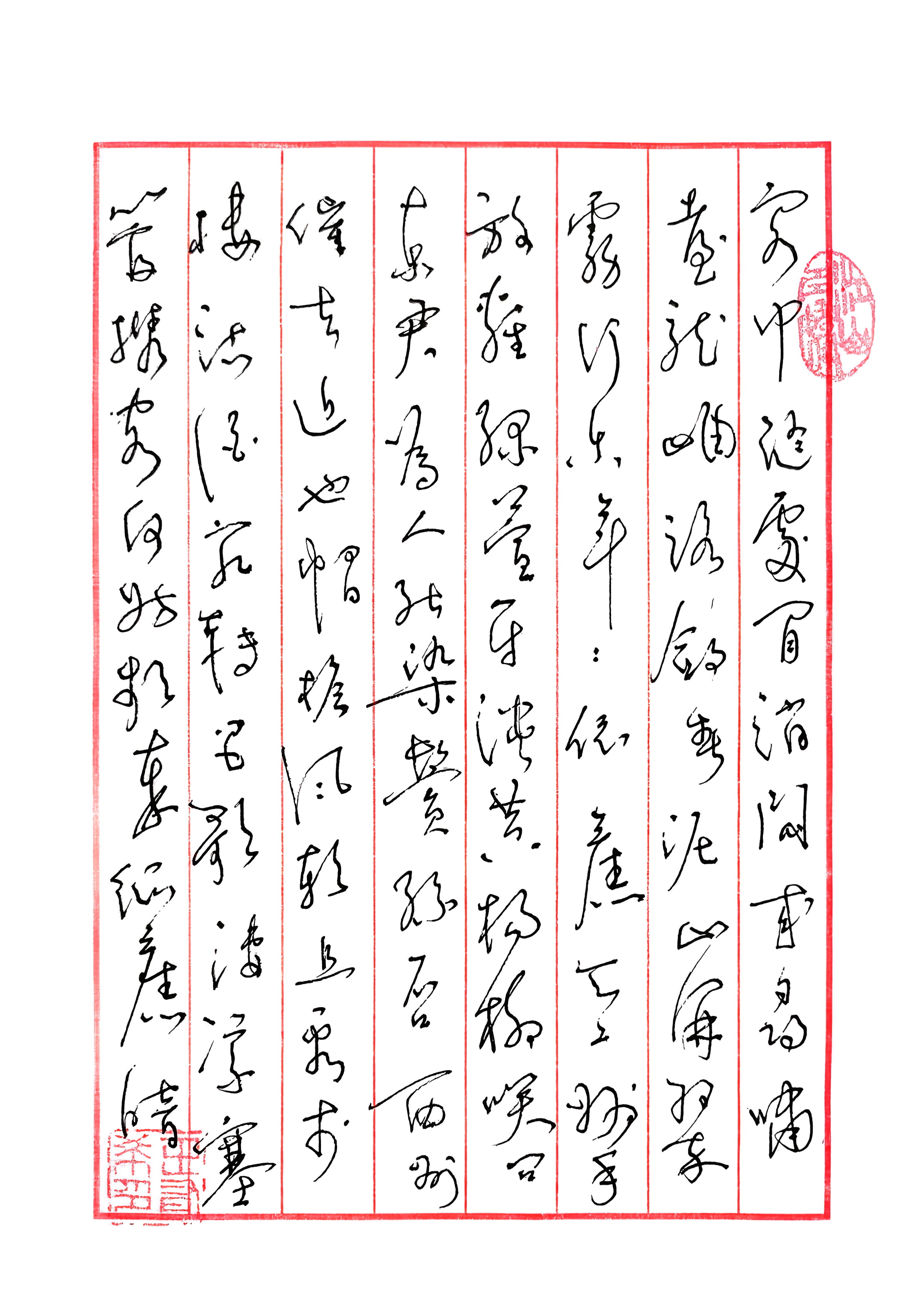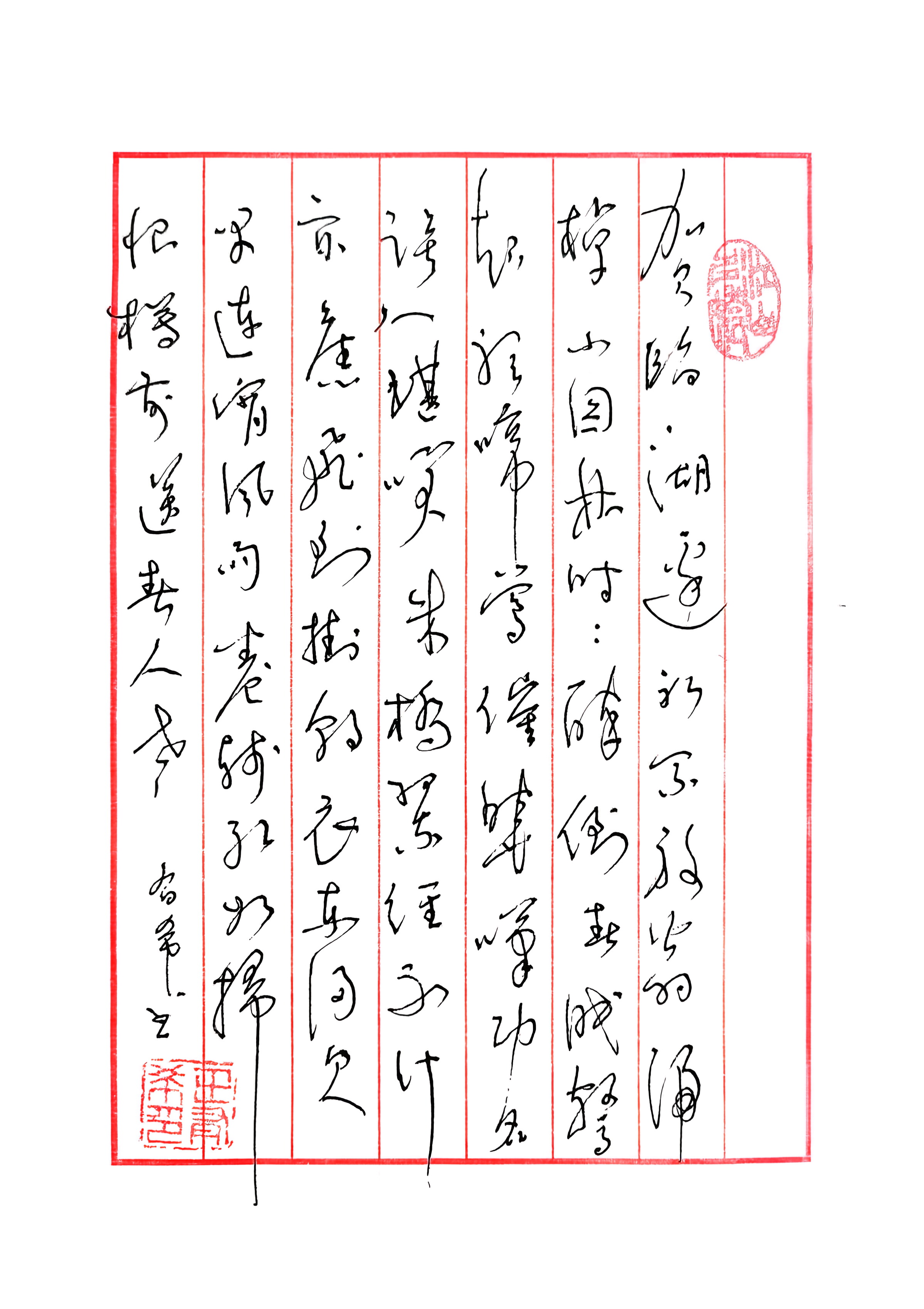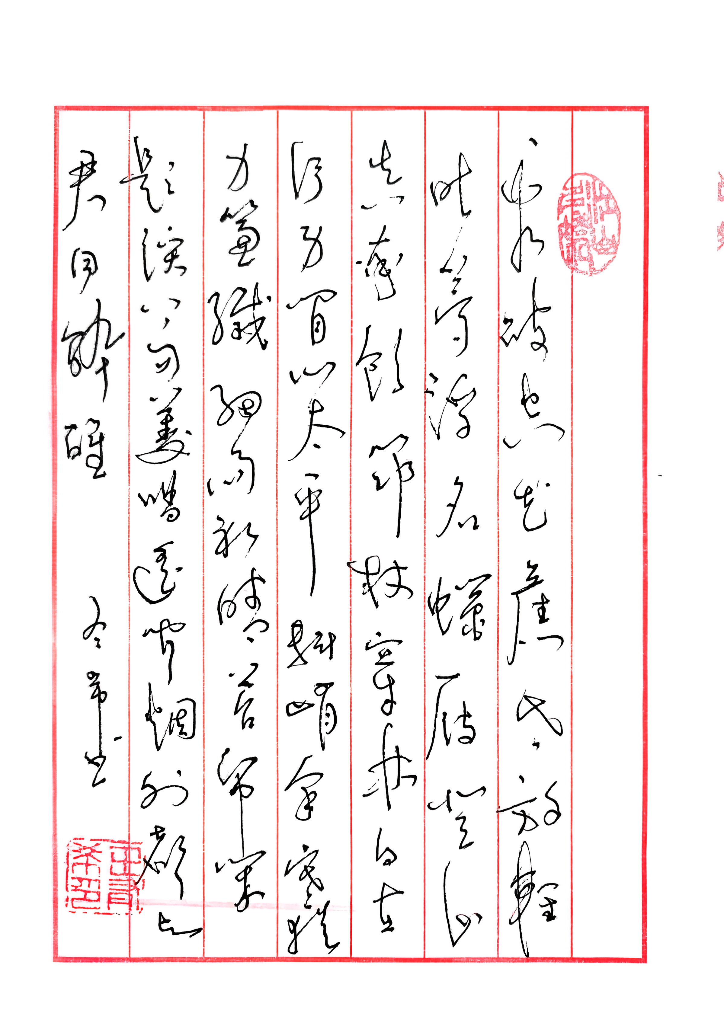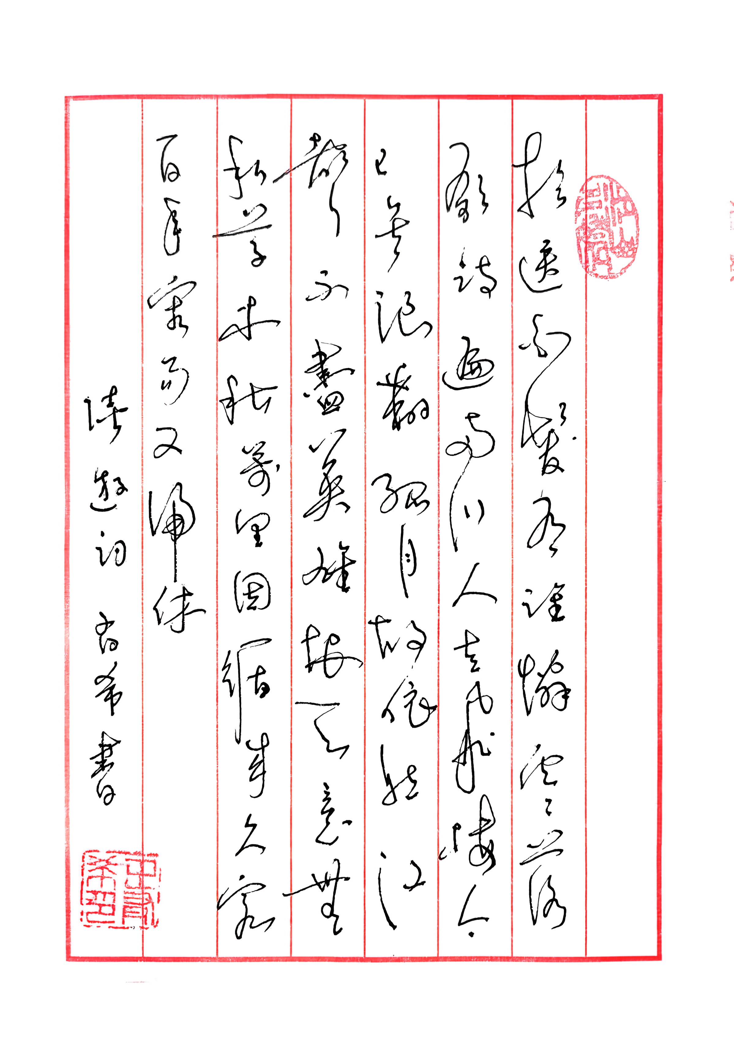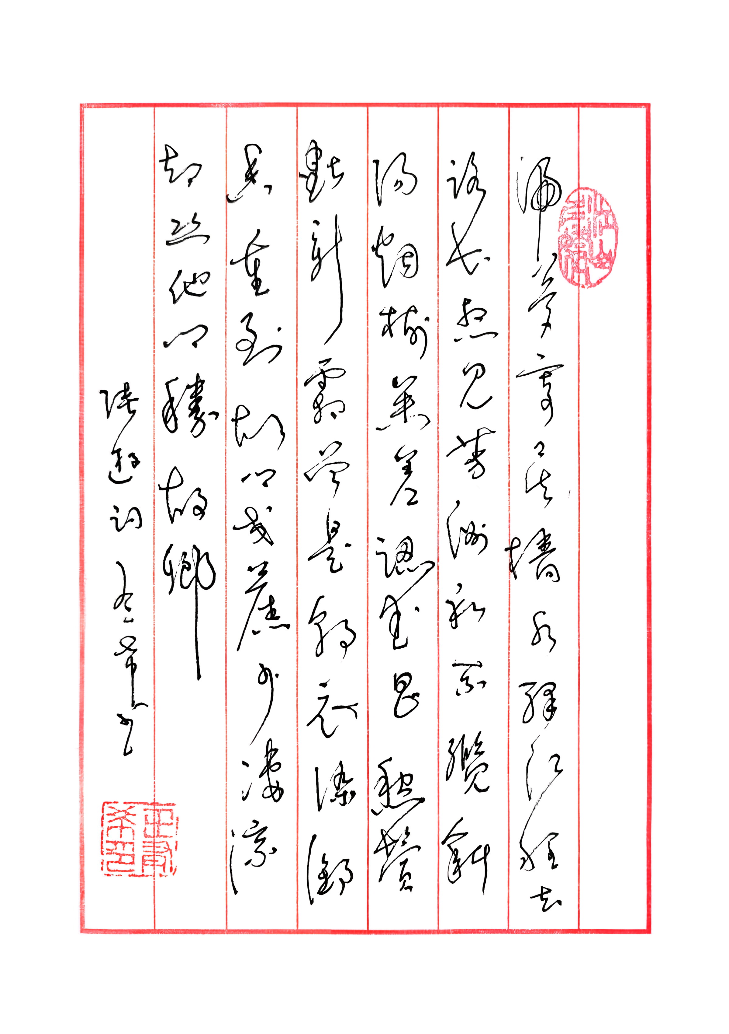 陆游旅行词书法作品赏析 这组硬笔草书作品,整体呈现出流畅奔放、意韵悠长的艺术特点。 1. 笔法与线条 - 灵动流畅:行笔迅捷连贯,线条粗细变化自然。比如“云千重”“水千重”等连绵书写,体现了草书“流而不滑”的节奏感。 - 提按分明:起笔处常有尖锐的切入,收笔时偶带飞白,让线条既有飘逸感,又不失骨力。例如“霜点相思鬓”的“霜”字,转折处的顿笔清晰可见。 - 墨韵层次:虽为硬笔书写,但通过控制行笔速度和力度,营造出浓淡、枯湿的变化,让单字和整幅作品都富有呼吸感。 2. 结体与布局 - 疏密有致:字形大小错落,如“归梦寄吴樯”的“樯”字舒展开阔,而“愁鬓点新霜”的“霜”字紧凑内敛,形成视觉上的张弛对比。 - 行气贯通:字与字之间多以牵丝相连,如“海角天涯行略尽”一句,笔画连绵不绝,让整行字如行云流水般一气呵成。 - 章法协调:红格纸的框架下,字距与行距保持着和谐的节奏,印章的点缀也恰到好处,让整幅作品在规整中不失灵动。 3. 气韵与情感 - 文墨交融:书写内容是陆游的羁旅词,书法风格也贴合了原作沉郁又疏放的情感。比如“却恐他乡胜故乡”的悲慨,通过略带涩意的行笔得到了呼应。 - 个人风格:整体风格偏向“二王”一脉的潇洒,又融入了现代硬笔的爽利,既有传统草书的法度,又不失当代书写的表现力。 4. 细节亮点 - 呼应内容:在《长相思·云千重》《蝶恋花·离小益作》等篇章中,书写节奏与词的韵律感高度契合,让文字的声律美与书法的线条美相得益彰。 - 落款与用印:落款小字与正文风格统一,印章的红色与红格纸形成呼应,提升了作品的完整性和专业感。