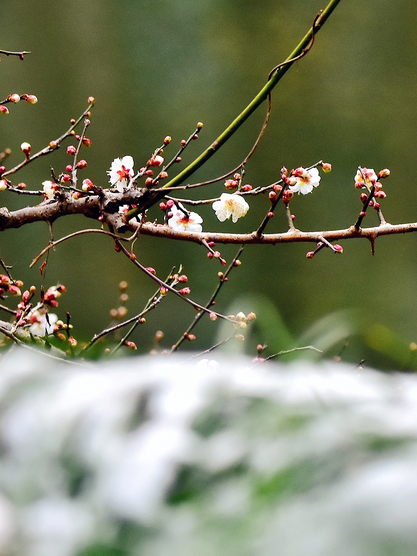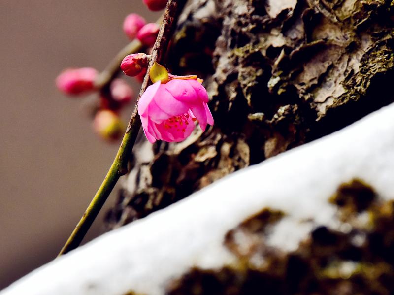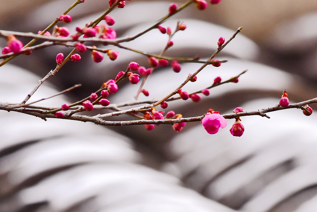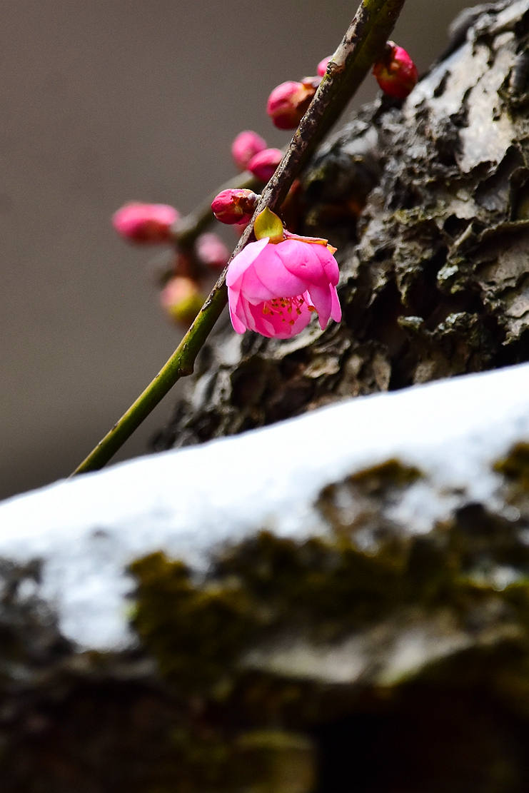 寒梅傲雪——昨日下雪了,今晨到灵峰探梅,漫步梅园,寒风阵阵,屋顶上、树干上都有积雪。红梅、白梅、蜡梅不畏凌寒,正顽强地开放,在白雪的衬托下,更显得坚韧艳丽。摄于1月22日。