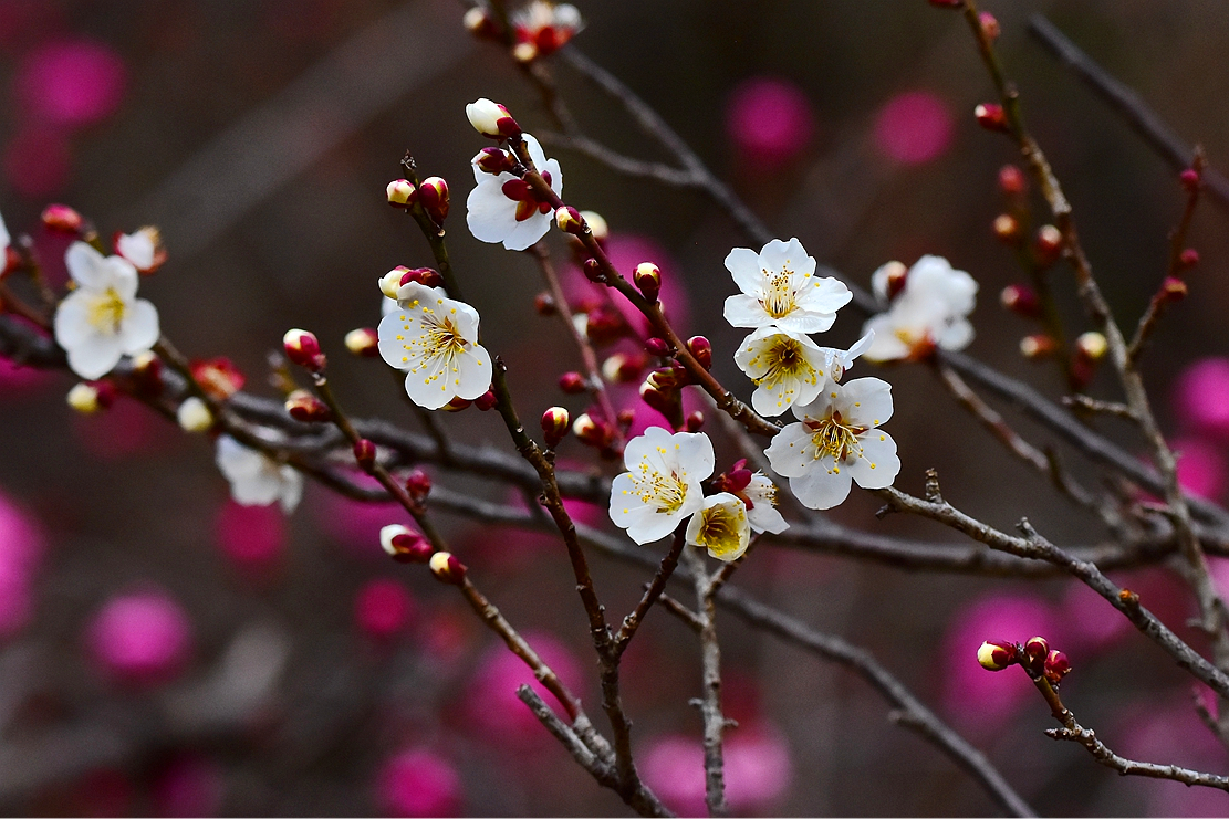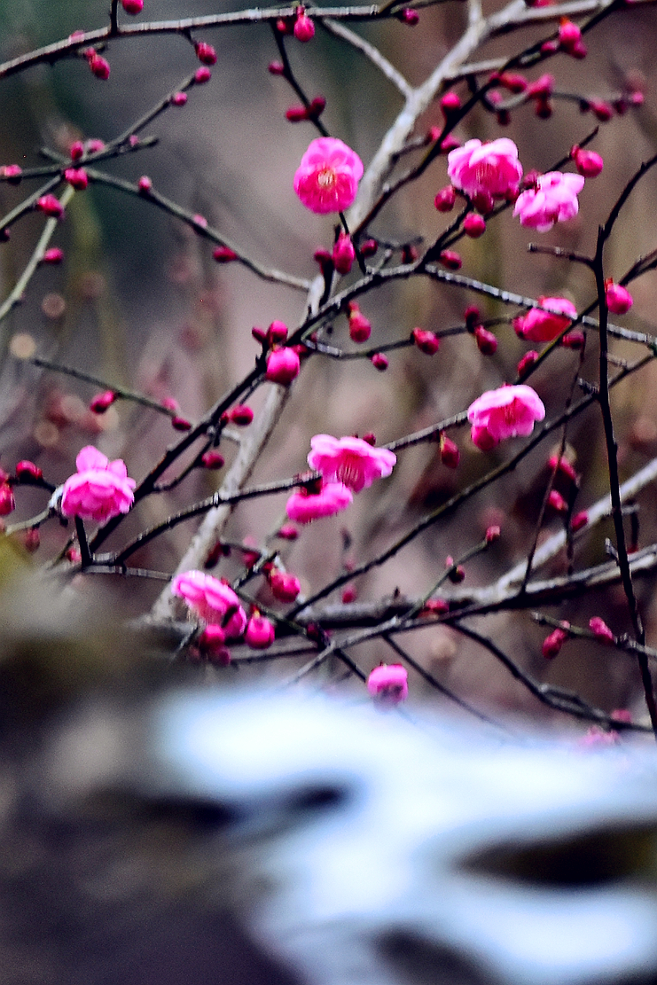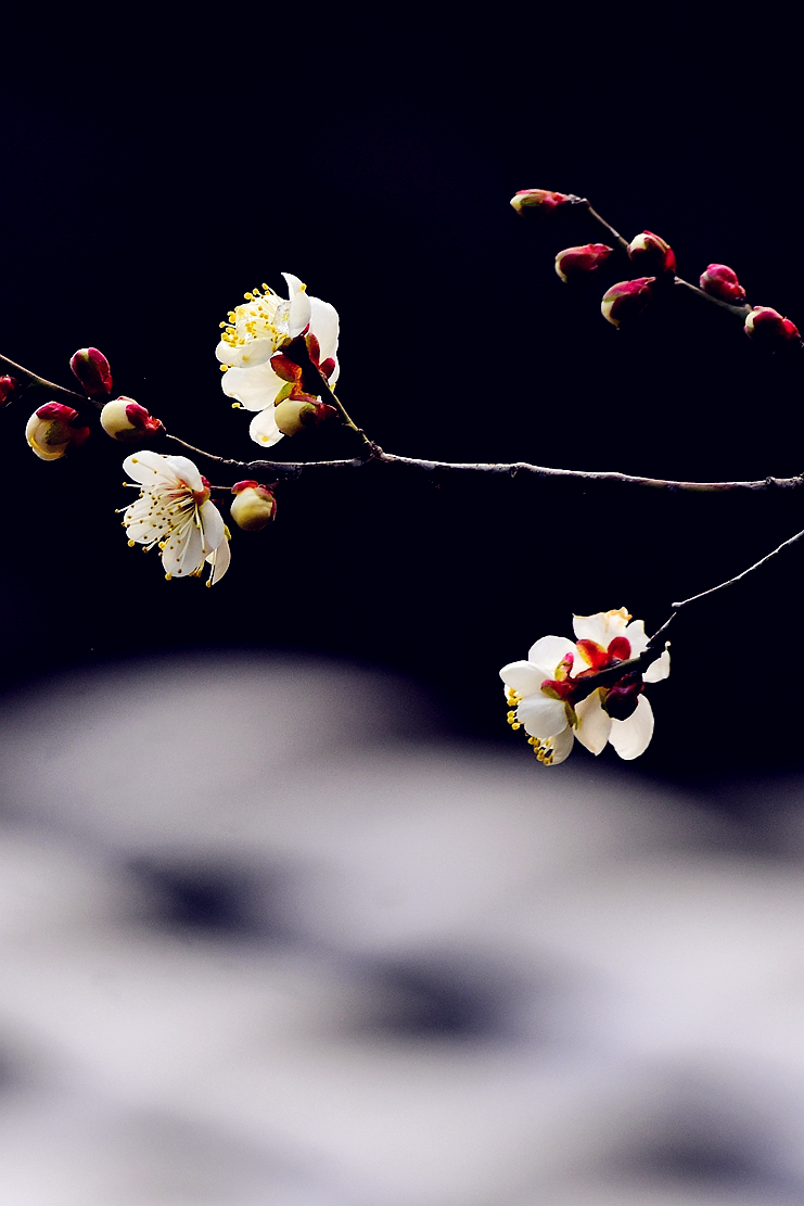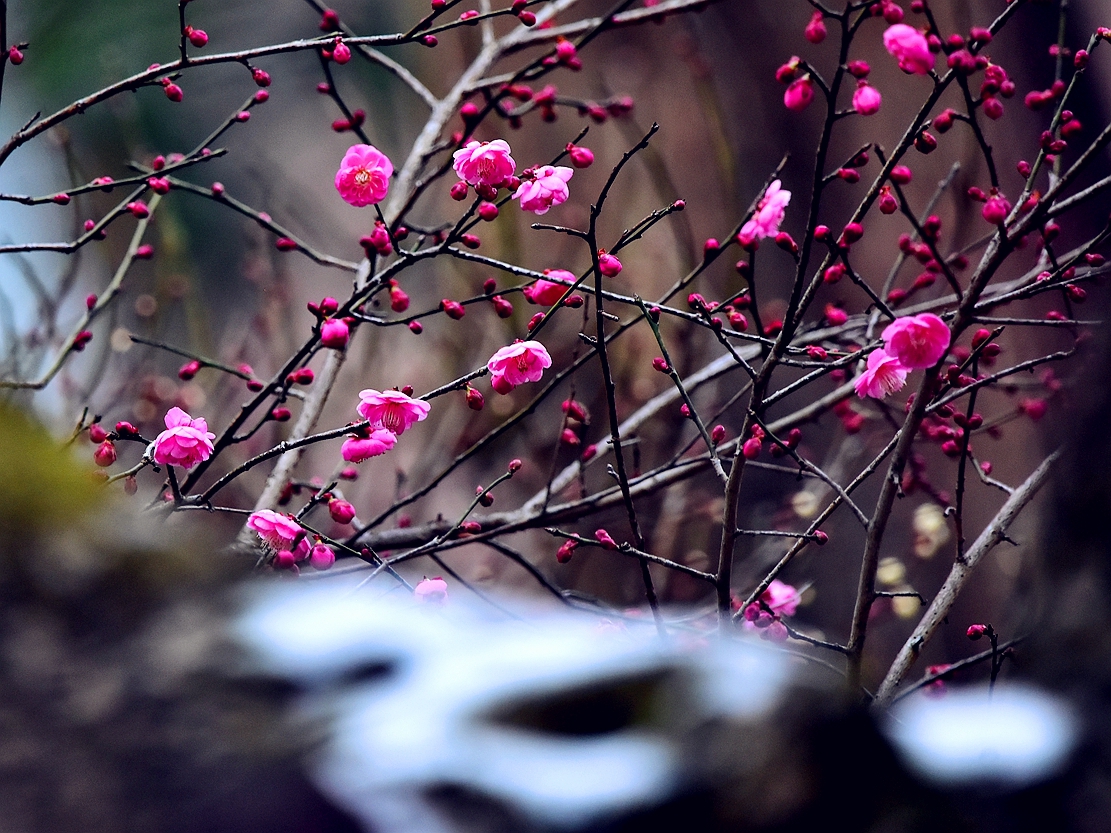 寒梅傲雪——昨日下雪了,今晨到灵峰探梅,漫步梅园,寒风阵阵,屋顶上、树干上都有积雪。红梅、白梅、蜡梅不畏凌寒,正顽强地开放,在白雪的衬托下,更显得坚韧艳丽。摄于1月22日。