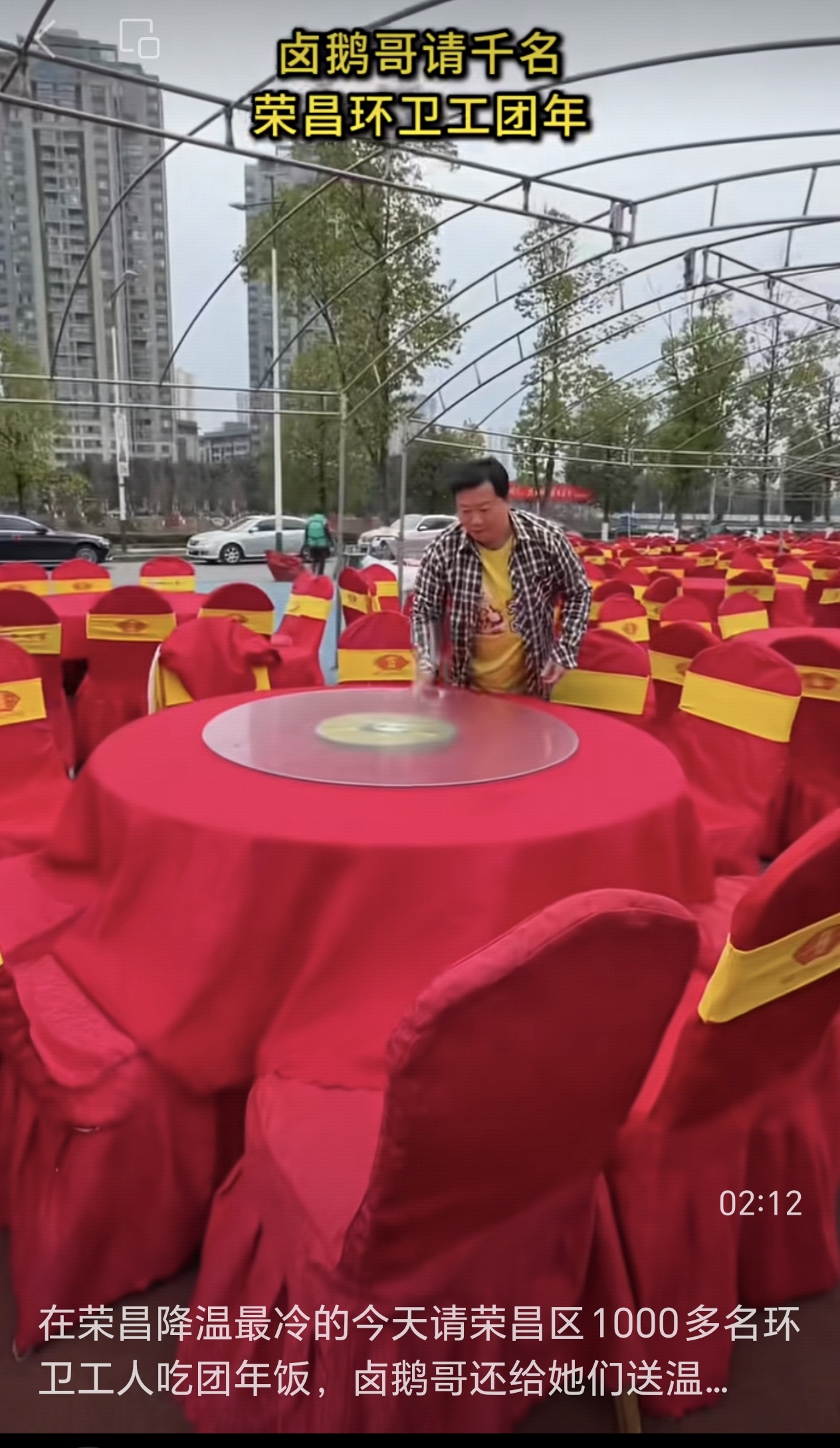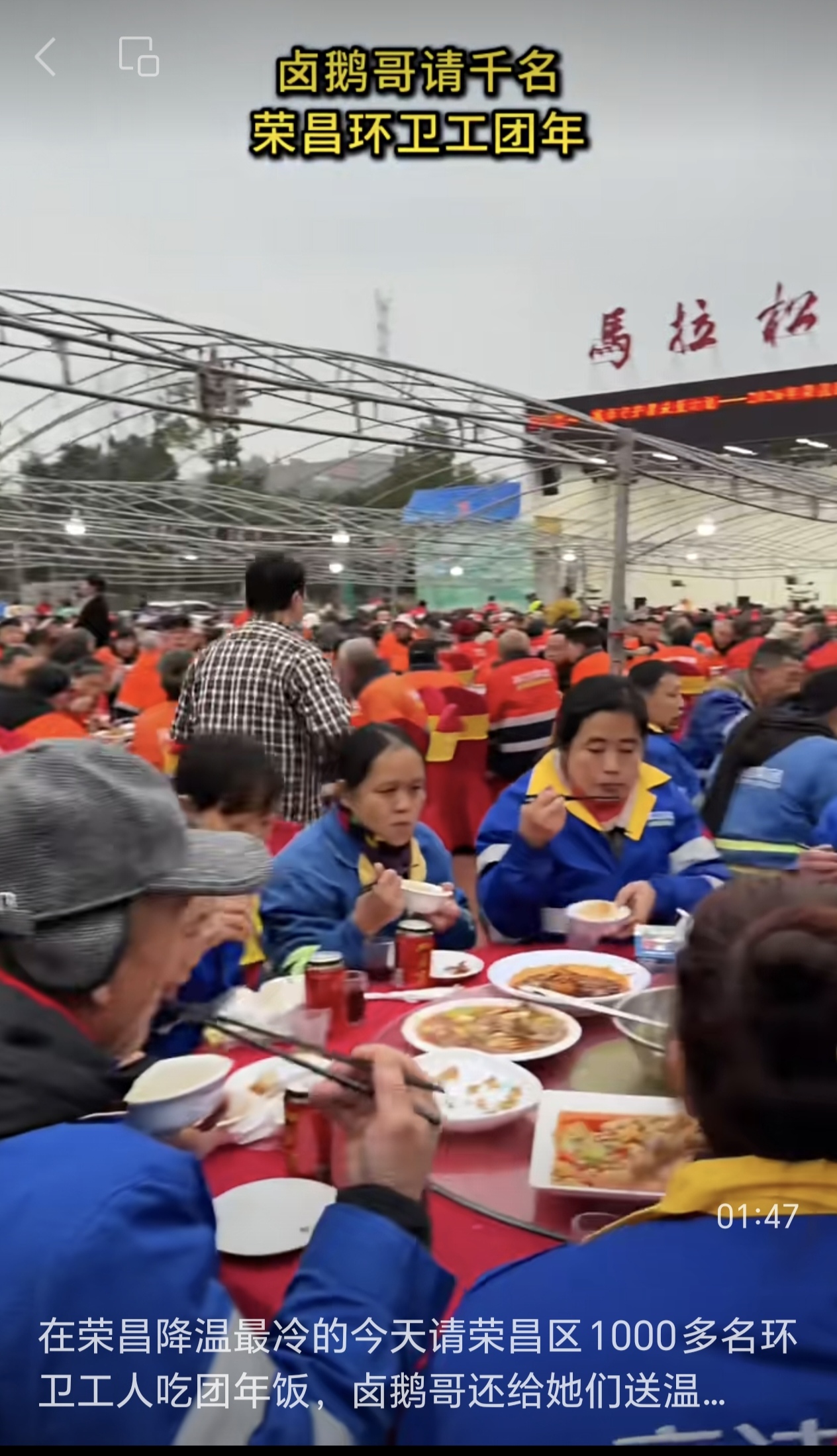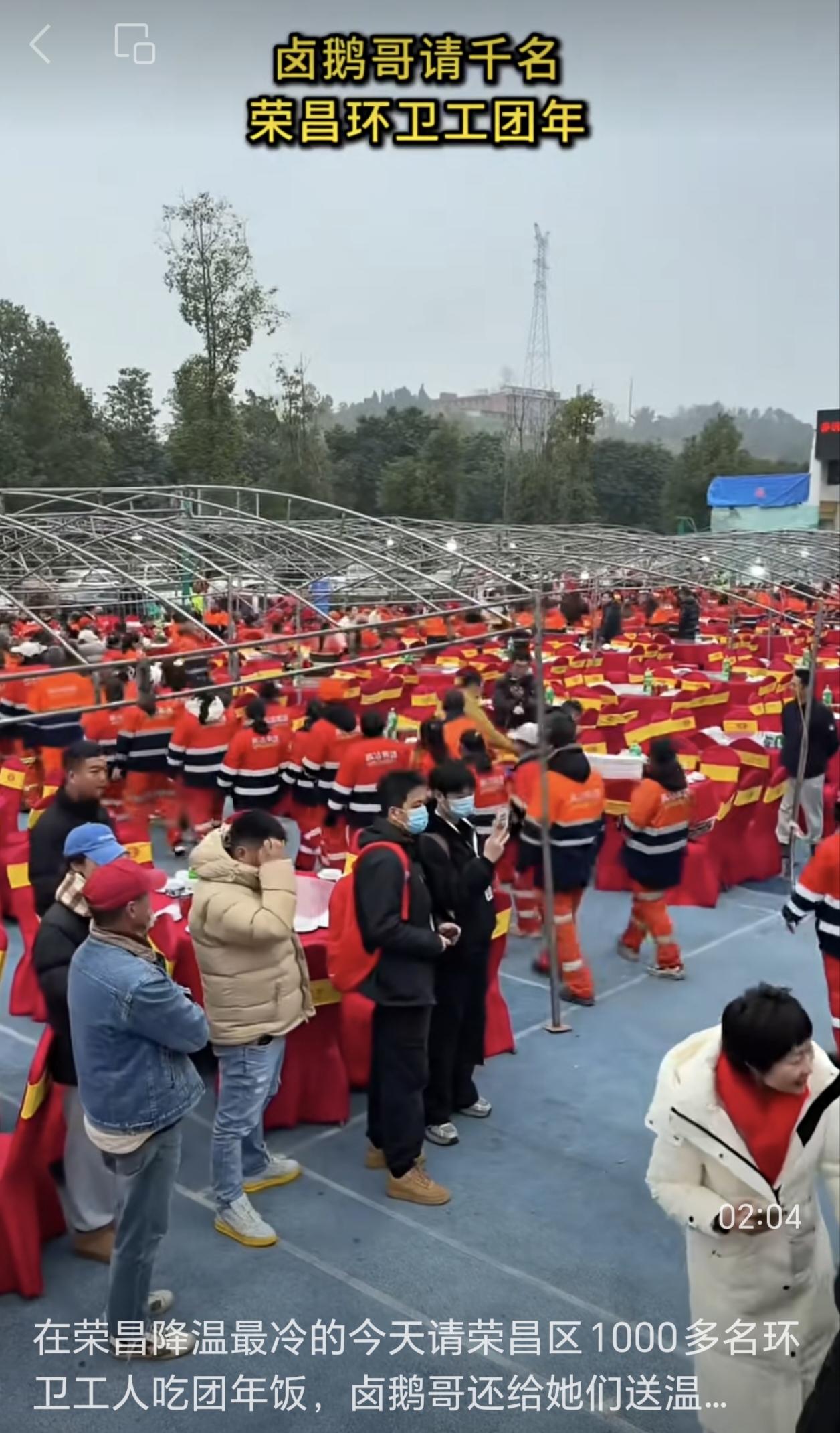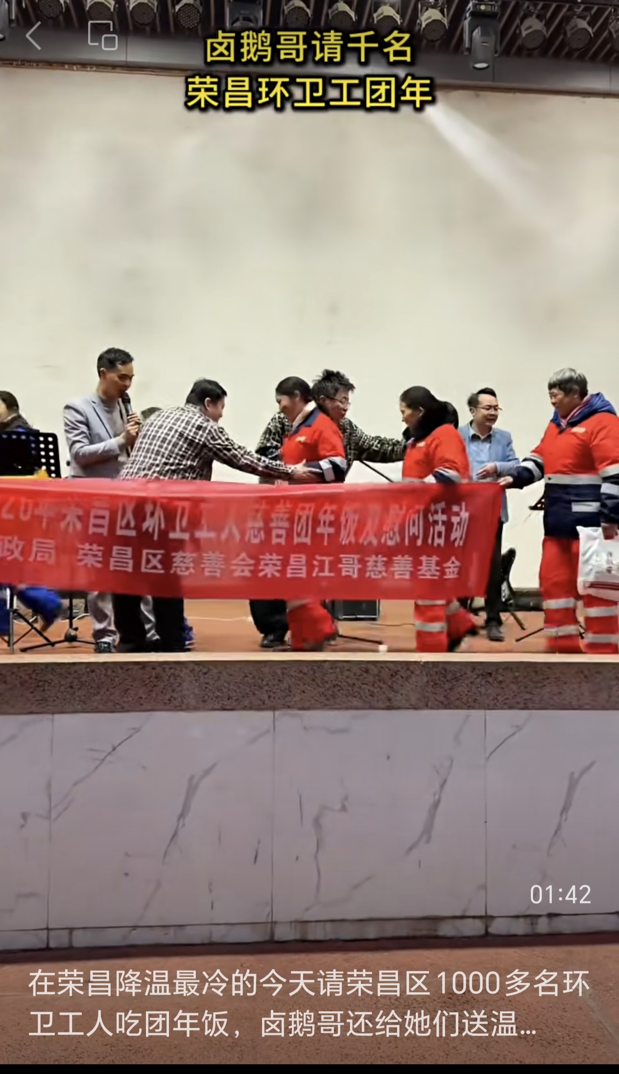 在重庆有一座小城叫荣昌。 在荣昌有一个人叫江哥,也叫卤鹅哥。 他凭一己之力带火了整个荣昌城,让荣昌这座小城在全国有了知名度。让荣昌卤鹅这道美味闻名全国。 他心怀大爱,一边想要带火自己的家乡,一边感恩家乡的父老乡亲。 他体谅环卫工人的辛苦,自掏腰包,宴请全城1200多名环卫工人吃团年宴,给他们送上暖心礼包。 环卫工人是我们城市的美容师,有了他们才有了我们这个城市的干净和美丽。他们起早贪黑,不惧风雨,默默付出。让我们能够拥有更整洁,更美丽的城市。 江哥是一个充满爱心,胸有大爱的人。也欢迎大家到荣昌来打卡,赏非遗,品美食。