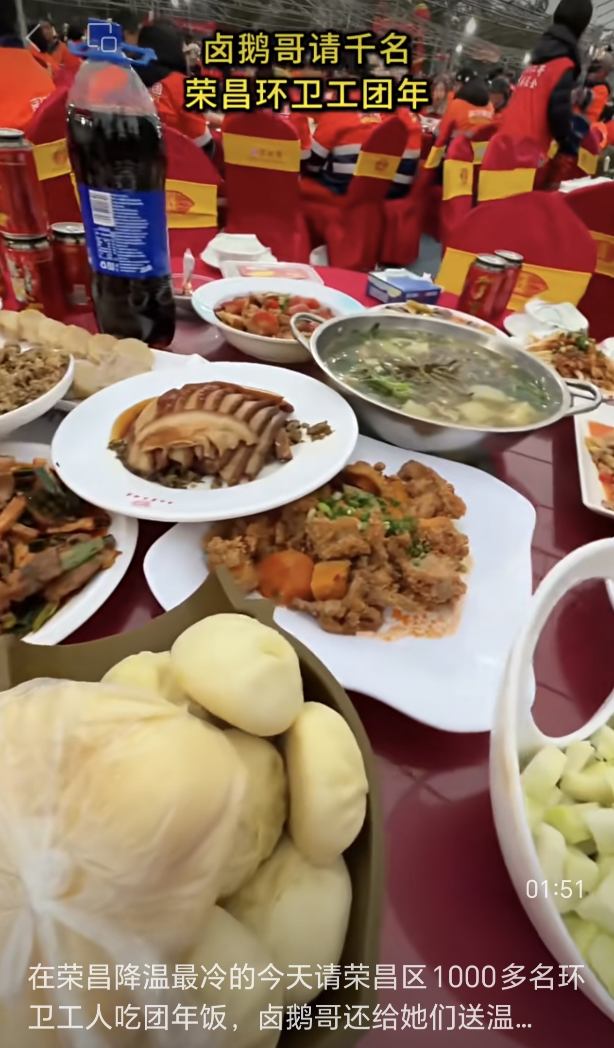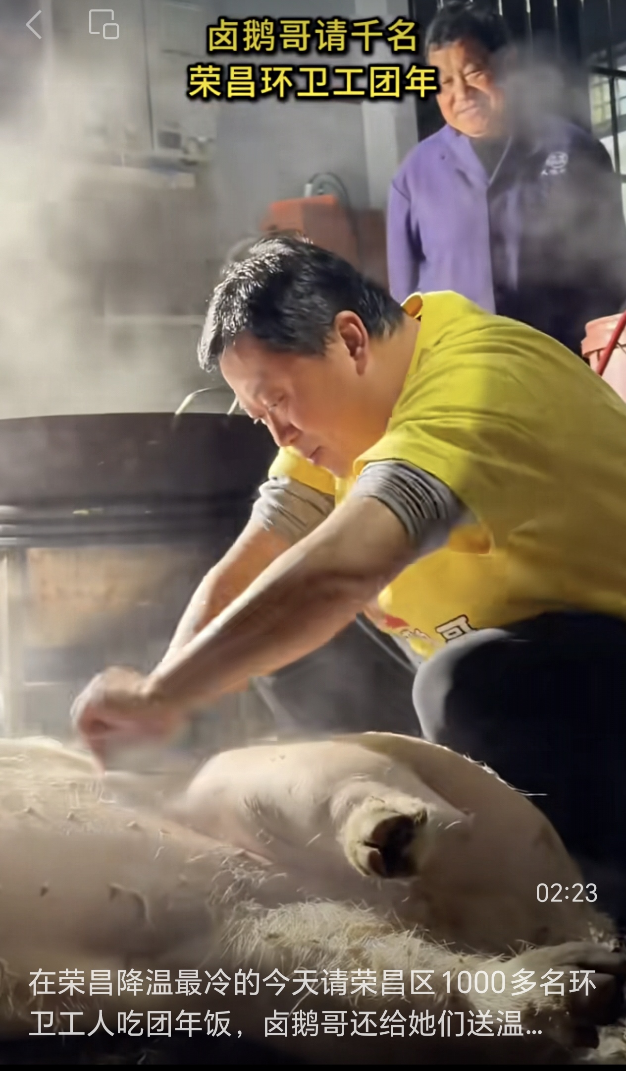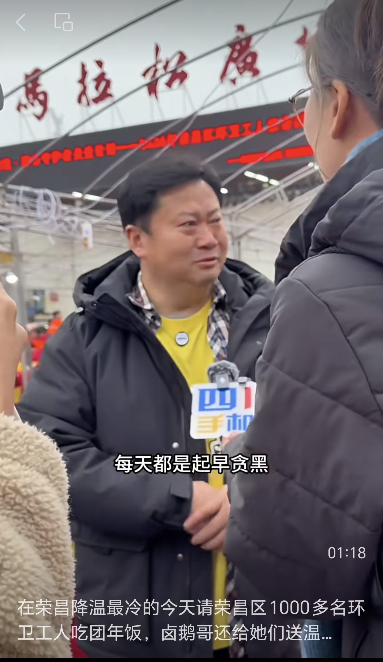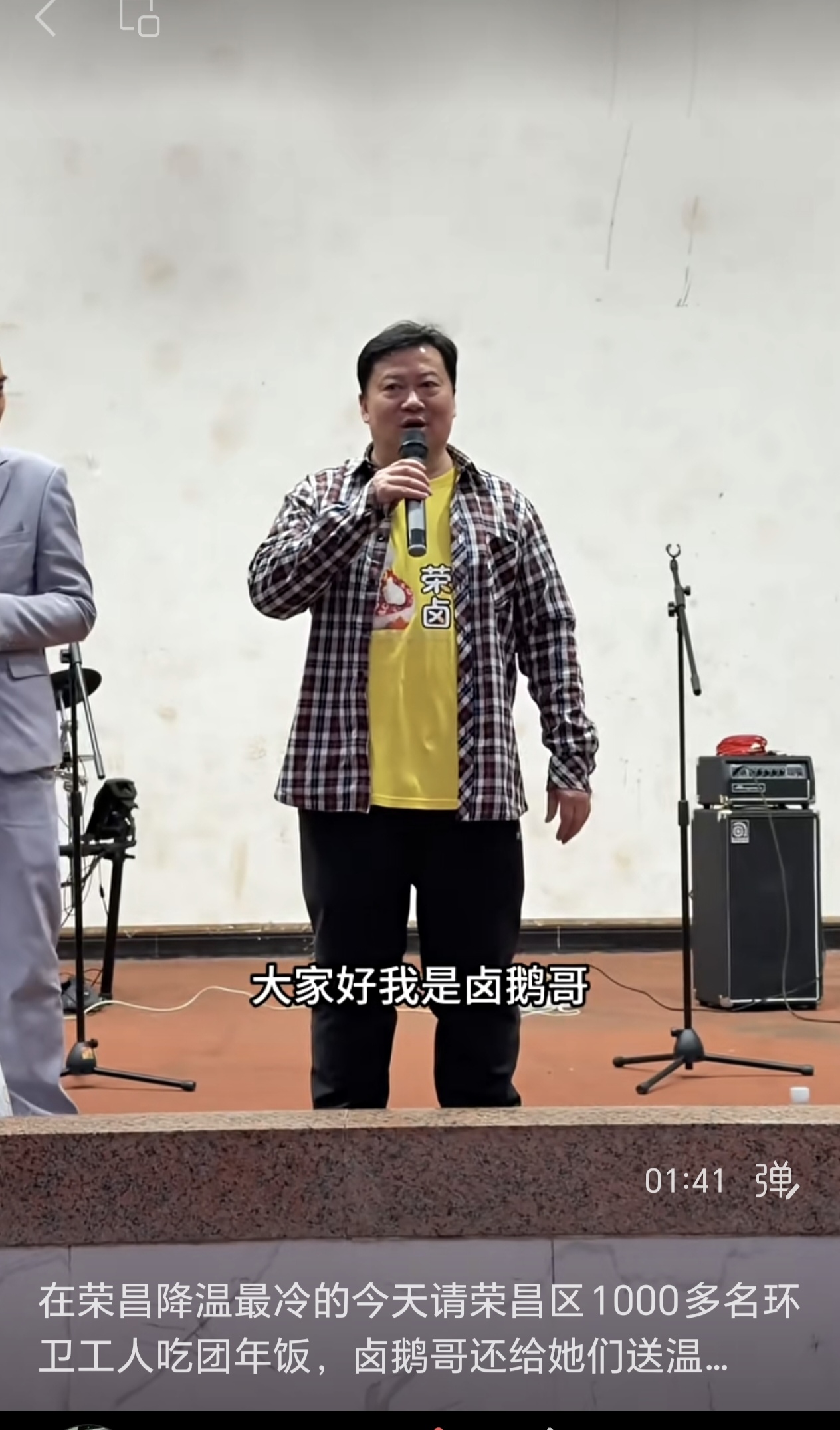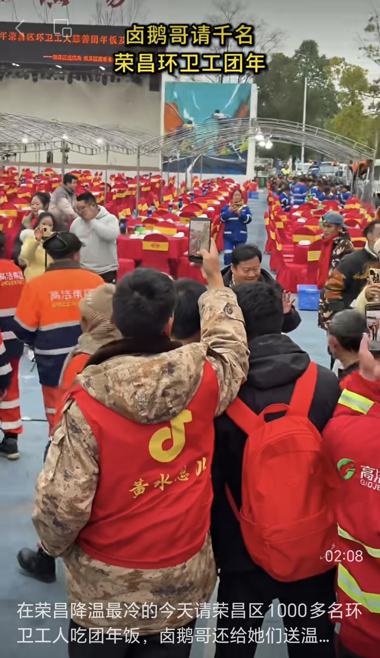 在重庆有一座小城叫荣昌。 在荣昌有一个人叫江哥,也叫卤鹅哥。 他凭一己之力带火了整个荣昌城,让荣昌这座小城在全国有了知名度。让荣昌卤鹅这道美味闻名全国。 他心怀大爱,一边想要带火自己的家乡,一边感恩家乡的父老乡亲。 他体谅环卫工人的辛苦,自掏腰包,宴请全城1200多名环卫工人吃团年宴,给他们送上暖心礼包。 环卫工人是我们城市的美容师,有了他们才有了我们这个城市的干净和美丽。他们起早贪黑,不惧风雨,默默付出。让我们能够拥有更整洁,更美丽的城市。 江哥是一个充满爱心,胸有大爱的人。也欢迎大家到荣昌来打卡,赏非遗,品美食。