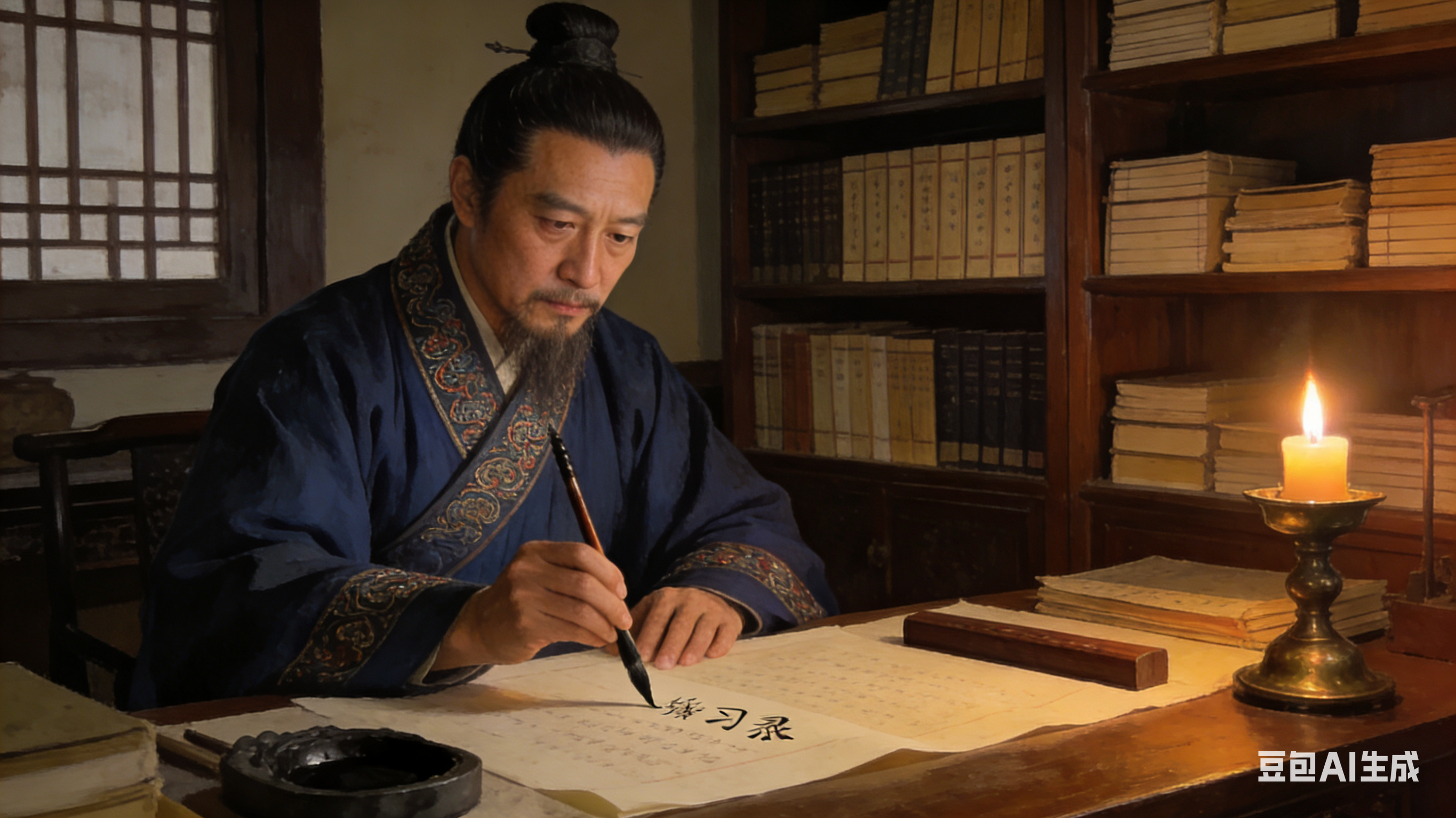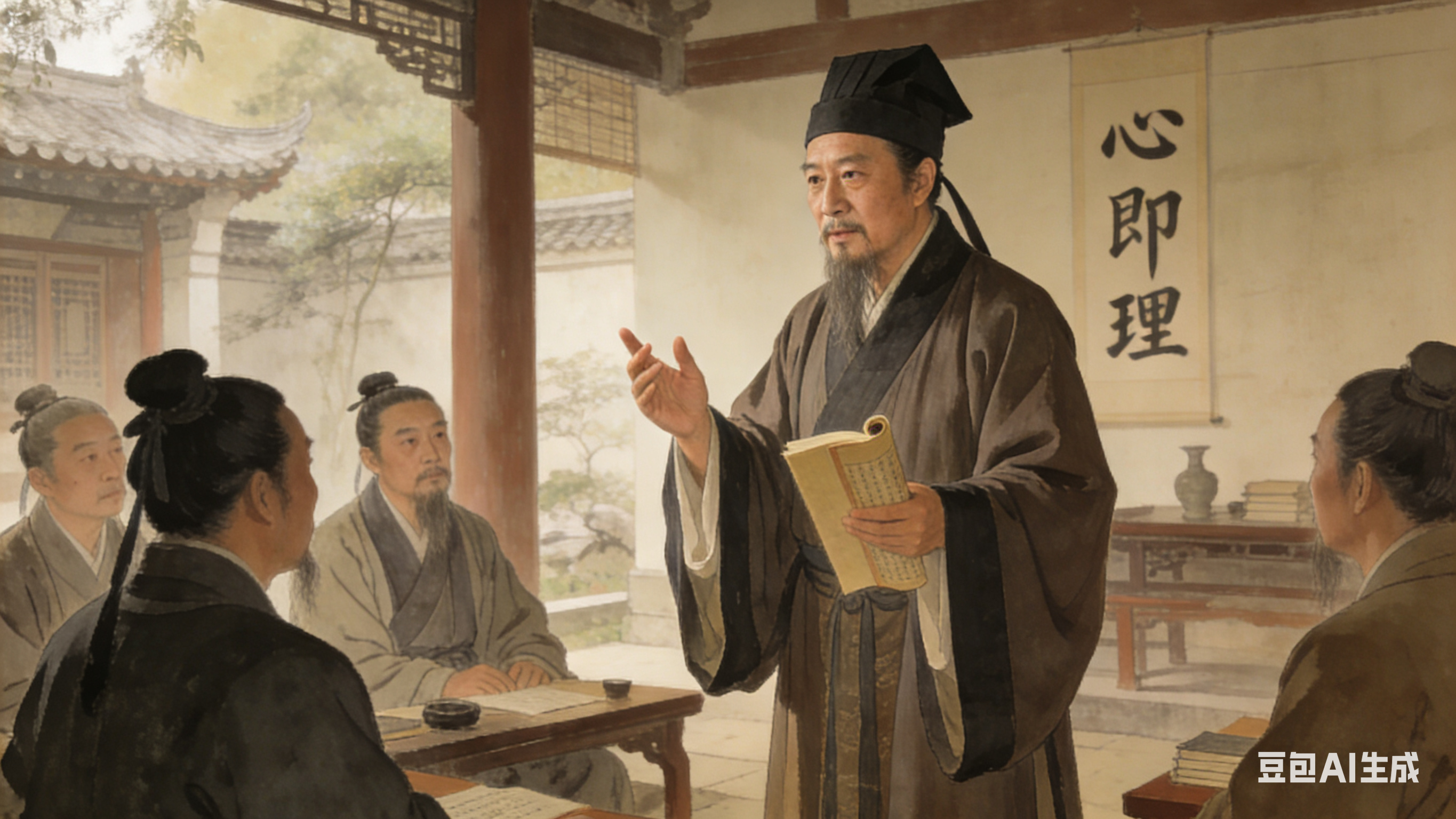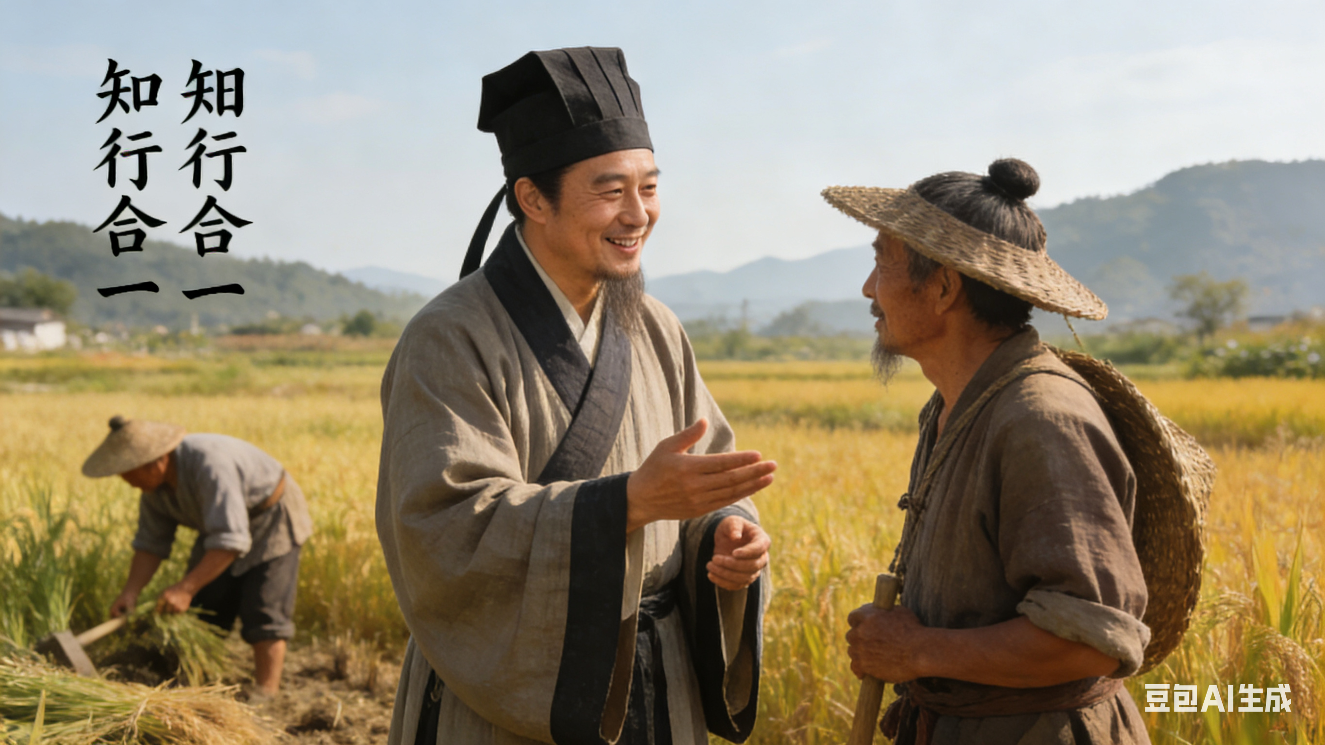 王阳明的心学 王阳明,明代哲学家、思想家。 图1:王阳明在书院讲学,向弟子们阐述“心即理”的思想,神情专注,手势生动。 图2:王阳明在竹林中静坐悟道,双目微闭,神态安详,周围竹叶轻摇,意境悠远。 图3:王阳明在田间与农夫交谈,践行“知行合一”,教导百姓将心学思想融入日常劳作。 图4:王阳明在书房撰写《传习录》,烛光下奋笔疾书,将心学精髓记录下来,神情专注。