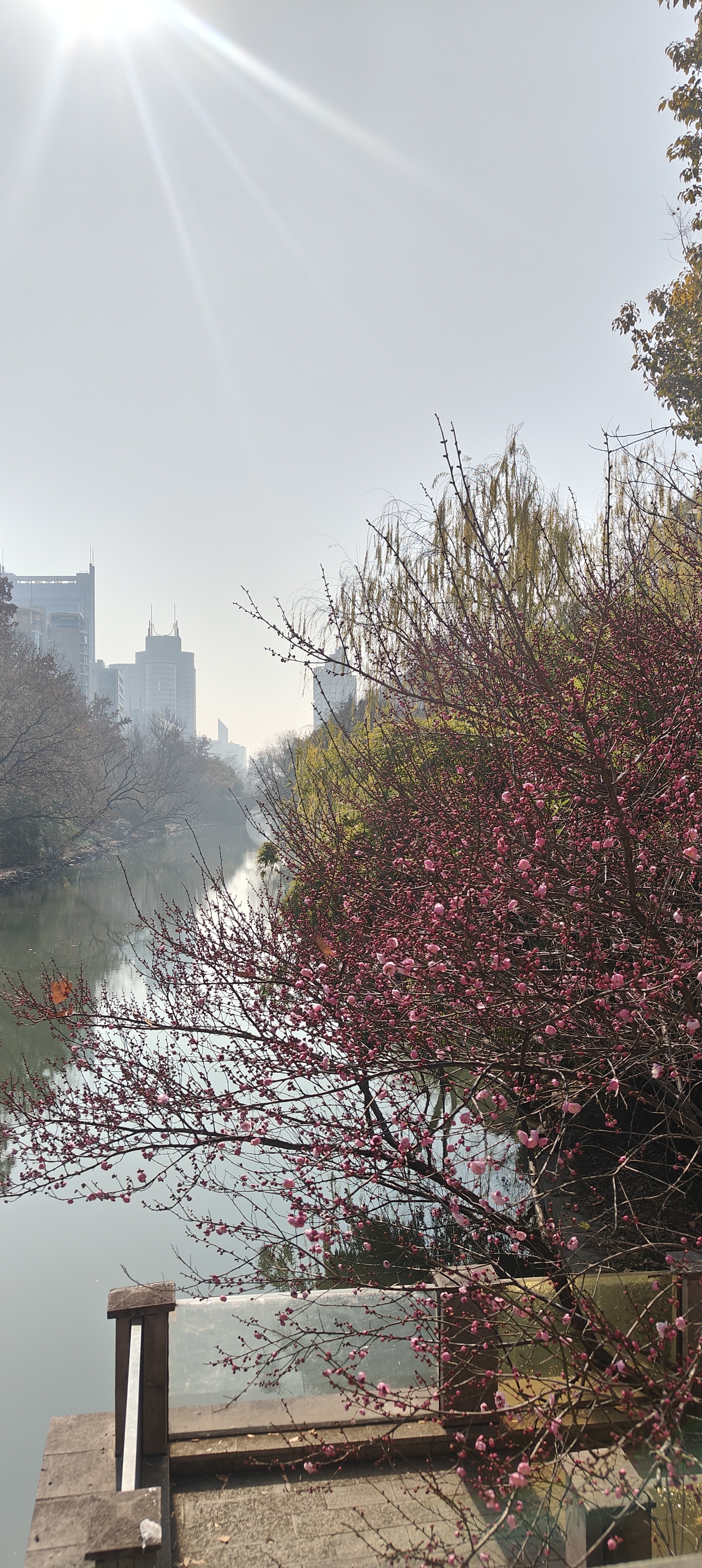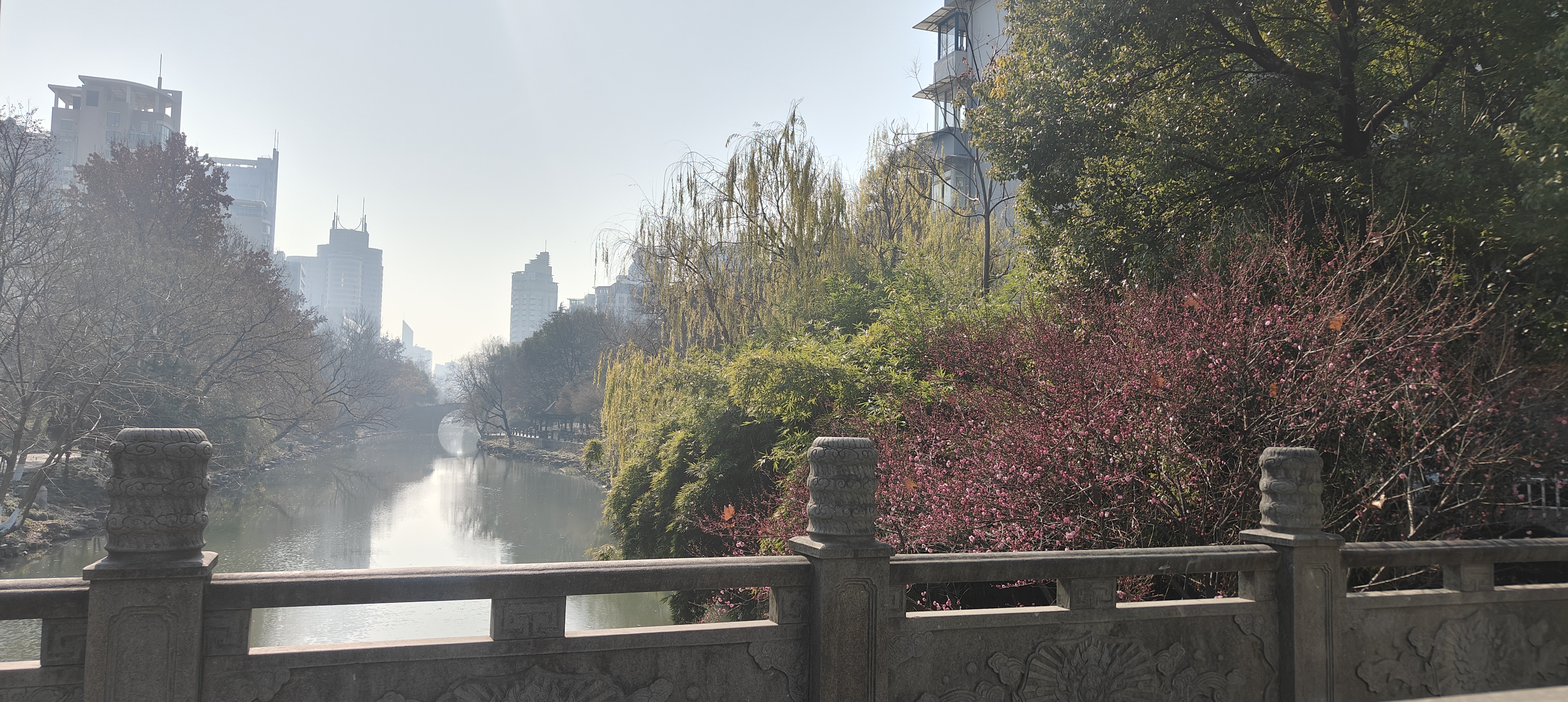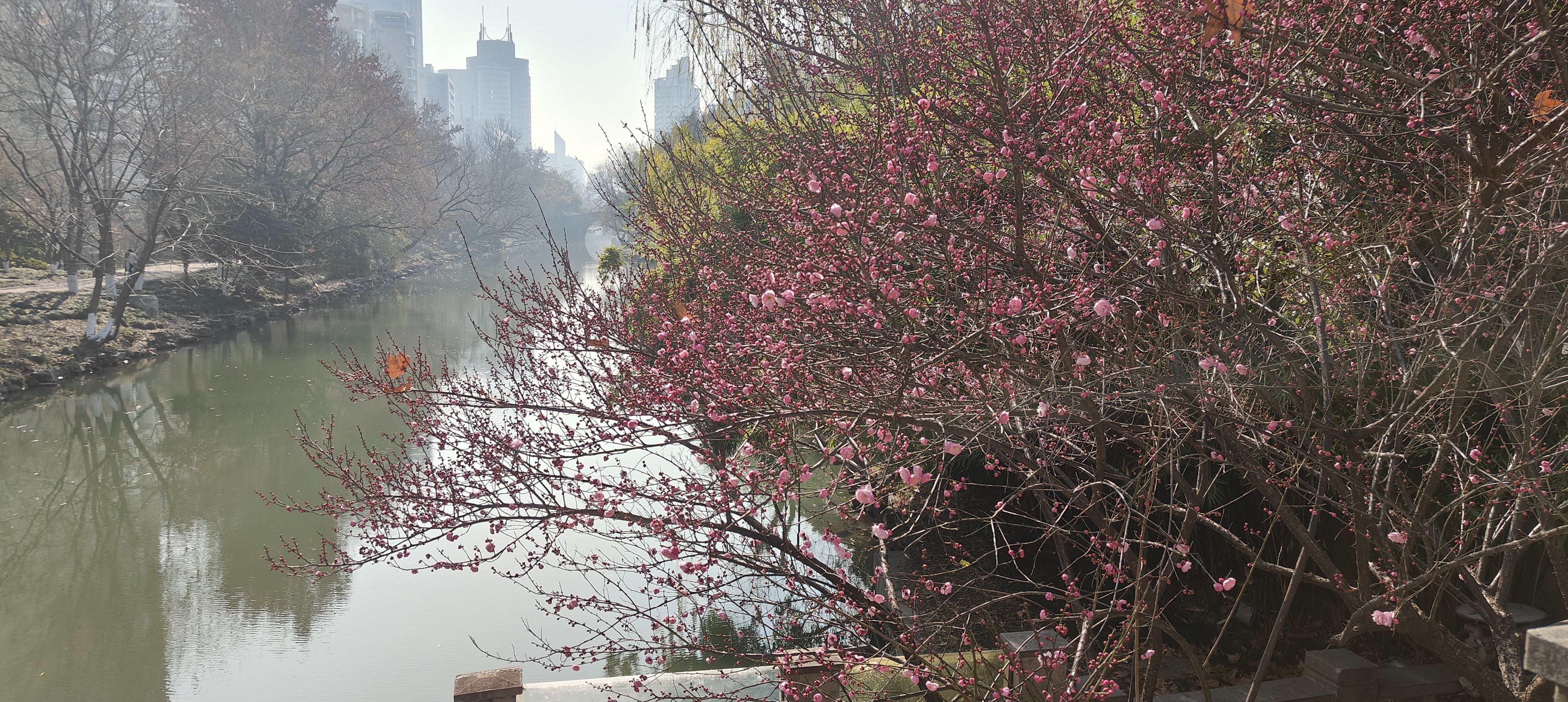 暖阳穿过薄雾,宝善桥河畔的红梅攒着满枝花苞,粉粉嫩嫩地探着春的消息。柳树垂着嫩黄的丝绦,与清浅的河水相映成趣。远处的高楼在朦胧里成了温柔的背景,走在石桥上,风里都带着点甜丝丝的暖意,这大概就是杭州初春最治愈的模样。