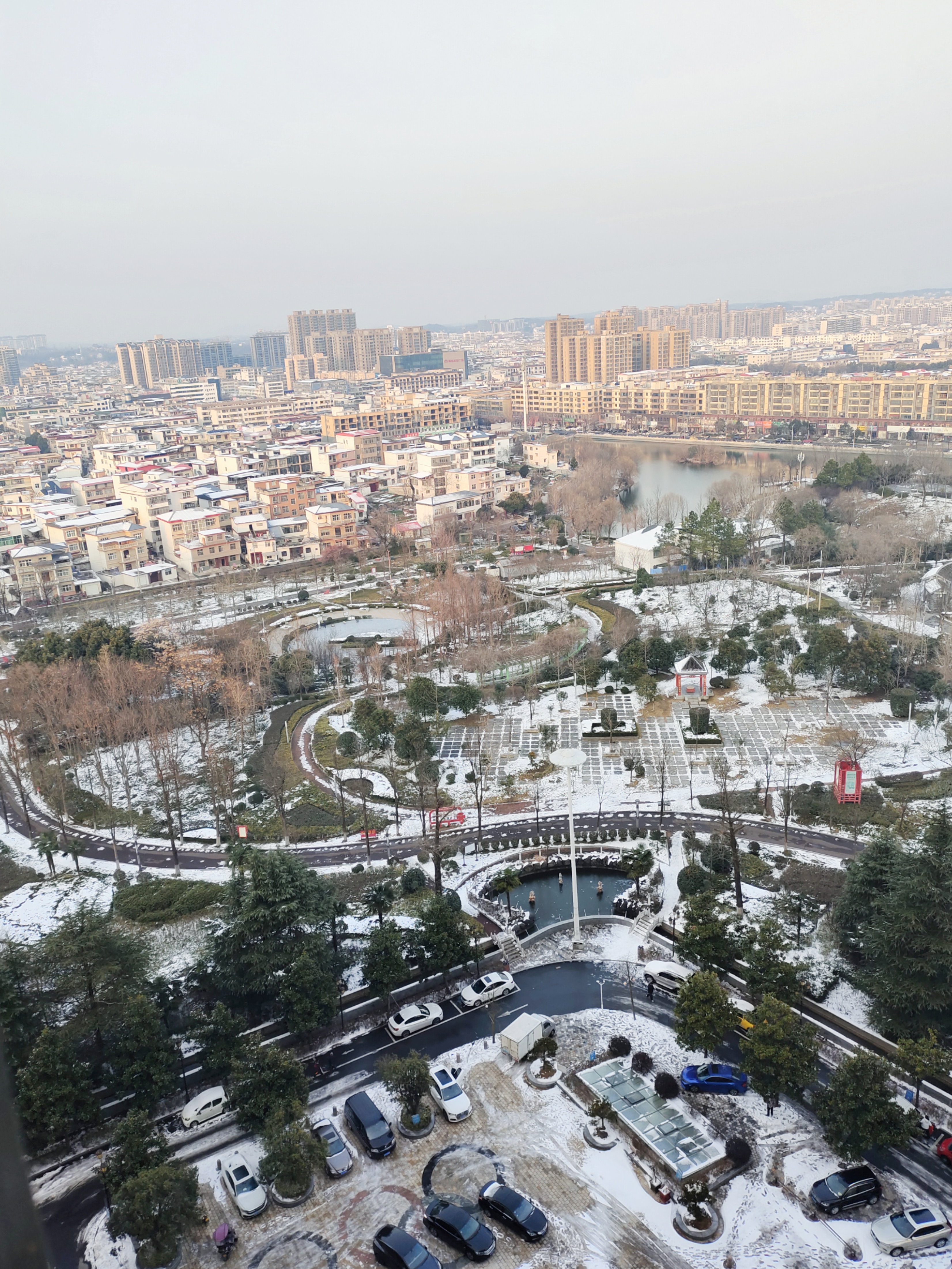 雪落城央,湖冰如镜,红亭点睛;车痕蜿蜒,灯影浮沉——冬在楼宇间低语,静美自成诗。
