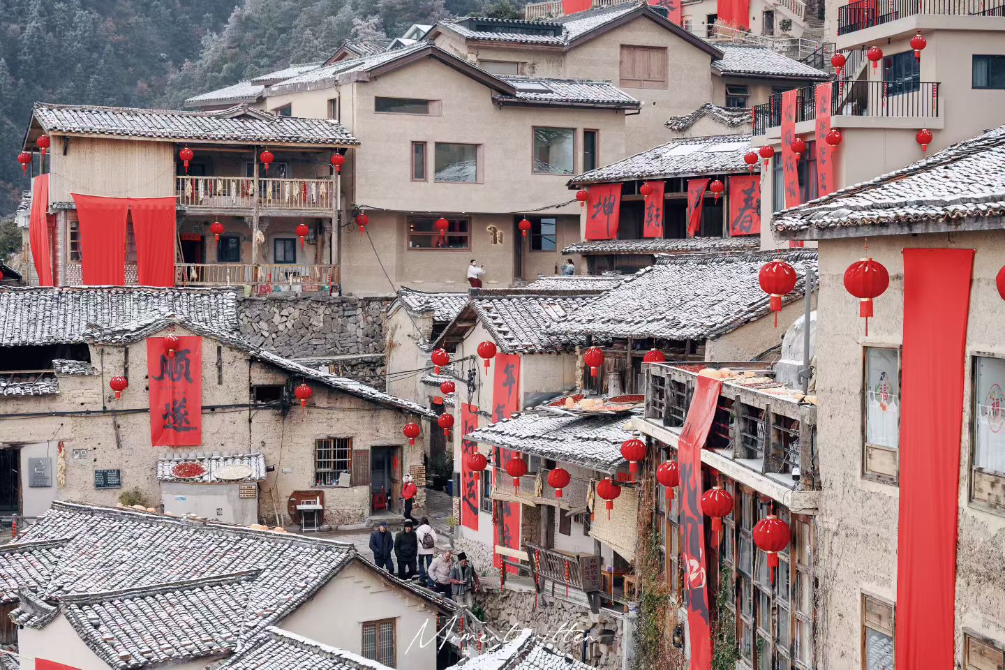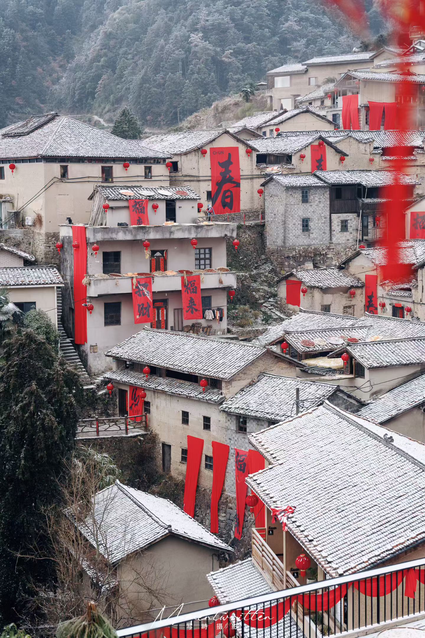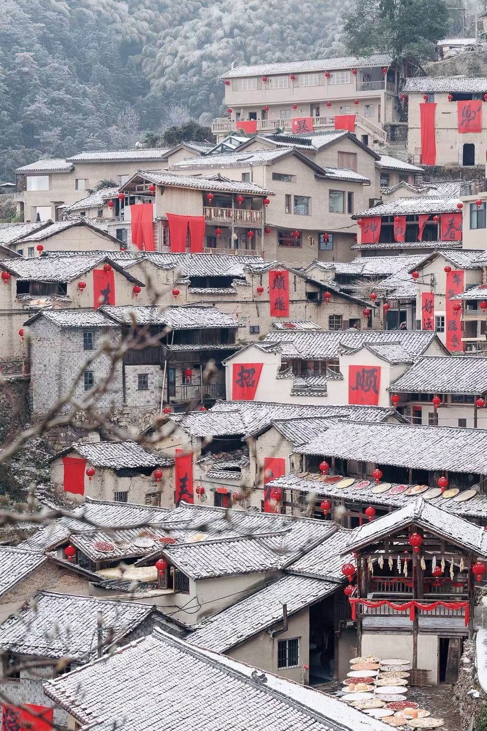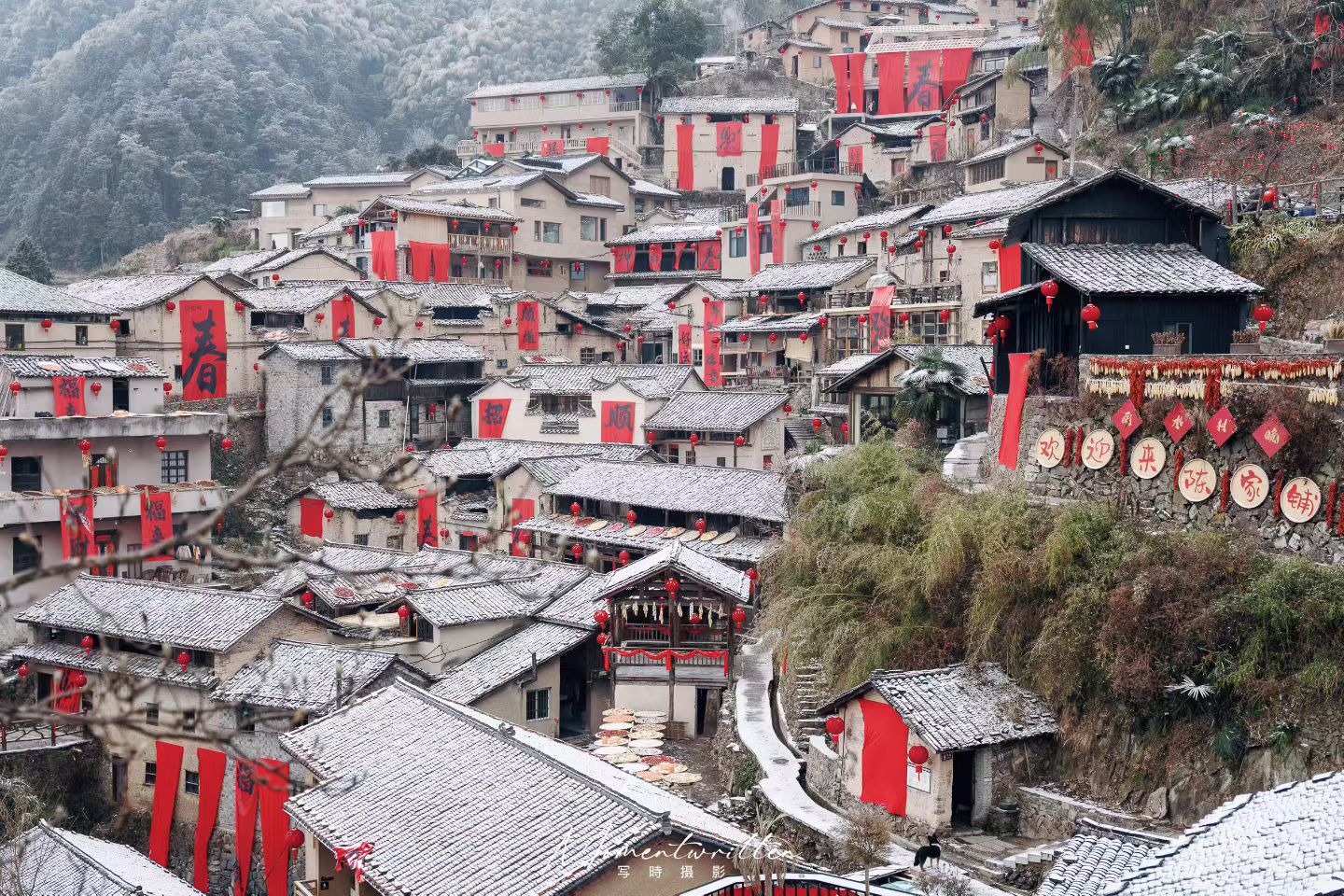 白雪遇见中国红, 冬日过大年的山村陈家铺。 1月23日,浙江松阳。