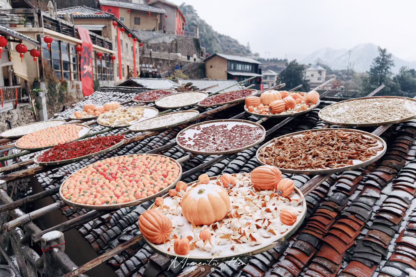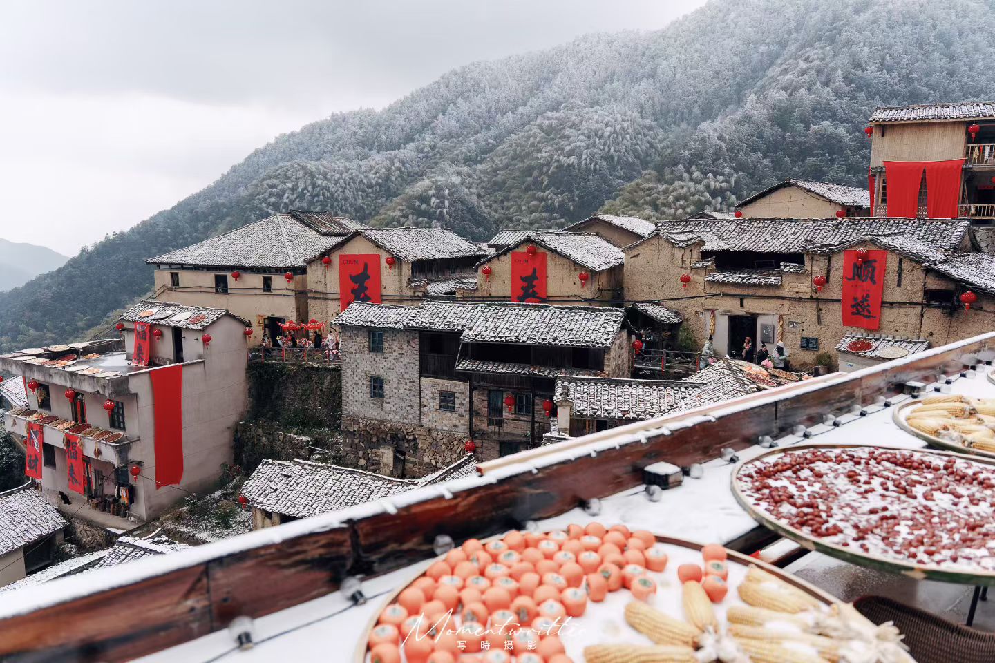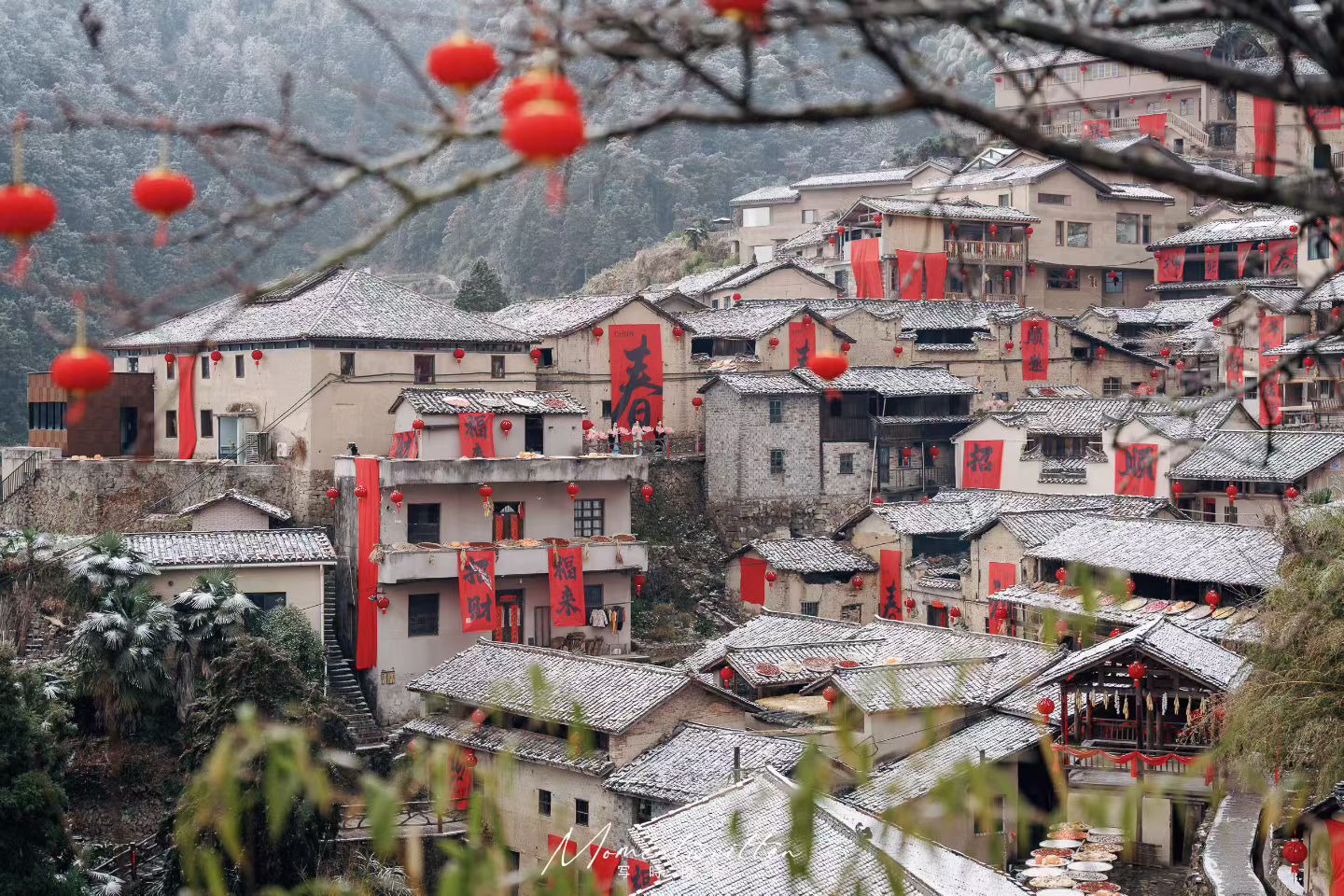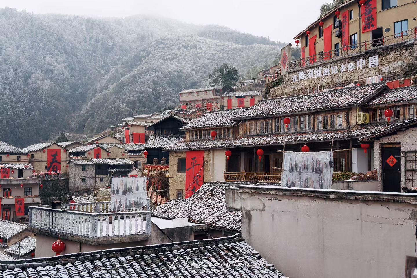 白雪遇见中国红, 冬日过大年的山村陈家铺。 1月23日,浙江松阳。