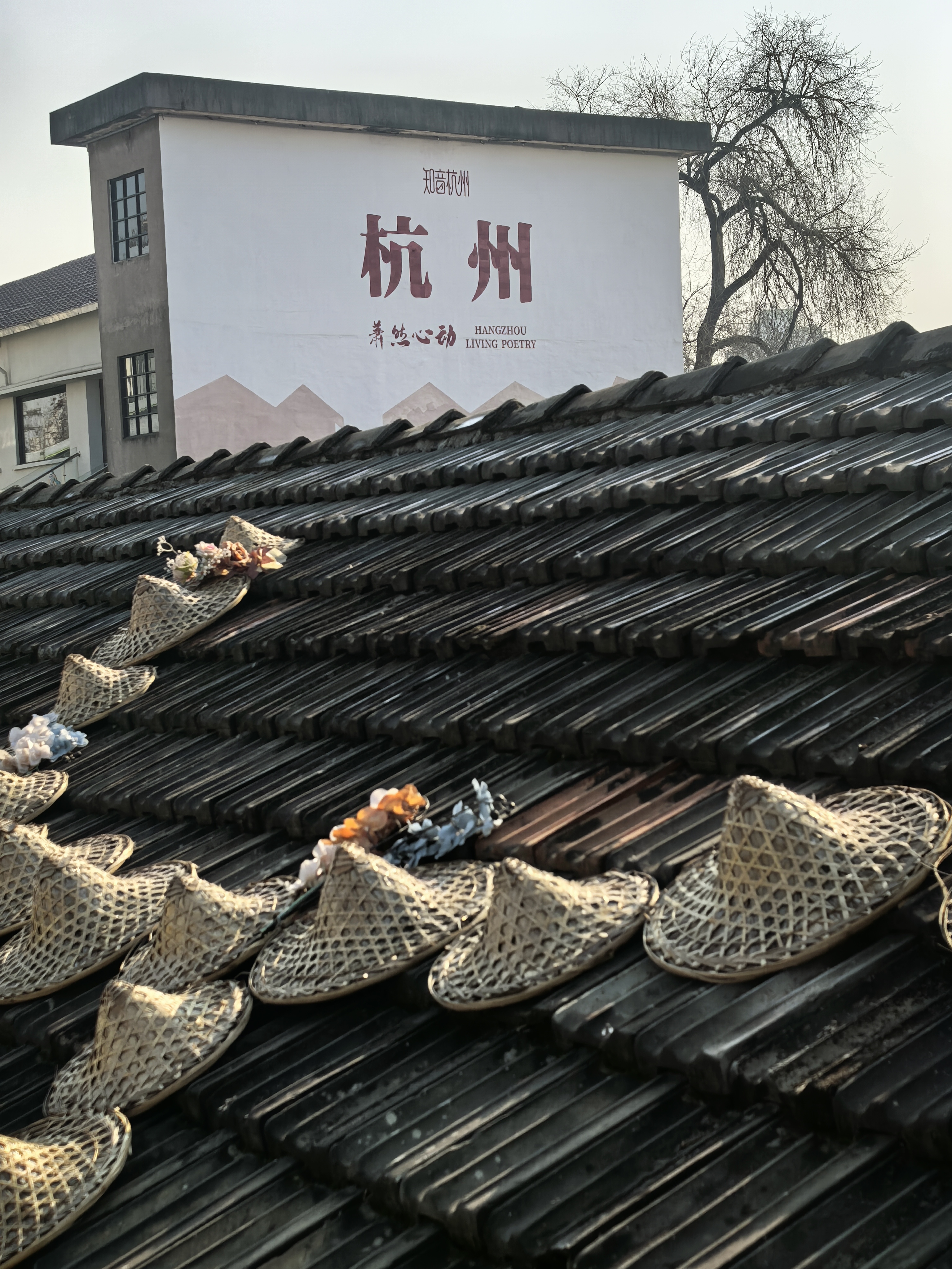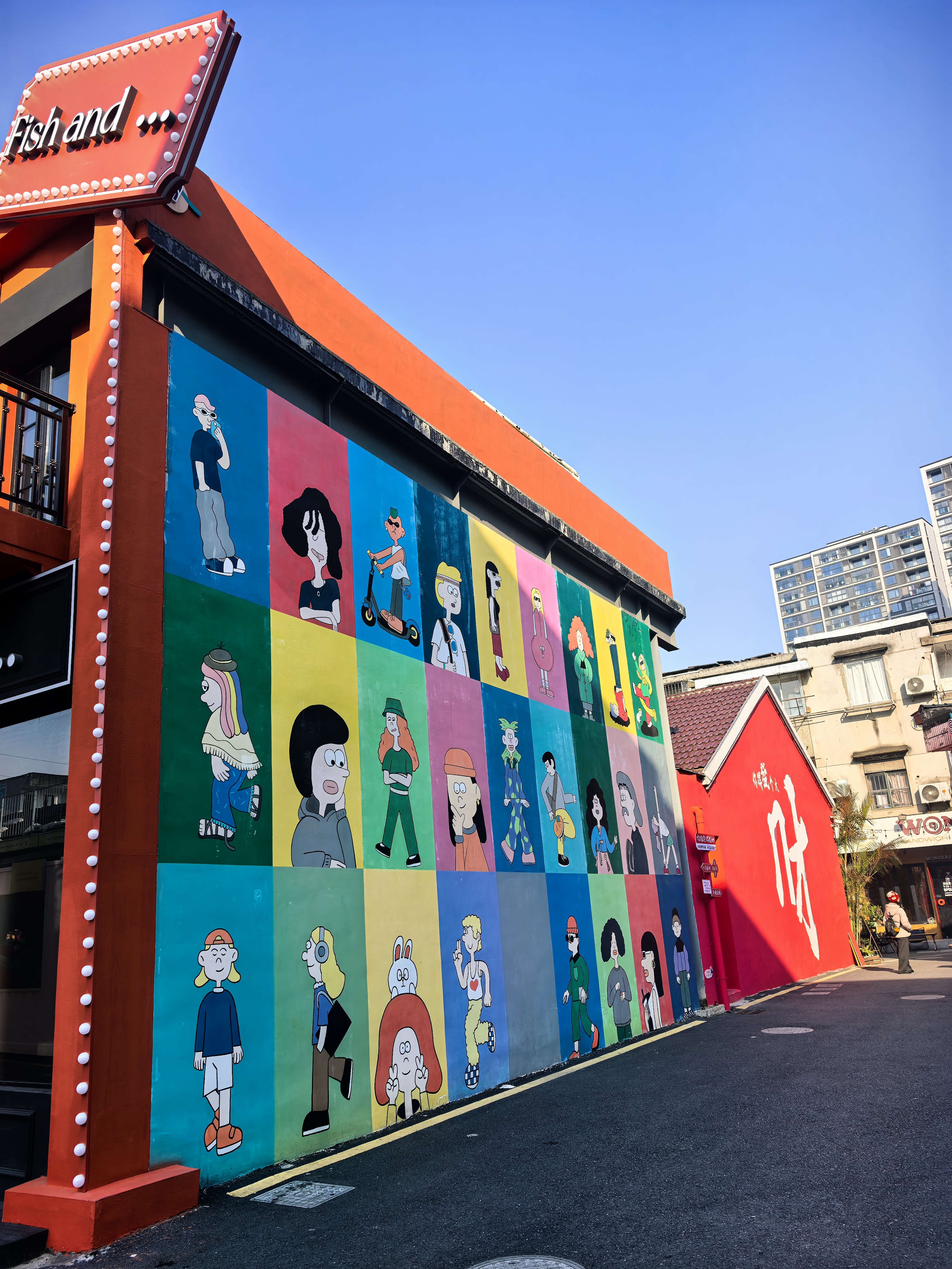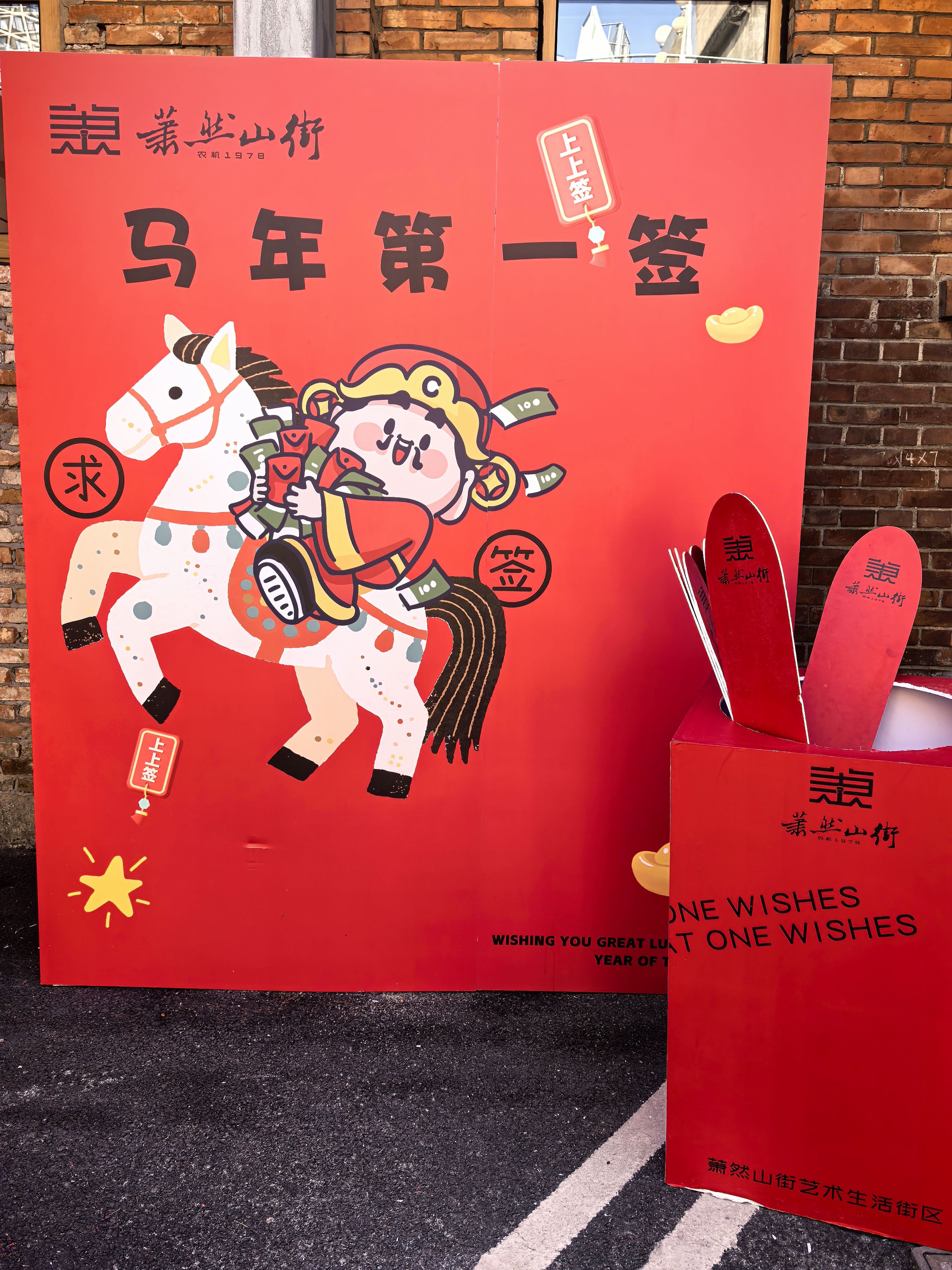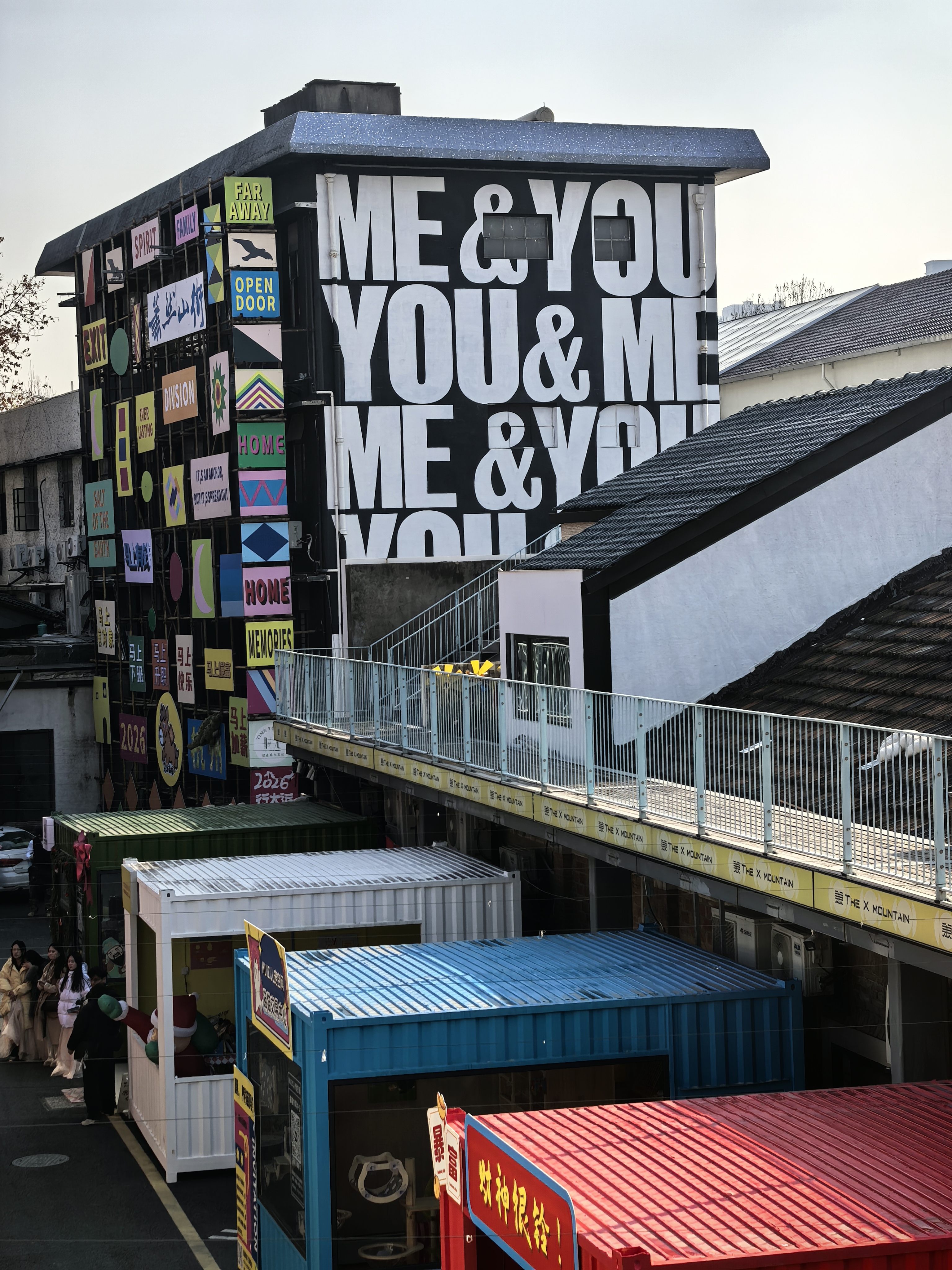 早上登上萧然山街好几米高的平台,屋上几排斗笠错落摆放,与远处“知音杭州”的标识形成有趣的对话。此刻,这里没有夜晚的喧嚣,只有晨风轻拂,铁索桥静默,观景台空无一人,却恰好能听见远处浙赣铁路的火车鸣笛声。 俯瞰下面,集装箱摊位还未营业,街巷像是一条等待被唤醒的时光隧道。这个时间来萧然山街,能感受到最真实的“生活感”,居民晨练的脚步声,店铺门帘拉起的声响,阳光一寸寸没过红墙的温度。这是艺术街区最日常的一面,也是文创融入商业和社区模式最生动的注脚。