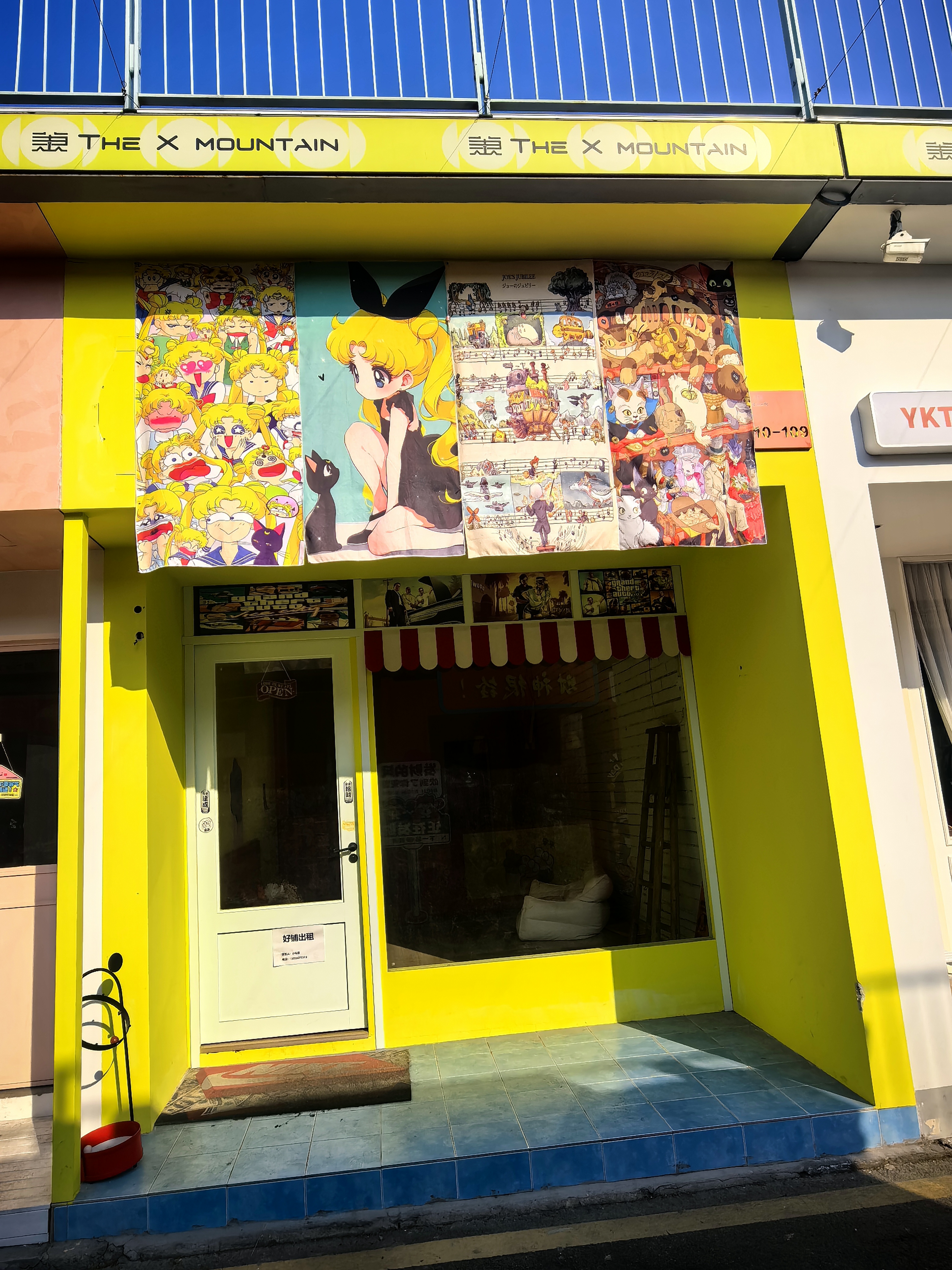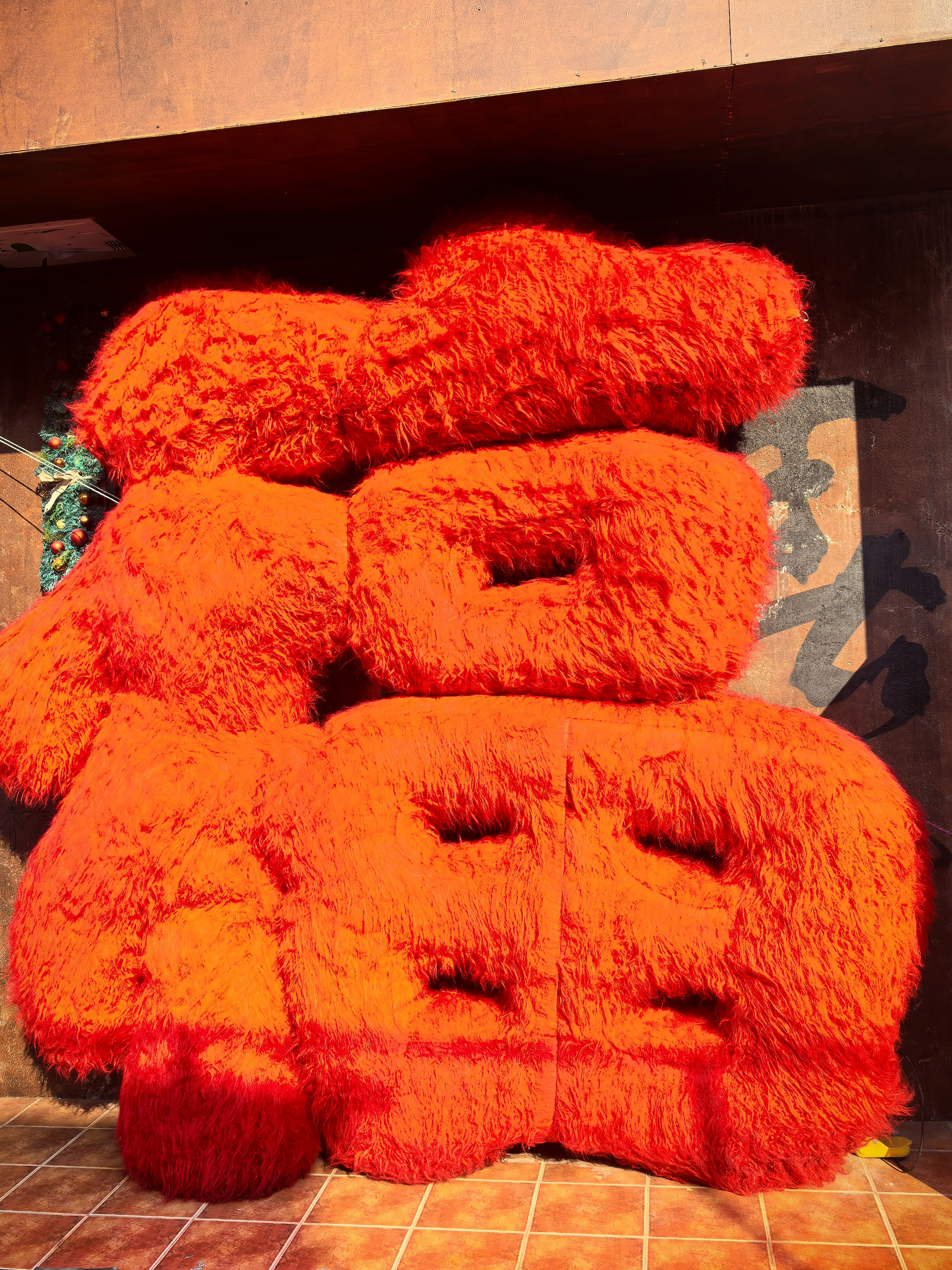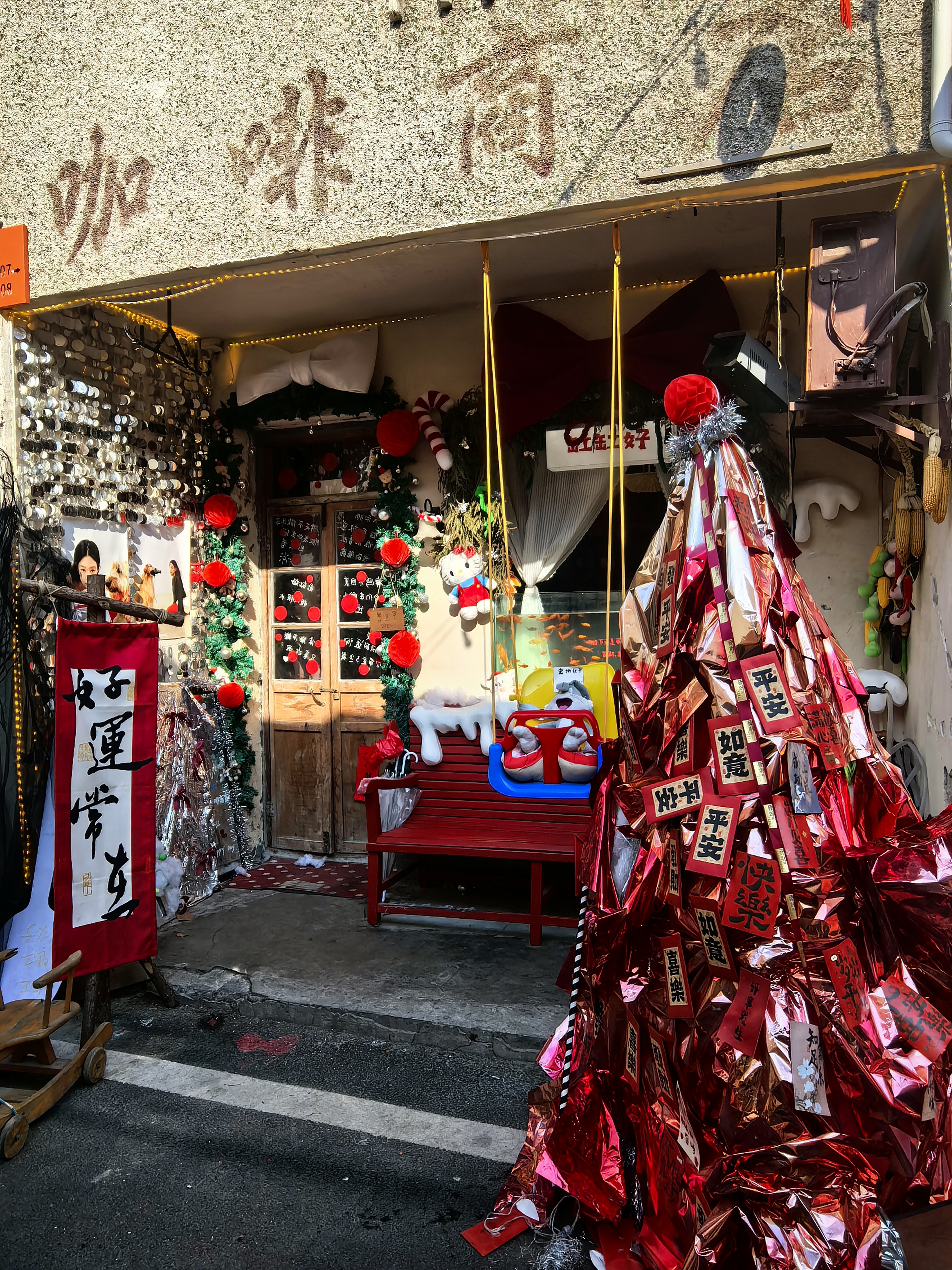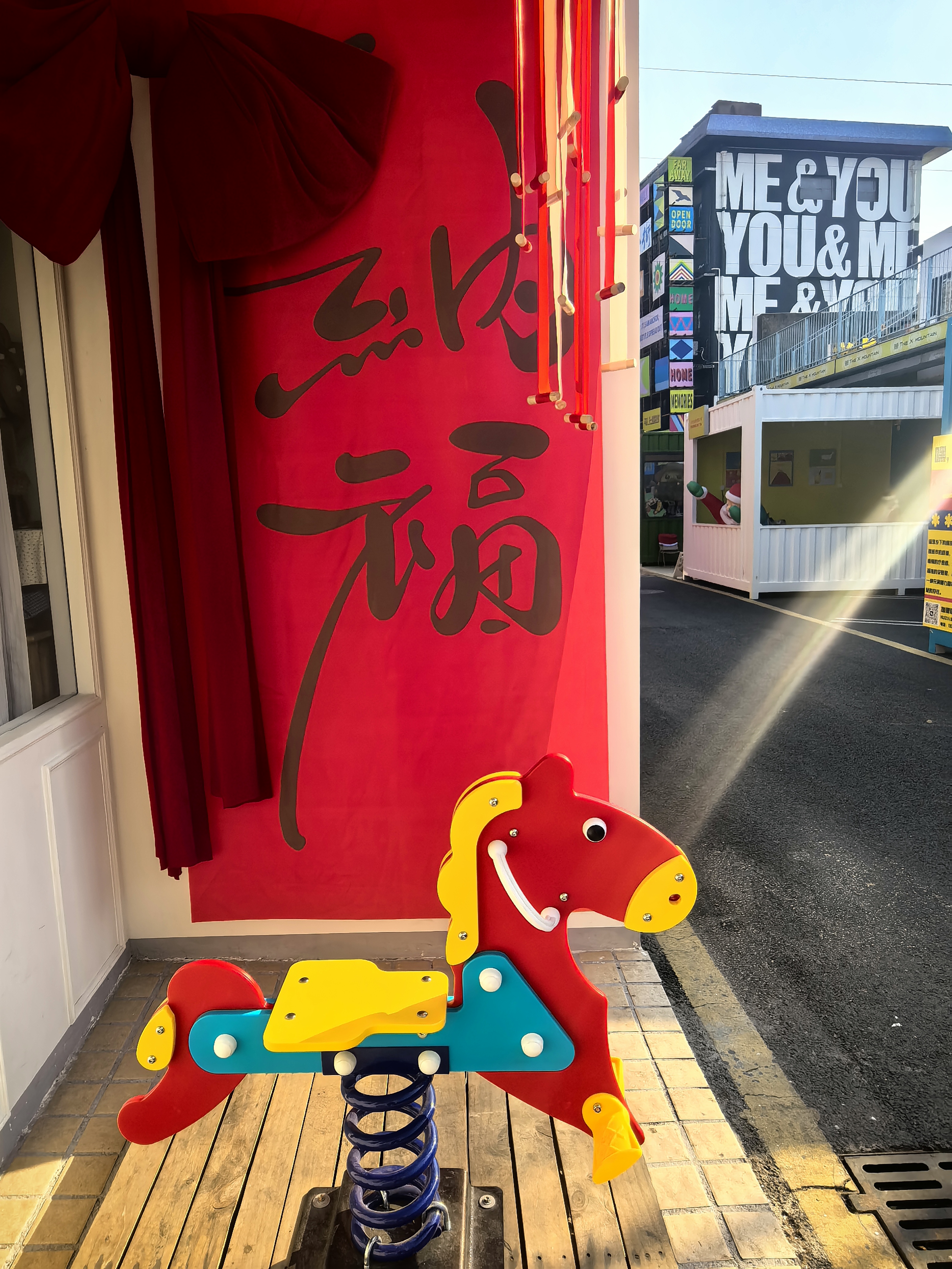 早上登上萧然山街好几米高的平台,屋上几排斗笠错落摆放,与远处“知音杭州”的标识形成有趣的对话。此刻,这里没有夜晚的喧嚣,只有晨风轻拂,铁索桥静默,观景台空无一人,却恰好能听见远处浙赣铁路的火车鸣笛声。 俯瞰下面,集装箱摊位还未营业,街巷像是一条等待被唤醒的时光隧道。这个时间来萧然山街,能感受到最真实的“生活感”,居民晨练的脚步声,店铺门帘拉起的声响,阳光一寸寸没过红墙的温度。这是艺术街区最日常的一面,也是文创融入商业和社区模式最生动的注脚。