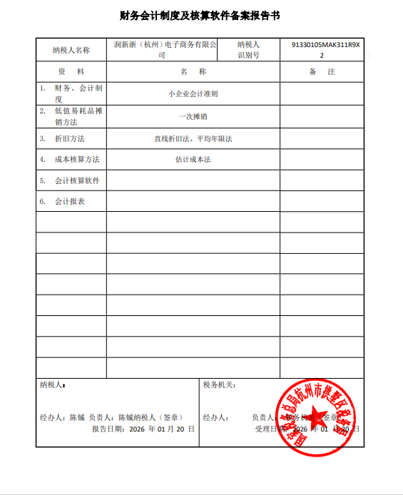 沈豪丽控股集团投资电商公司新增财务会计制度及核算软件备案报告书
