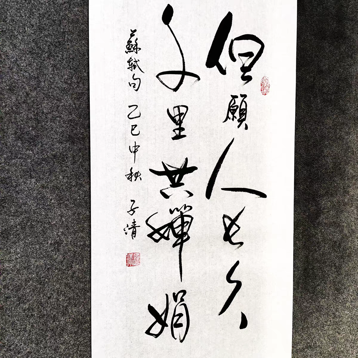 墨里婵娟 展卷时,墨香先于月色漫开。 “但愿人长久,千里共婵娟”,十个字在宣纸上如霜枝横斜,笔锋游走间,似有苏子当年把酒临风的衣袂翻飞。浓墨是他举杯时的沉郁,飞白是月光穿过云层的清浅,那些牵丝连带的笔触,像极了人间扯不断的思念。 我想起己巳年的中秋,子清先生挥毫的此刻,窗外定也悬着一轮和千年前相似的月。 笔锋落处,“人”字撇捺舒展,是游子远眺的身姿;“婵娟”二字缠绵,如月光温柔地覆上离人的肩头。红印一方,是案头朱砂,也是心头一点温热的念想。 不必问墨浓墨淡,不必计笔画短长。 这一纸行书,早已把千年的月光揉进了笔底。无论隔了多少山水,无论经了多少寒暑,只要目光落在字上,就能听见苏子的喟叹,也能看见那轮共照古今的明月,正从宣纸的褶皱里,缓缓升起。