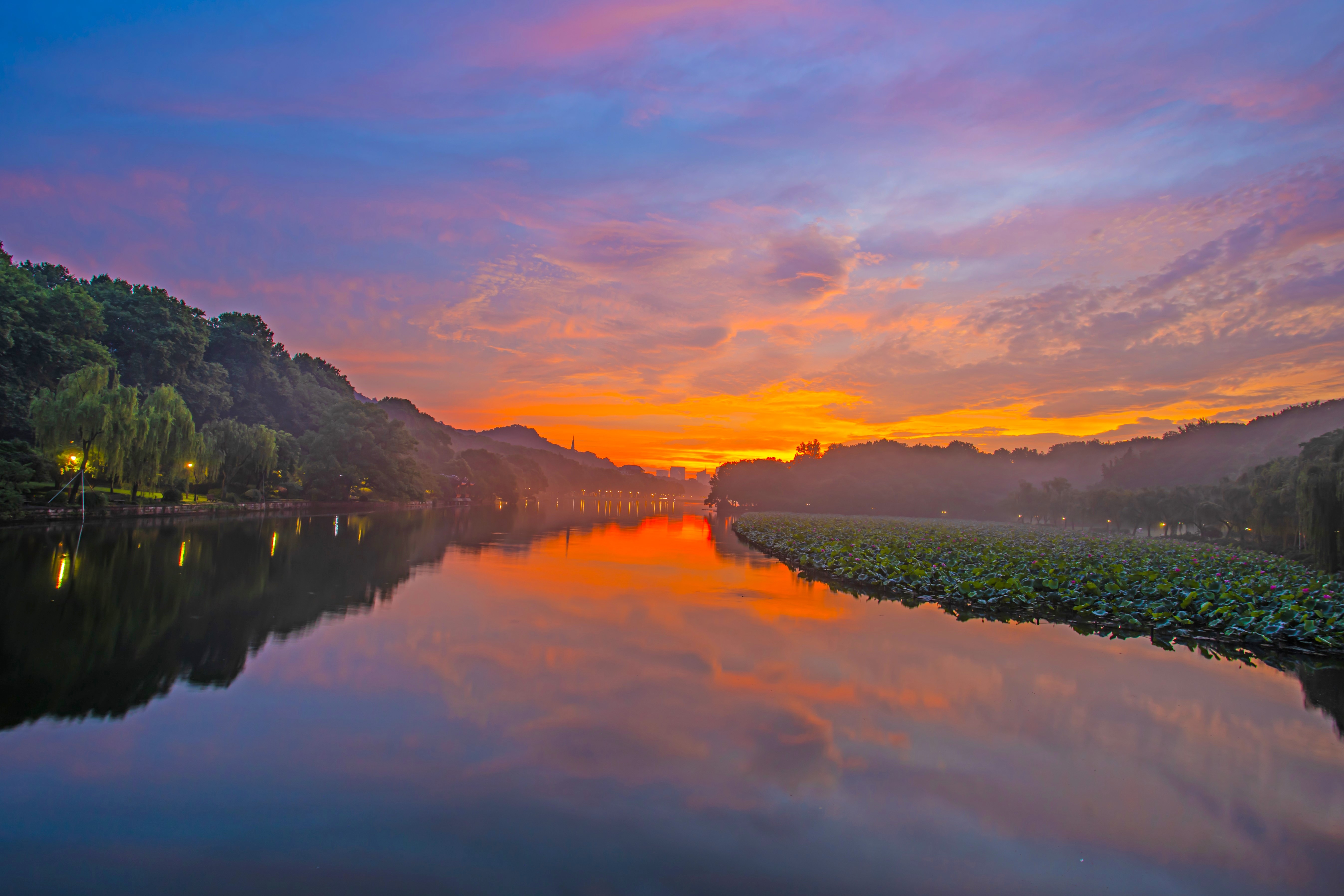 西湖边蹲点拍摄日出,橙紫渐变天+镜面湖水,荷花柳影全倒进画里~远处城市天际线悄悄露脸,云也慢悠悠的。原来江南的清晨,是带柔光滤镜的Live图呀~