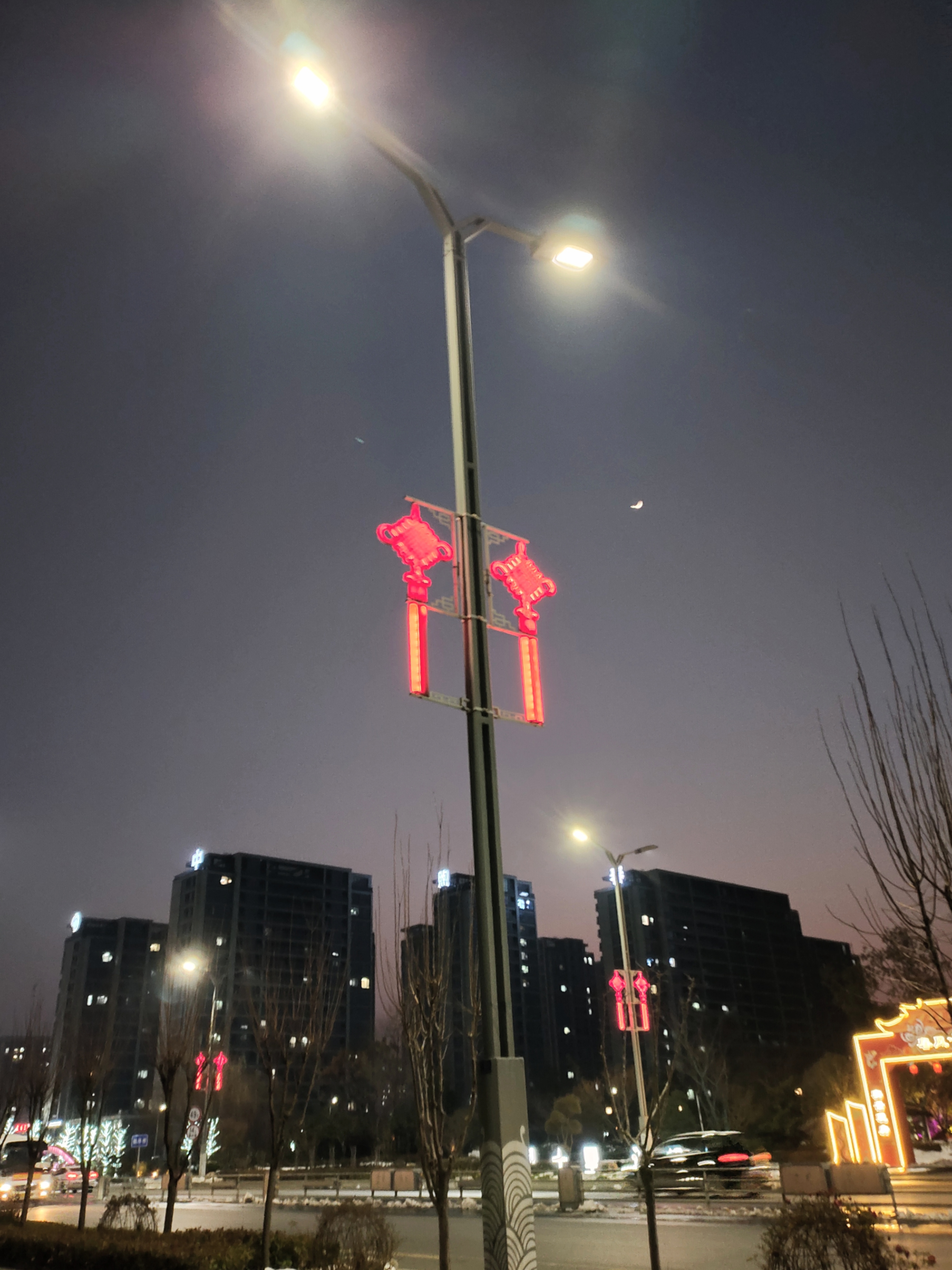 雪落无声,红灯映窗,月光轻抚楼宇。街灯与灯笼低语,冬夜的城市,静美如诗。