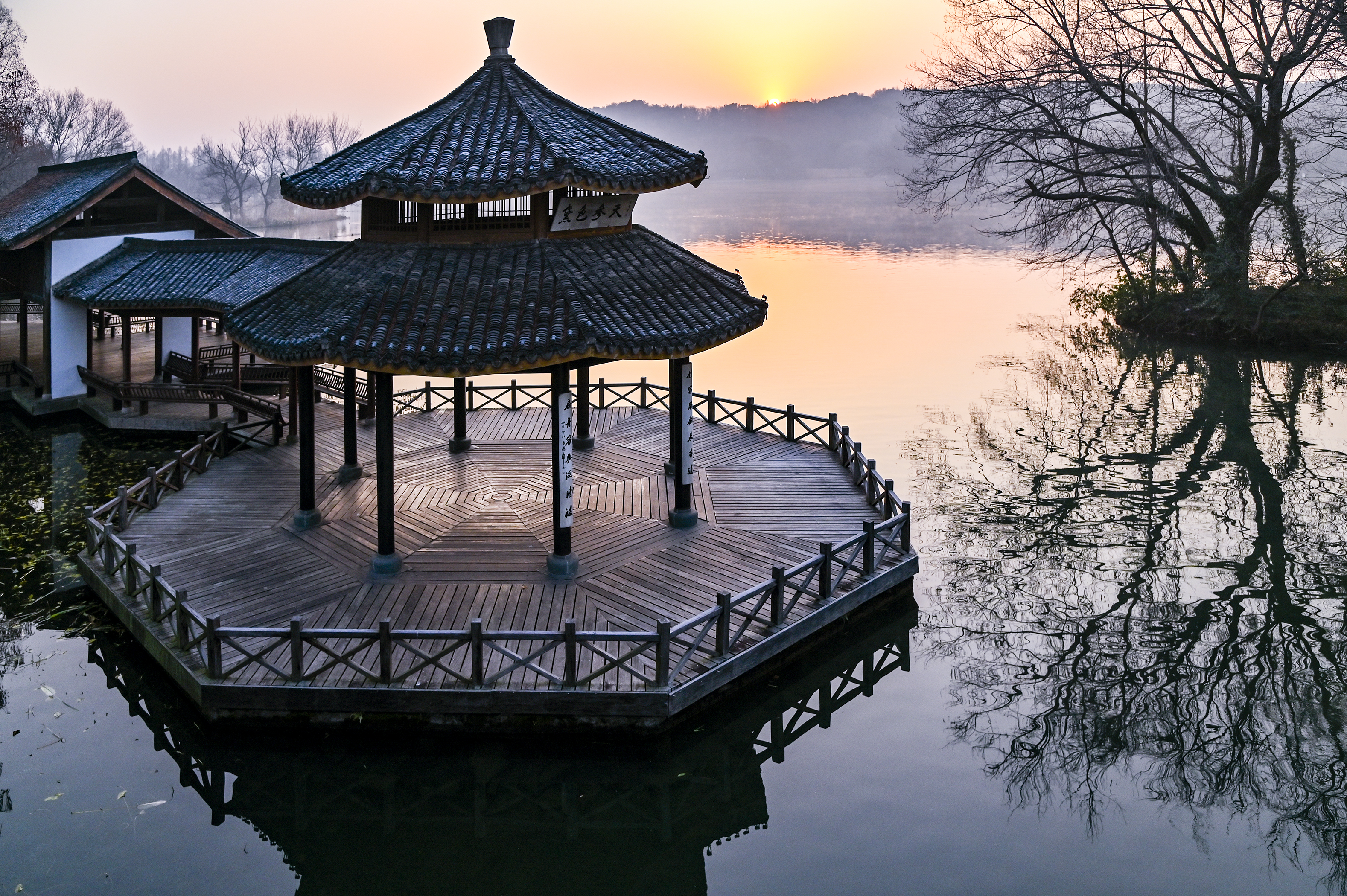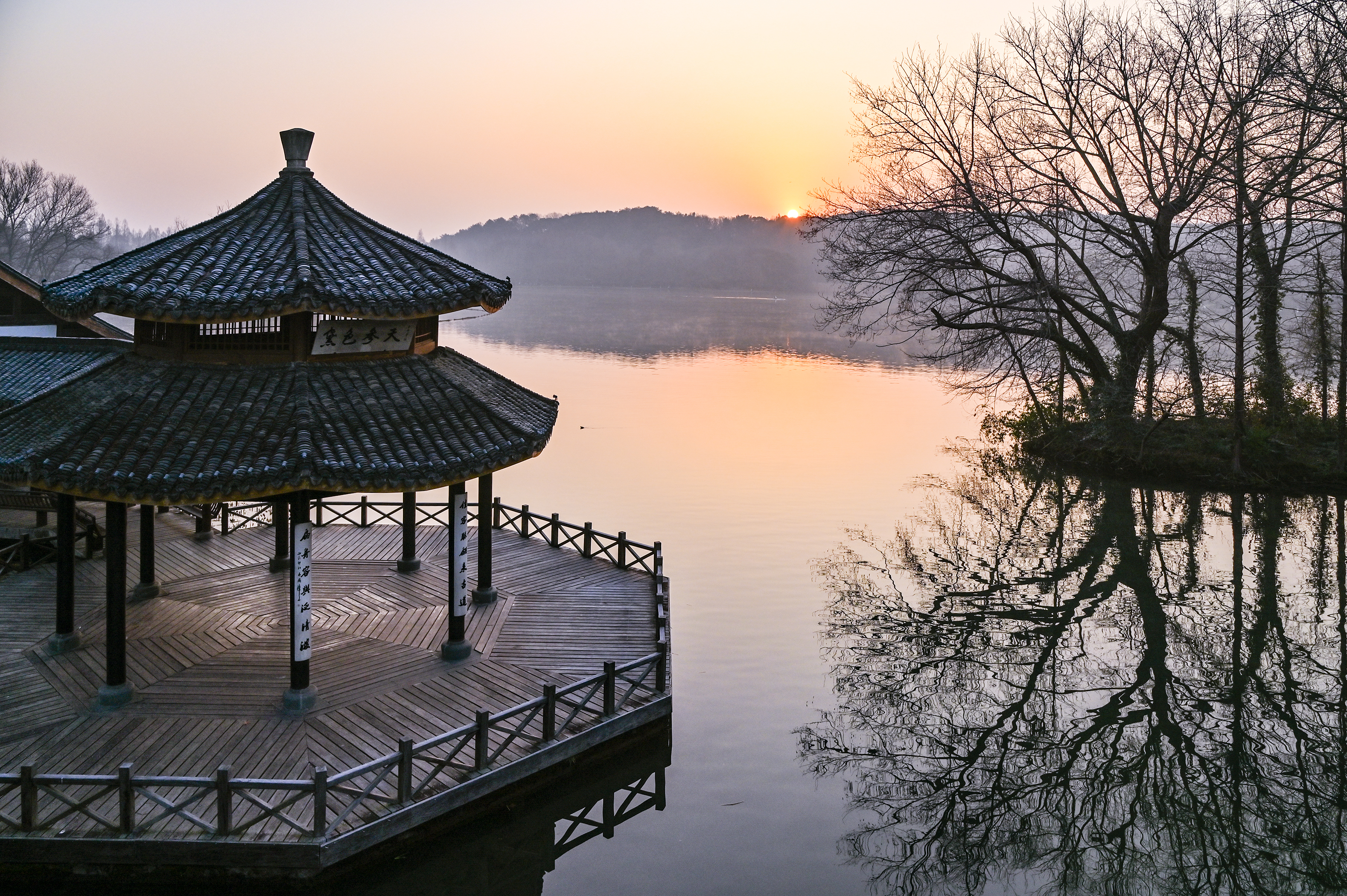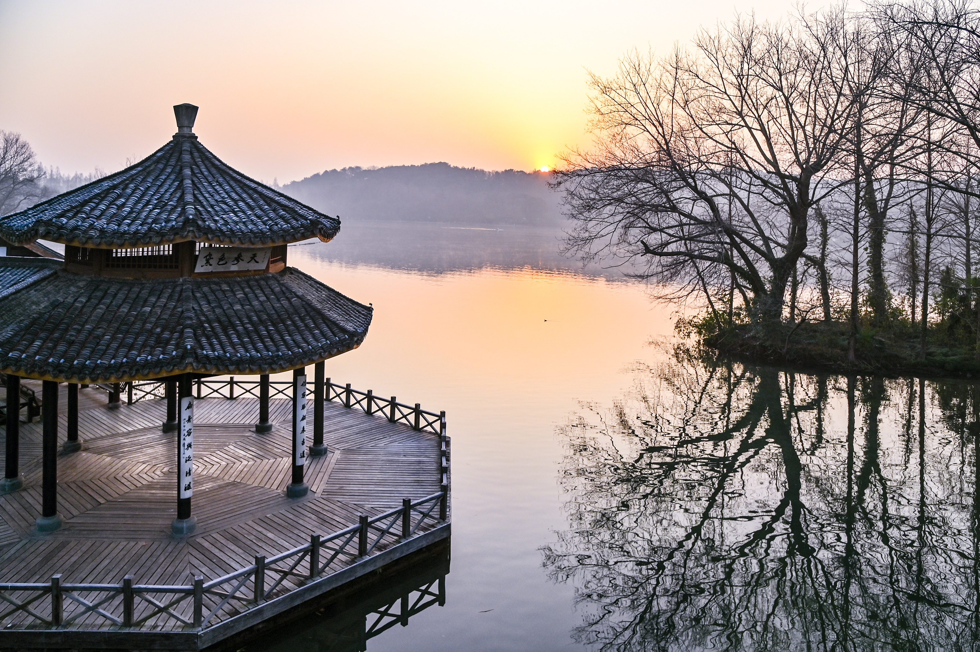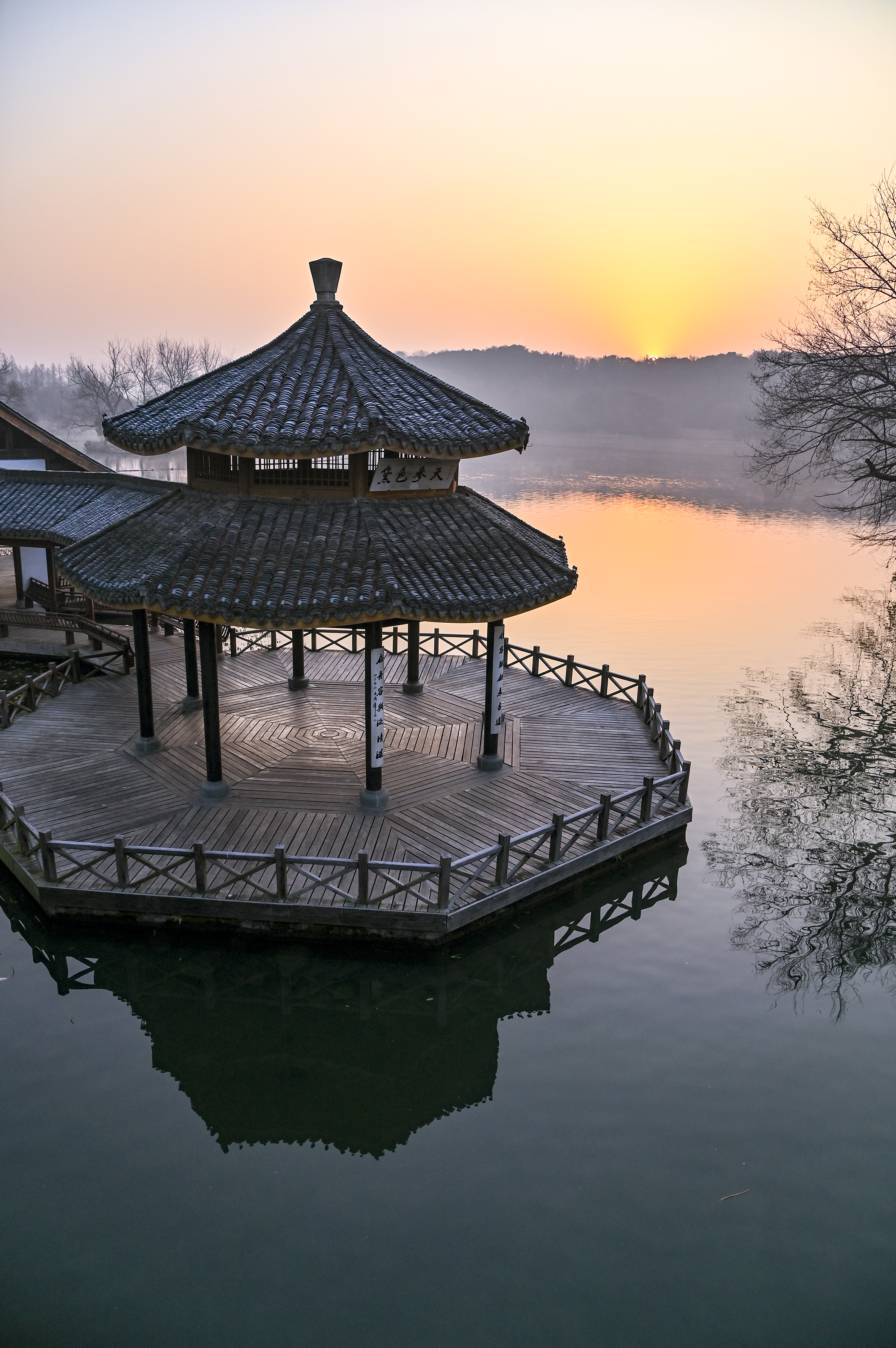 晨雾茅家埠,黛色参天染白霜,初升太阳染红湖山,红霞古亭倒映水面,随手一拍都是宋词里的江南~