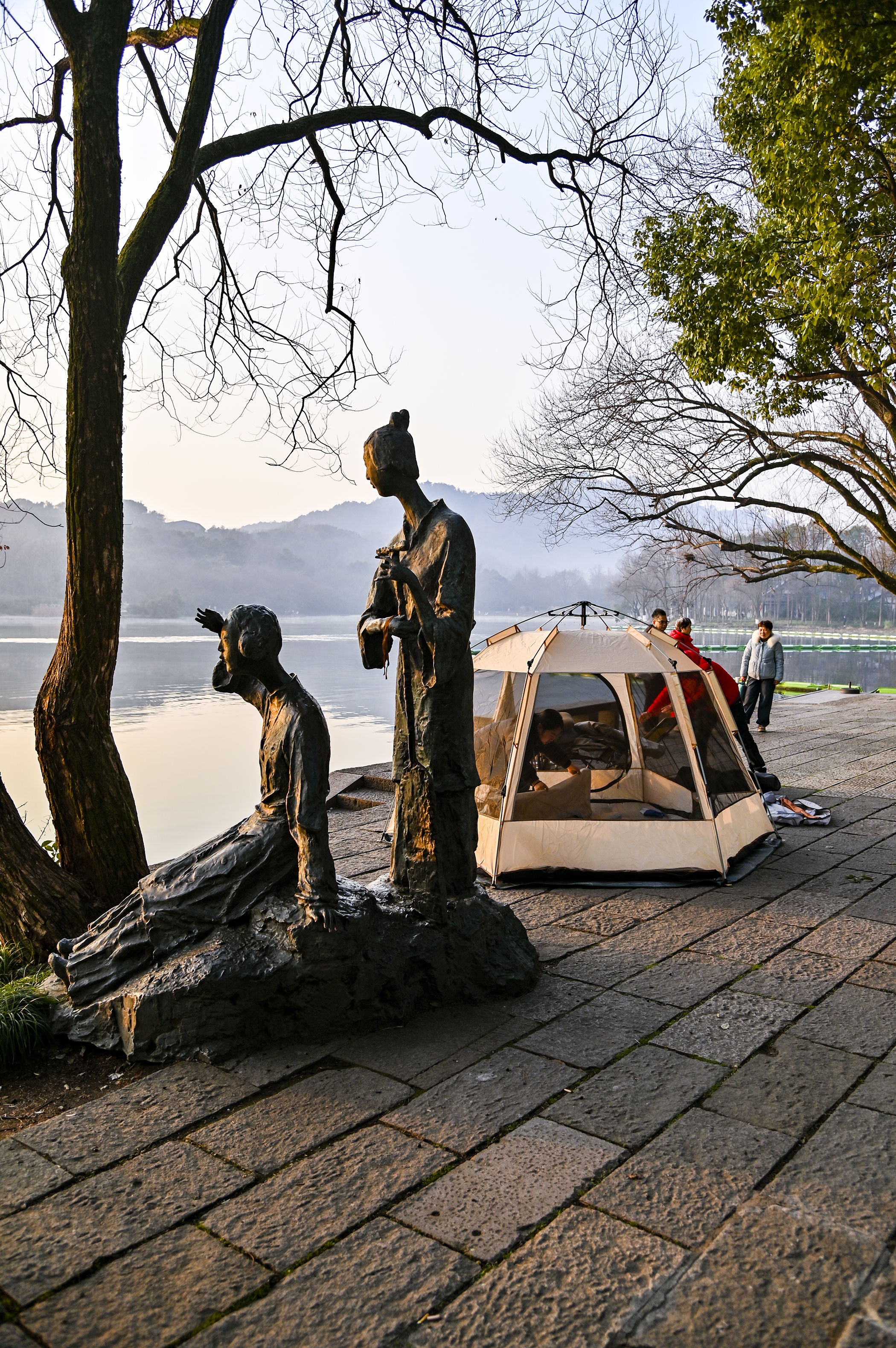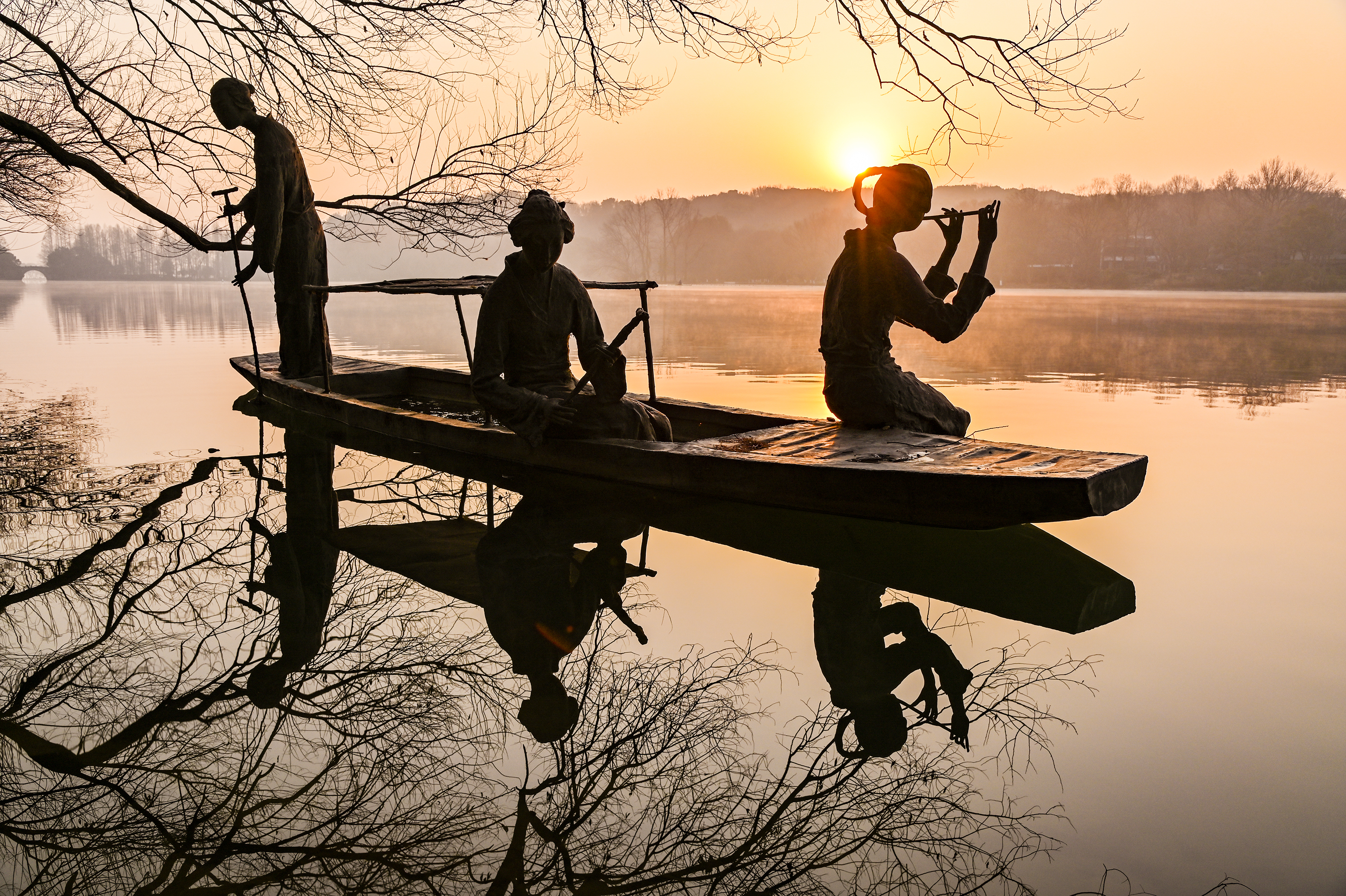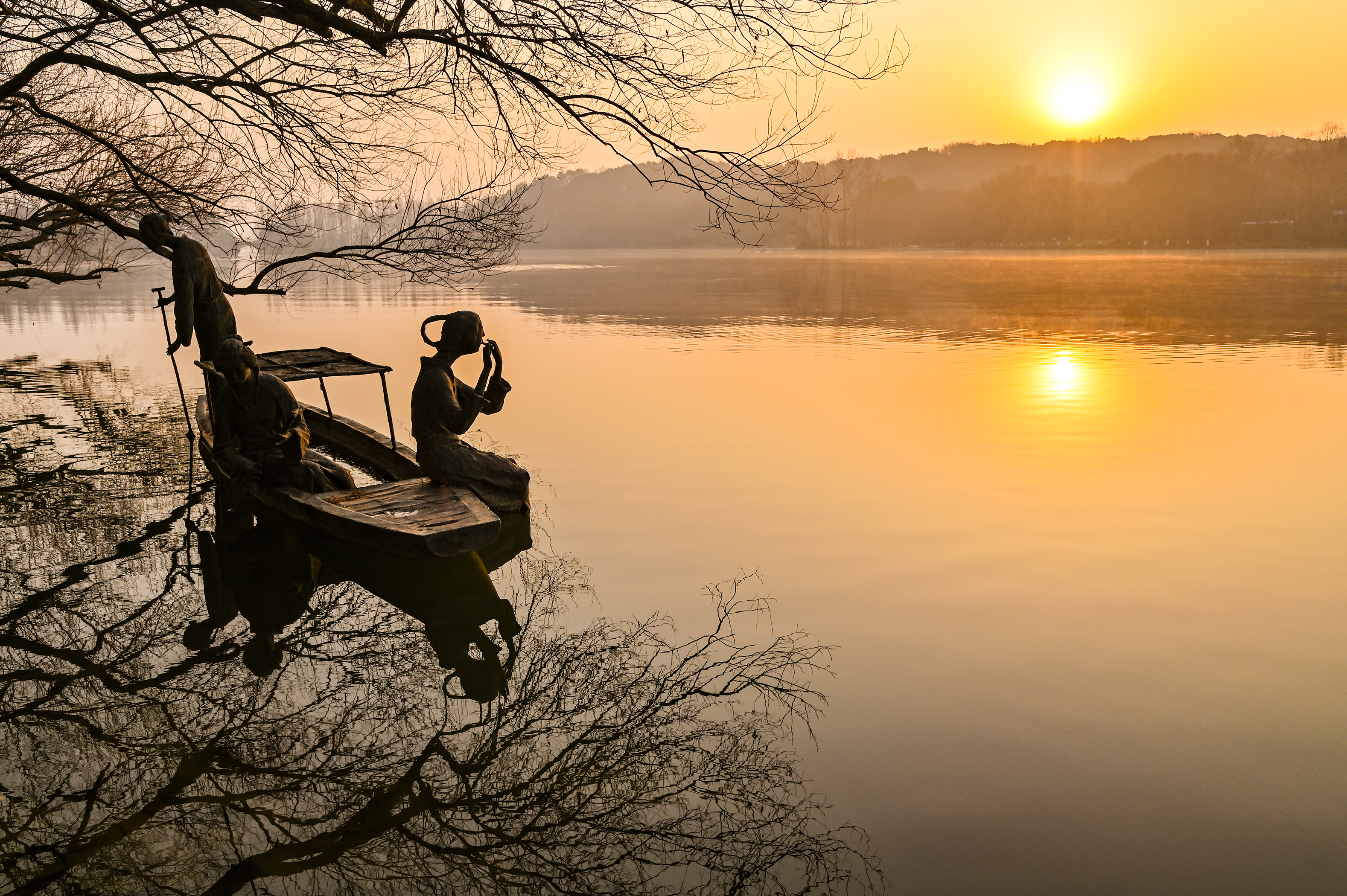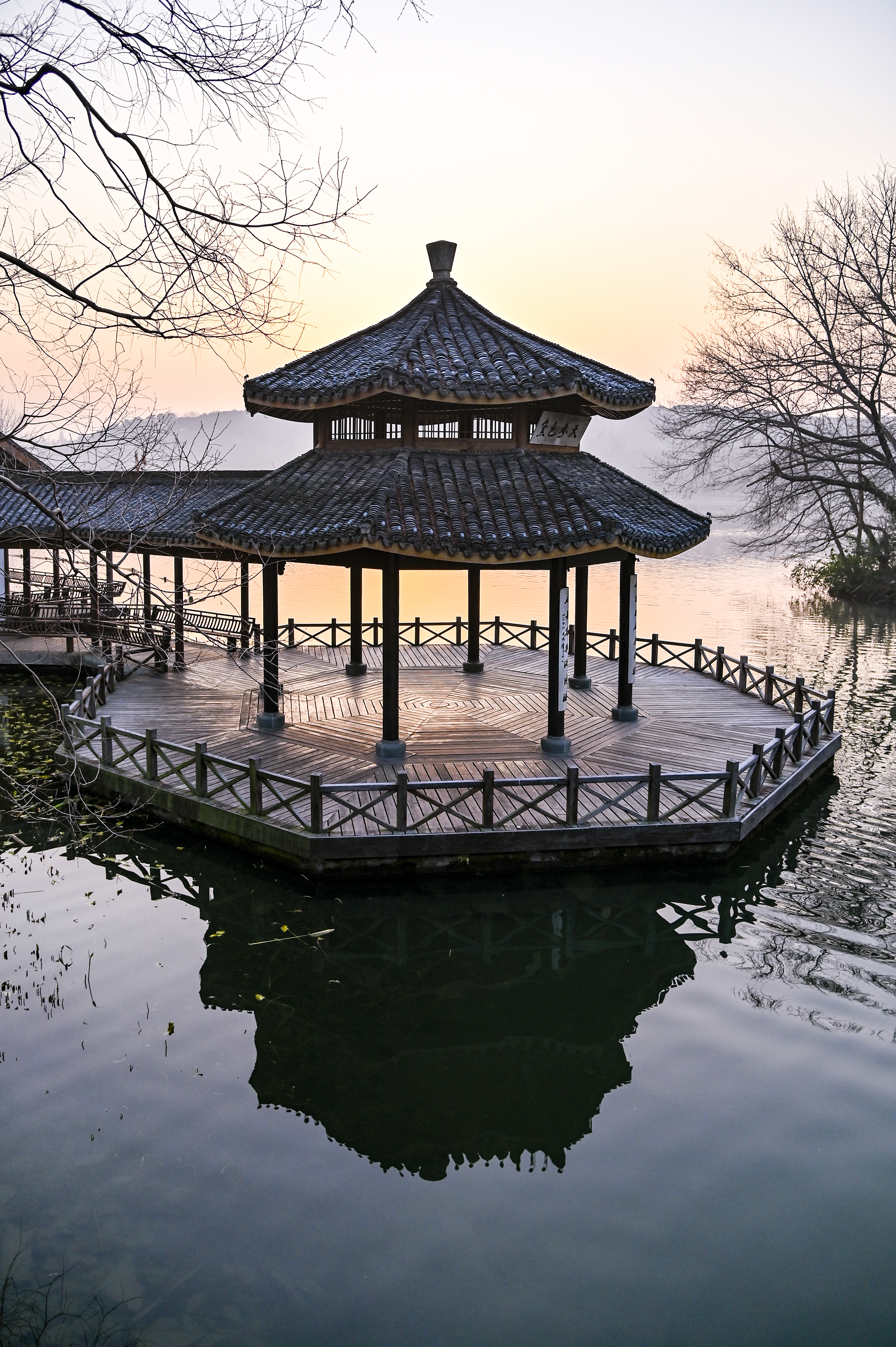 晨雾茅家埠,黛色参天染白霜,初升太阳染红湖山,红霞古亭倒映水面,随手一拍都是宋词里的江南~