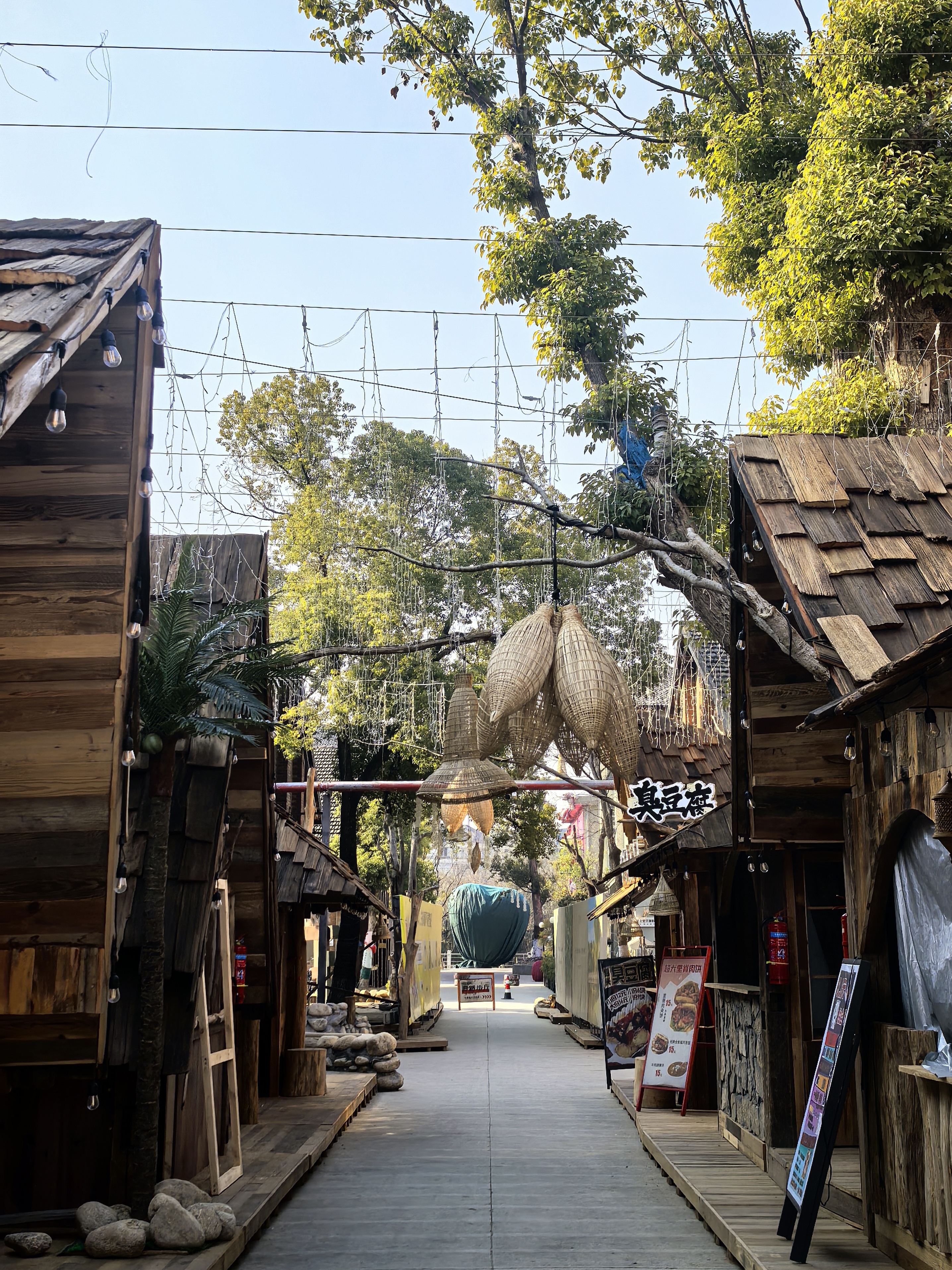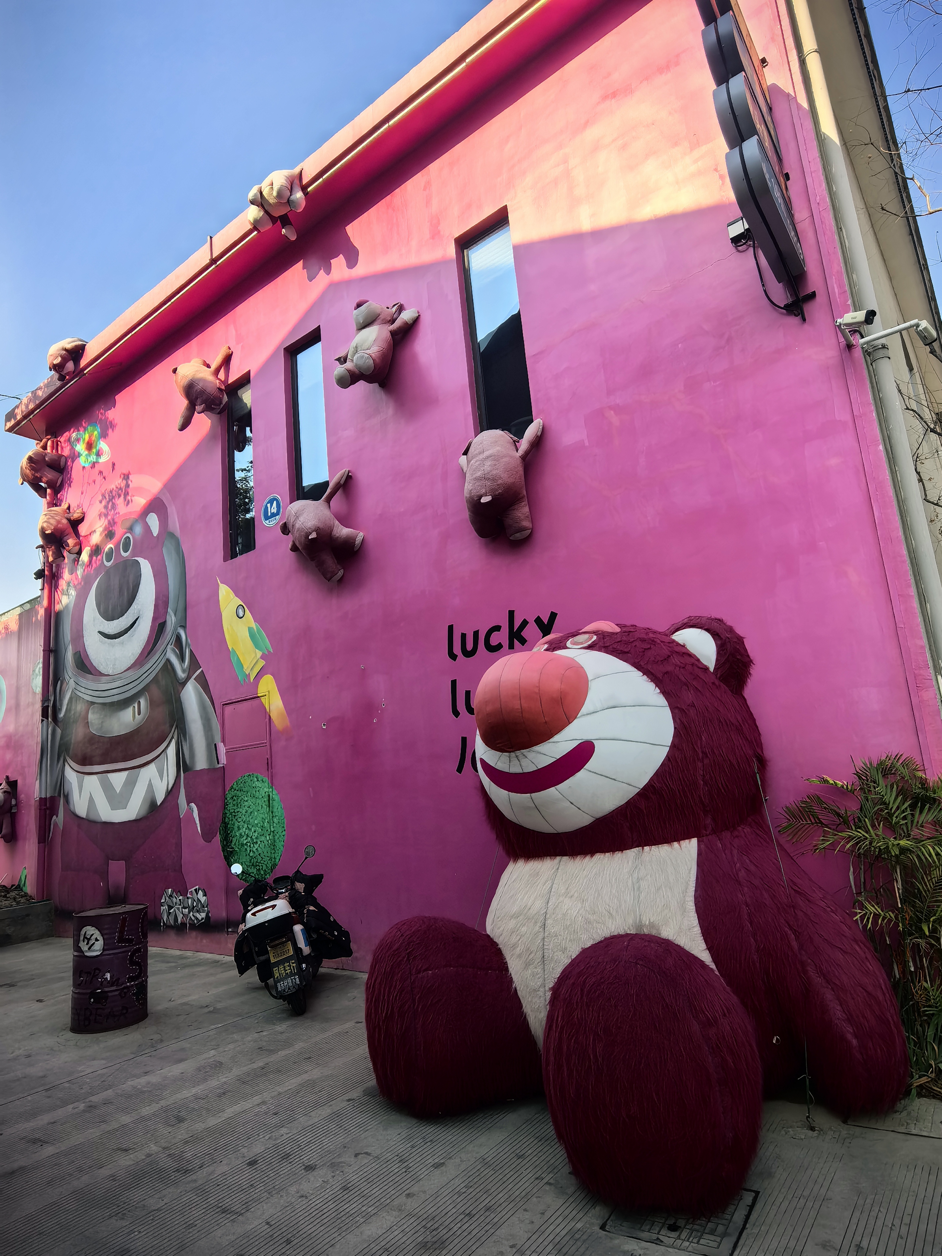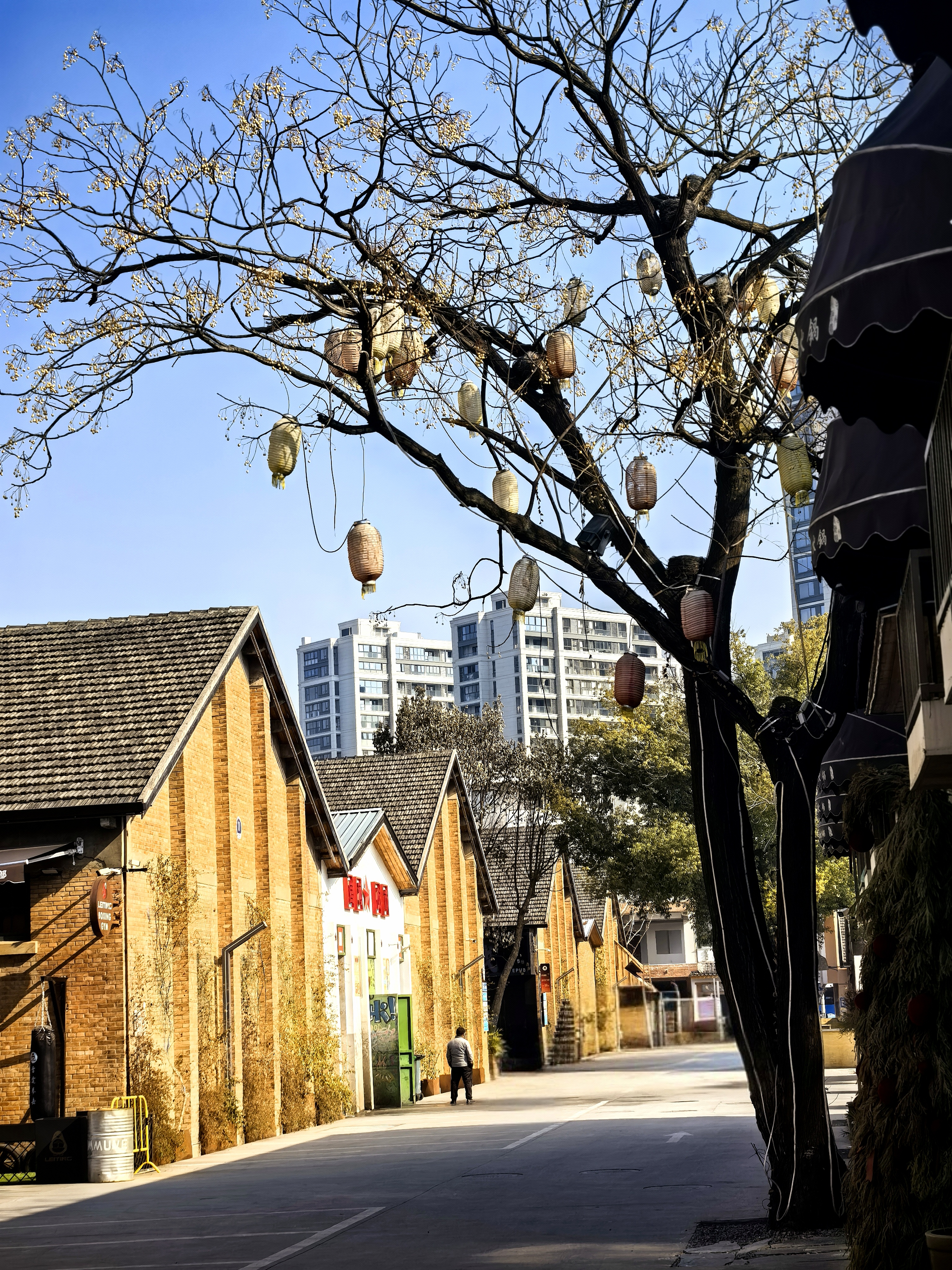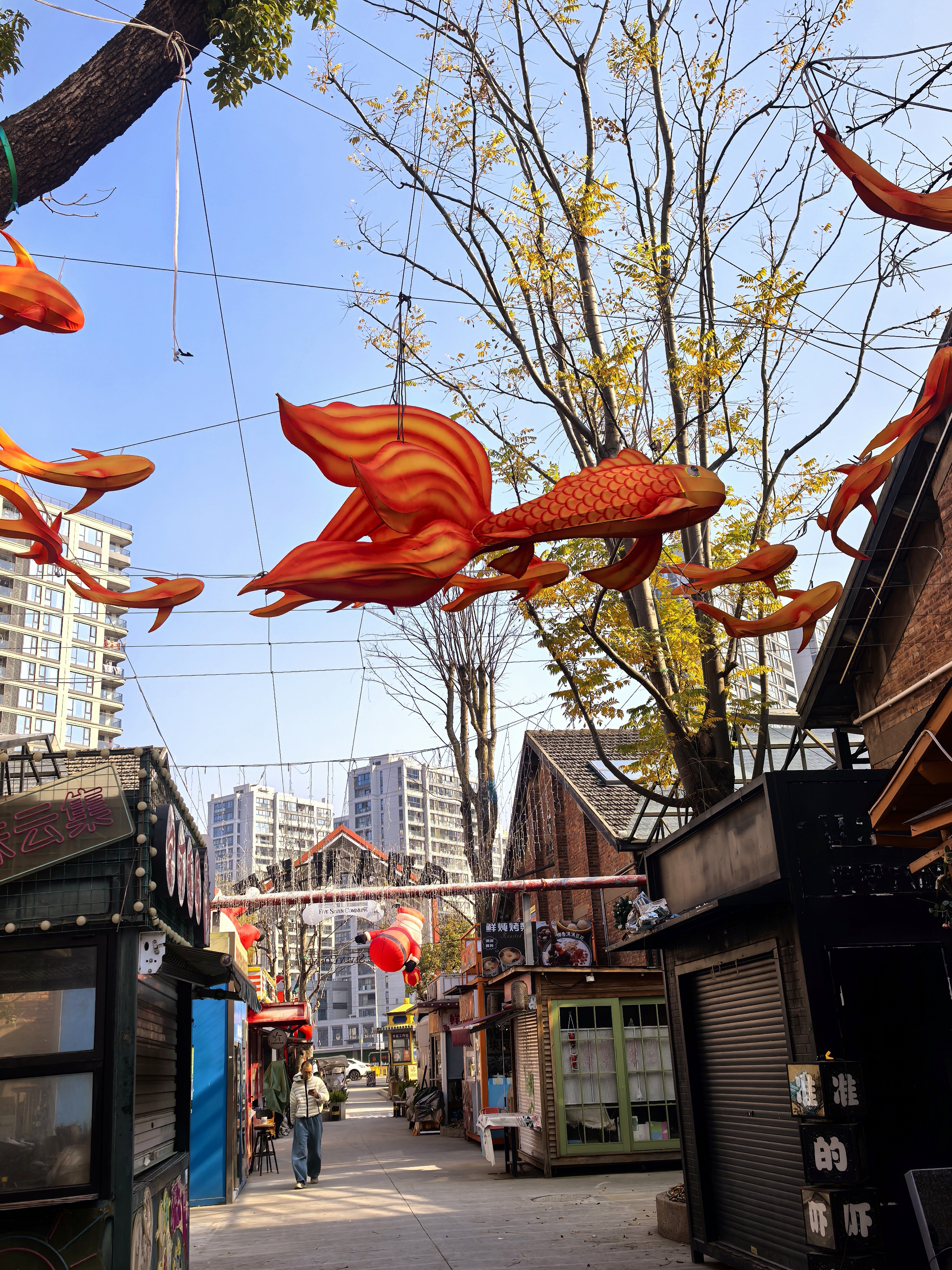 穿行在五七公社的红砖巷陌间,时光的碎片触手可及。这里是昔日供销社的仓库。斑驳的墙体上,墨迹如藤蔓般攀爬着众多杂乱的姓氏,像是被岁月无意间拓印下来的民间族谱。 几条橙红的布艺金鱼却悠然游弋在蓝天里,与巷角的市井招牌相映成趣。废弃的厂房窗棂下,一树灯笼状的果实悬垂在斑驳砖墙前,恍若旧日工厂尚未熄灭的灯盏。 停泊在静水边的蓝船,倒映着对岸彩色的现代公寓;枝头新挂的暖黄灯笼上,墨书恰好应和着墙头那些褪色的姓氏笔划。 粉色的草莓熊和旁边的熊涂鸦自然不能忘记了打卡,这也是五七的标志性景点,还有工业风的创意雕塑,留着时代印记的老厂房,透着萌萌的复古风,都可能是出片的地方。 每当夜幕降临的时候,这里就是夜生活天堂。能想见乐队声起时,老煤球厂如何在光影中重新呼吸。 也许尘封已久的历史,像那株从砖缝探出的绿藤,在工业风的骨架里,持续生长出鲜活而带着烟火气的新芽。