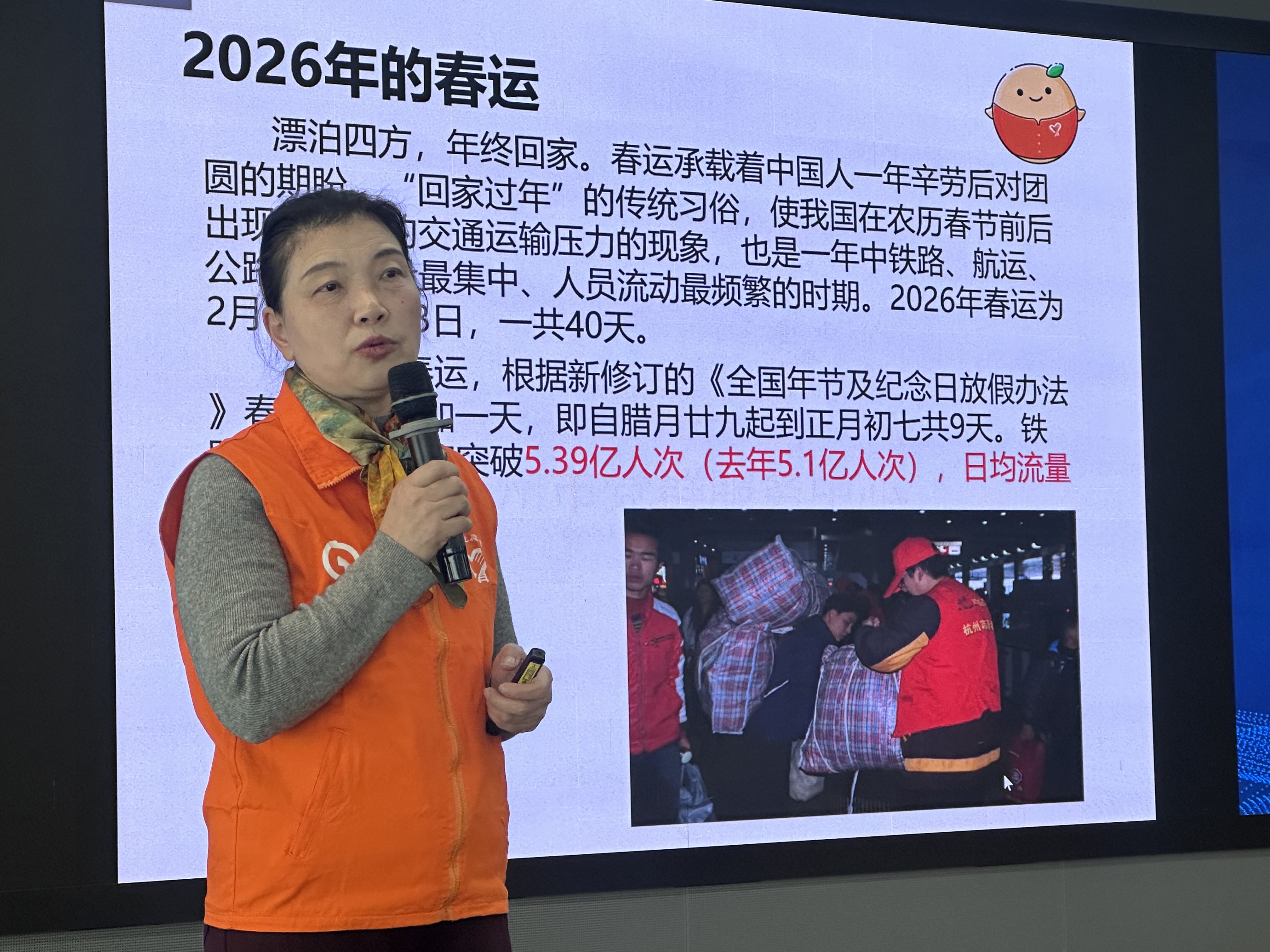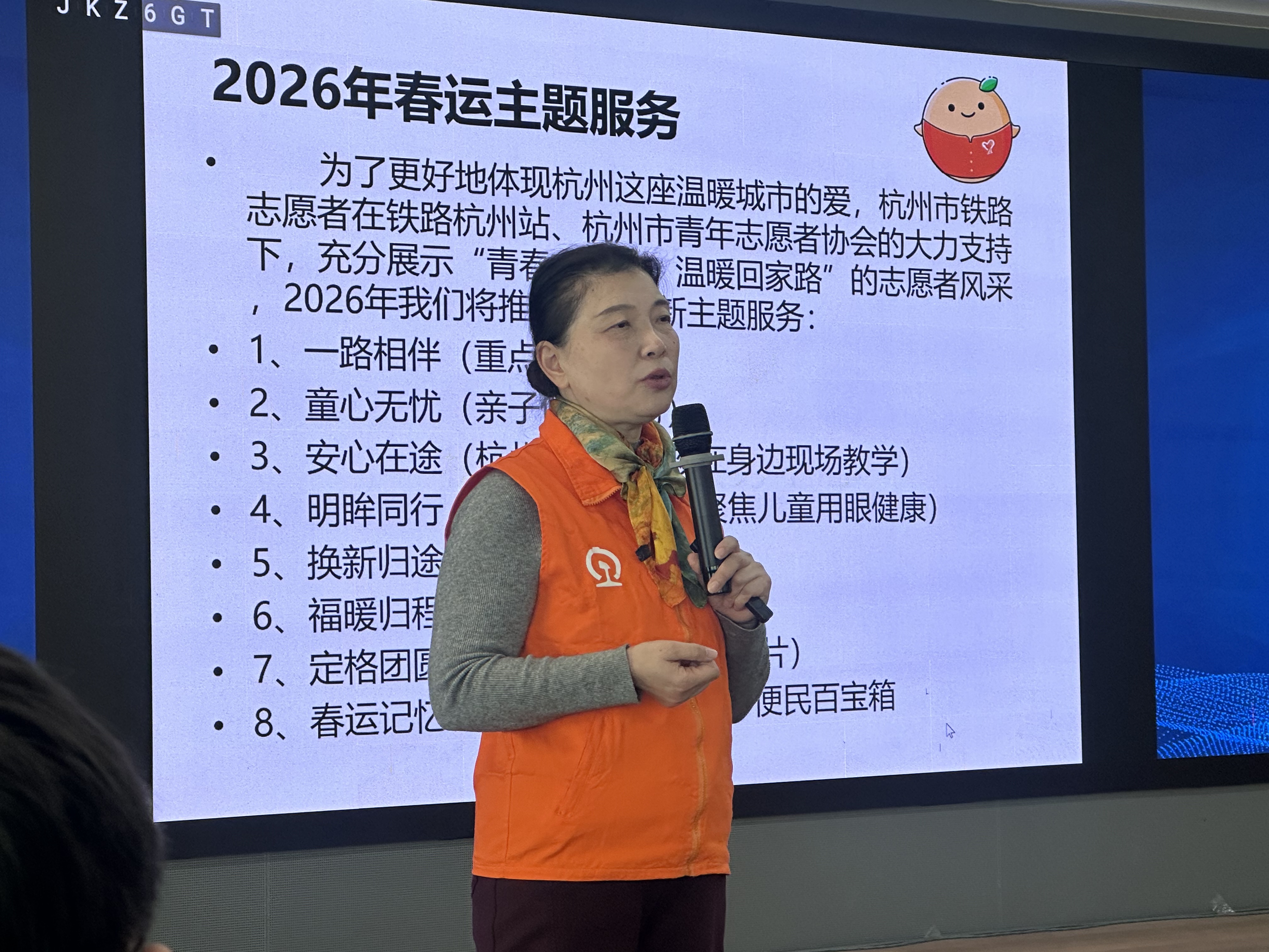 青春志愿行 护航温暖路——2026年杭州站春运志愿服务培训顺利开讲 为扎实做好2026年杭州站春运志愿服务保障工作,切实提升志愿者服务能力与专业素养,1月24日下午,由杭州市志愿者协会联合铁路志愿者协会共同主办的2026年杭州站春运“暖冬行动”“青春志愿行,回家温暖路”志愿服务首场培训,在城市阳台党群中心时代大讲堂正式开讲。本次培训采用线上线下相结合的形式,吸引了360余名志愿者踊跃参与,为即将启动的春运志愿服务注入青春力量。 本次培训由杭州站铁路团市委书记主持,特邀资深培训师顾雅娟授课。培训内容紧密围绕春运志愿服务实际需求,涵盖志愿精神解读、服务礼仪规范、实用服务技能、铁路客运服务专业知识等多个核心模块。顾雅娟培训师结合多年志愿服务指导经验,通过理论讲解、案例分析、场景模拟等多样化方式,深入浅出地向志愿者们传授服务技巧,引导大家深刻理解“奉献、友爱、互助、进步”的志愿精神,掌握与旅客沟通的有效方法、应急情况处置流程及铁路客运关键服务要点,为志愿者们提供了全面系统的能力赋能。 为确保培训质量,检验学习成效,培训结束后立即组织了现场答辩考试,通过理论问答、情景实操等形式,全面考察志愿者对培训内容的掌握程度。此次培训严格执行“培训通过,考试合格”的上岗标准,确保每一位参与春运志愿服务的志愿者都能以专业的素养、饱满的热情投入到服务工作中,为南来北往的旅客保驾护航。 值得一提的是,今年将是银龄互助分会快乐不老服务社第十次参与杭州站春运公益理发服务,王建接、李金生、俞韵祥、马锦妹、孙琴玉、高丽莉、任根生、魏丽华、潘建华、金秀英、金明、金英等12名志愿者经过专项培训后,将在春运期间为旅客提供免费理发服务,用暖心举措为旅途增添温情。 据悉,2026年春运将于2月2日正式启动,此次培训的顺利开展,为春运志愿服务工作奠定了坚实基础。接下来,杭州市志愿者协会与铁路志愿者协会还将根据实际需求开展系列培训,进一步凝聚志愿力量、提升服务水平,让“青春志愿行”真正成为旅客“回家温暖路”上的坚实保障,用志愿服务的温度温暖整个春运。