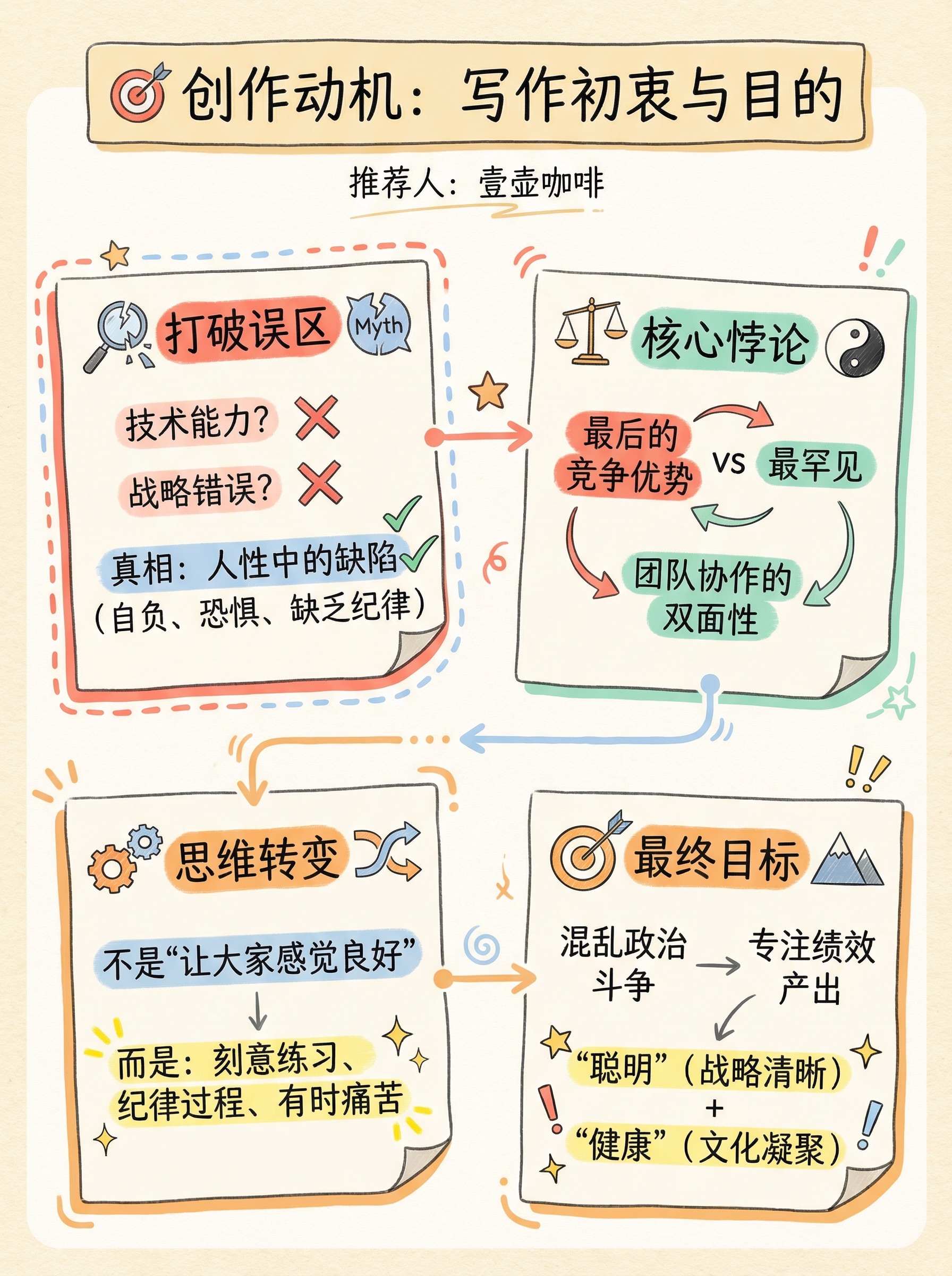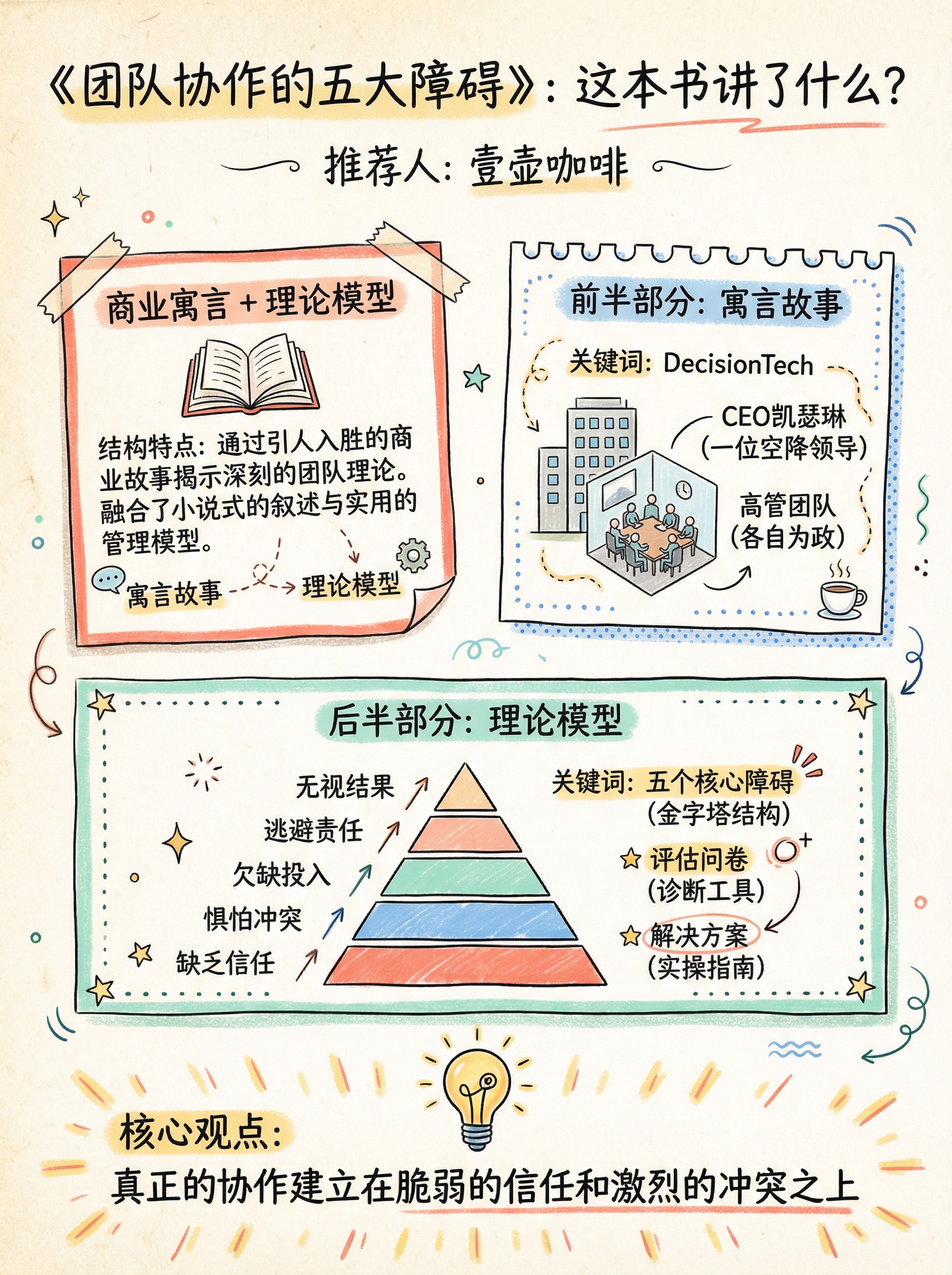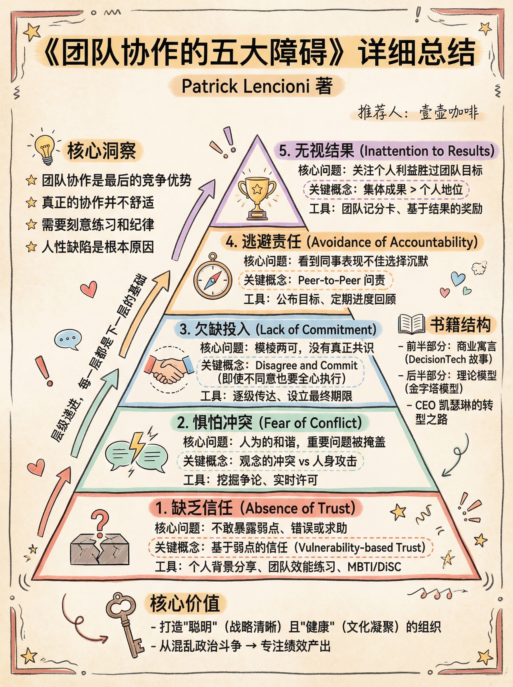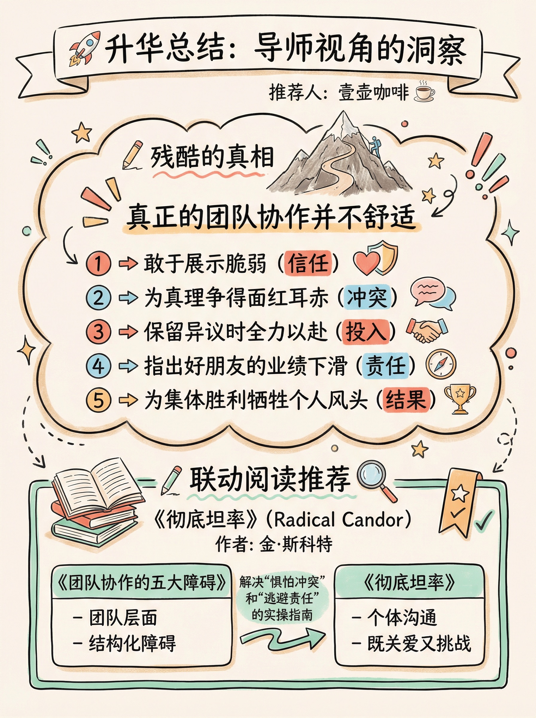 读完《团队协作的五大障碍》才知道,所谓的“没有任何异议”并不是高效团队的证明,反而是危机的开始! 带团队,不需要你是全知全能的超人,也不需要为了虚假的和谐而回避争论。 你需要的是——基于弱点的信任与建设性的冲突。 因为管理团队,其实就是一场人性的修炼,修的是管理者放下“面子”和“自我”的勇气。 这本书不仅仅是一套管理模型,更是一面照妖镜,照出了我们在职场中最不愿面对的恐惧: 为什么我们不敢承认错误?为什么我们哪怕看到问题也选择沉默? 它提醒我们:冲突不是分裂的开始,而是达成真正承诺的必经之路。 今天开会又是只有你一个人在说?成员们总是“没意见”? 没关系,正如书中所说,建立信任是从展示脆弱开始的。试着先向团队承认:“这件事我搞砸了”或者“我需要你们的帮助”。 这本身就是一次极好的“领导力”示范。 愿我们都能成为那个“敢于示弱,却能赢得真心”的管理者。