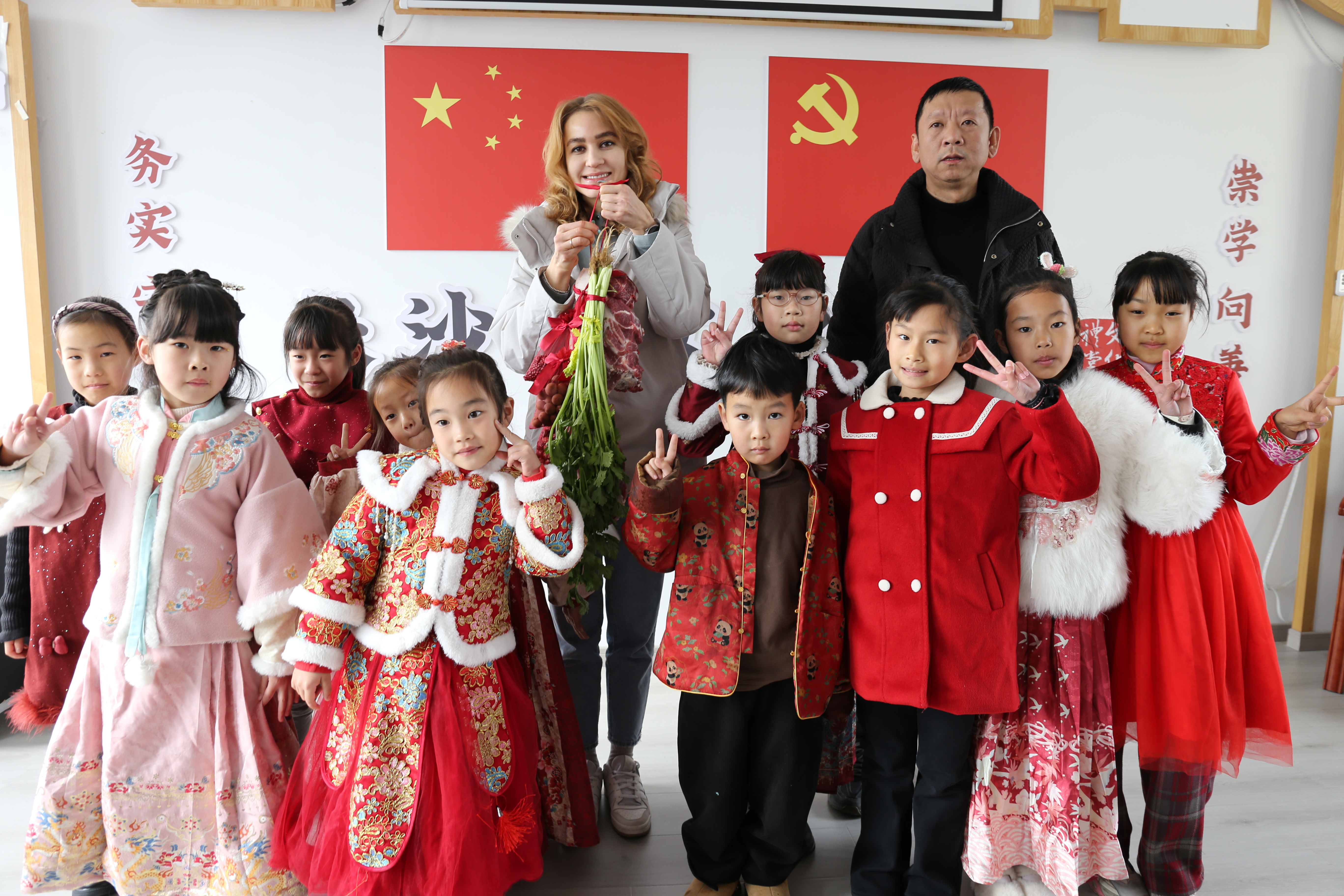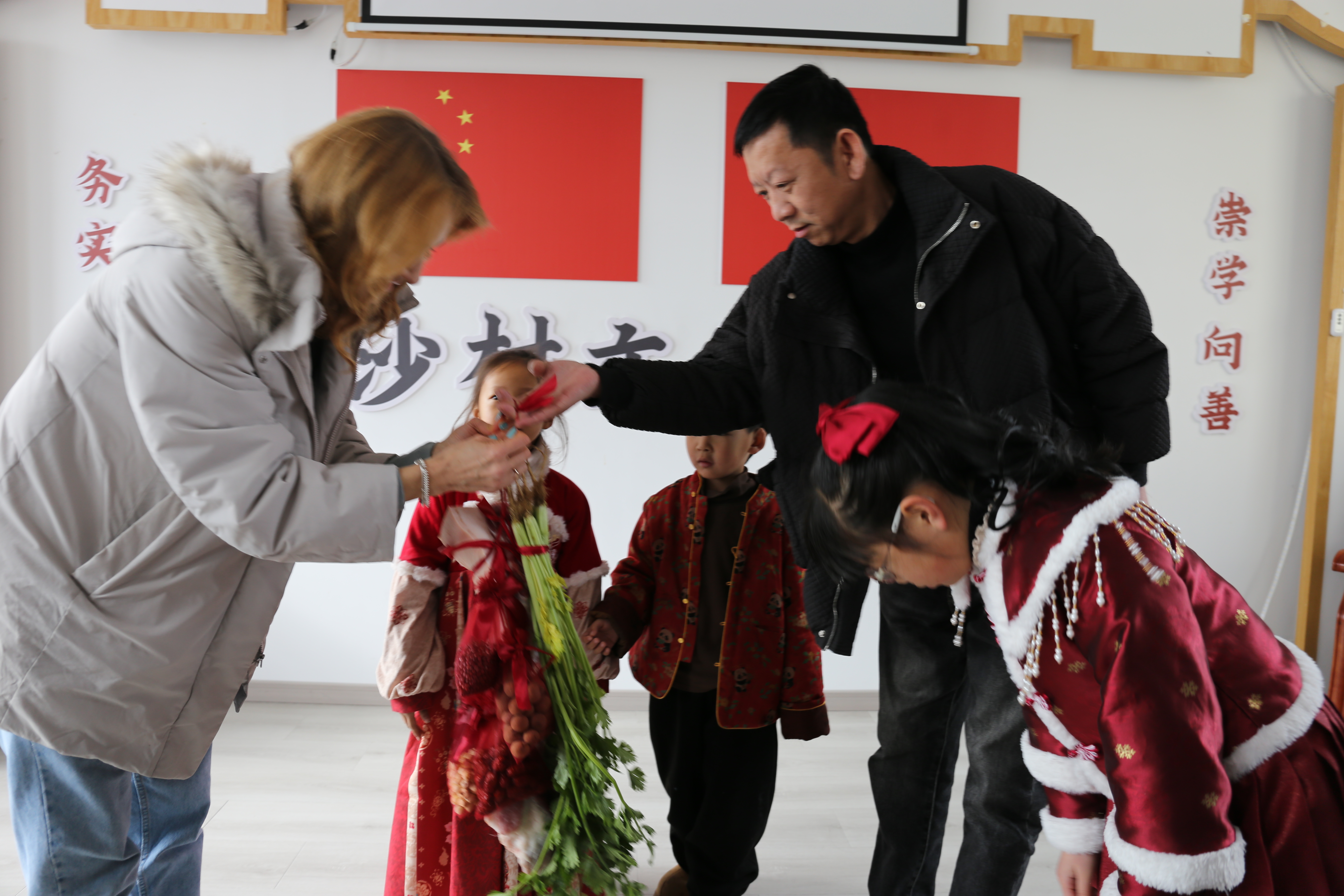 1月24日上午,城南镇长沙村村两委在村文化礼堂举办了一场温馨的特殊谢师活动,村党支部书记潘永康代表全体村民专门感谢城南义工Nastassia,并送上六礼束脩。Nastassia坚持每个周末为村里的中小学生开展公益课程,用爱心与坚守为孩子们的成长助力。活动现场暖意融融,义工与孩子们以及家长们欢聚一堂,一起动手包饺子、挥毫写对联,在欢声笑语的互动中传递感恩之情,让冬日的乡村文化礼堂满溢温情,也让公益的美好在邻里间持续传递。