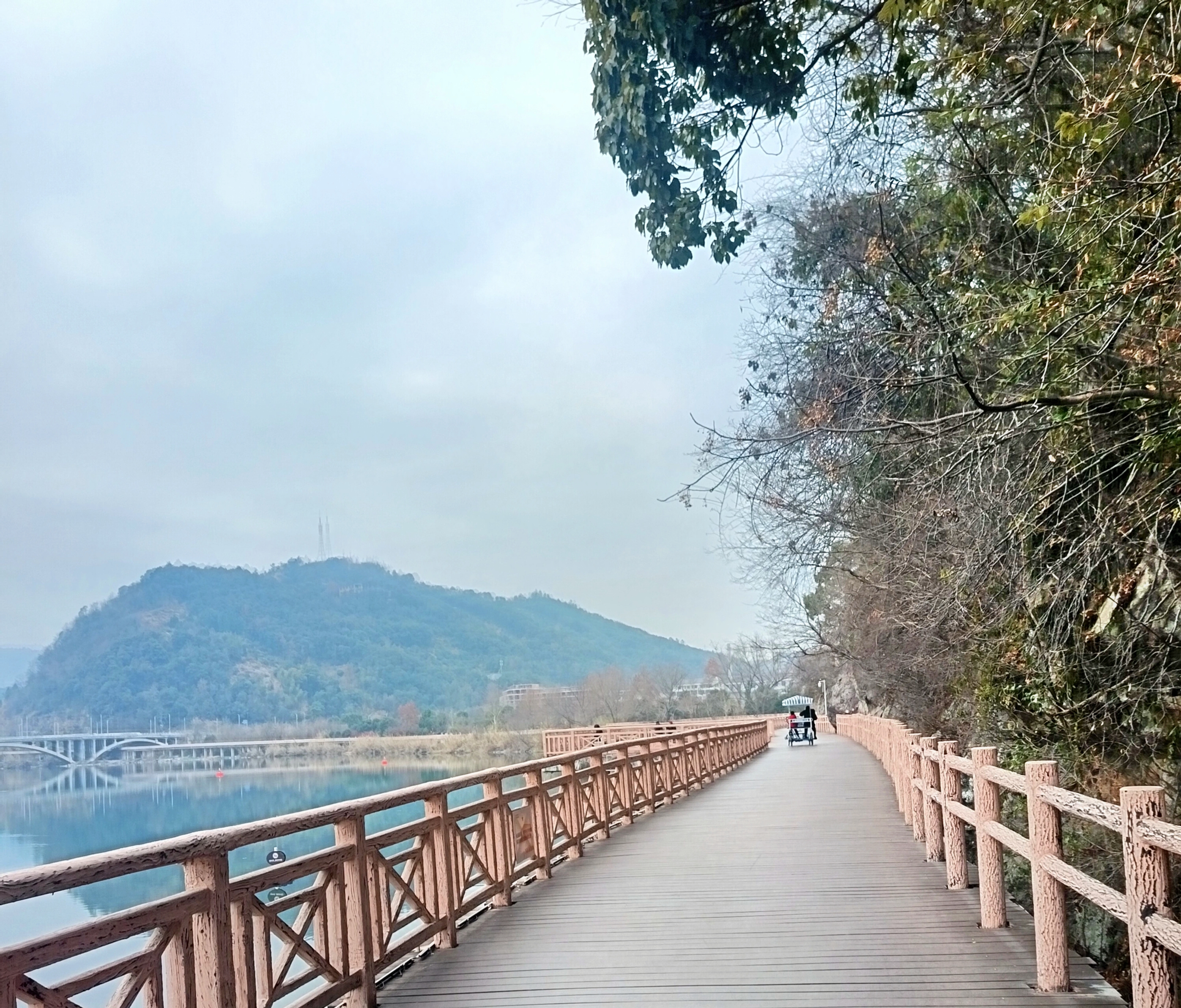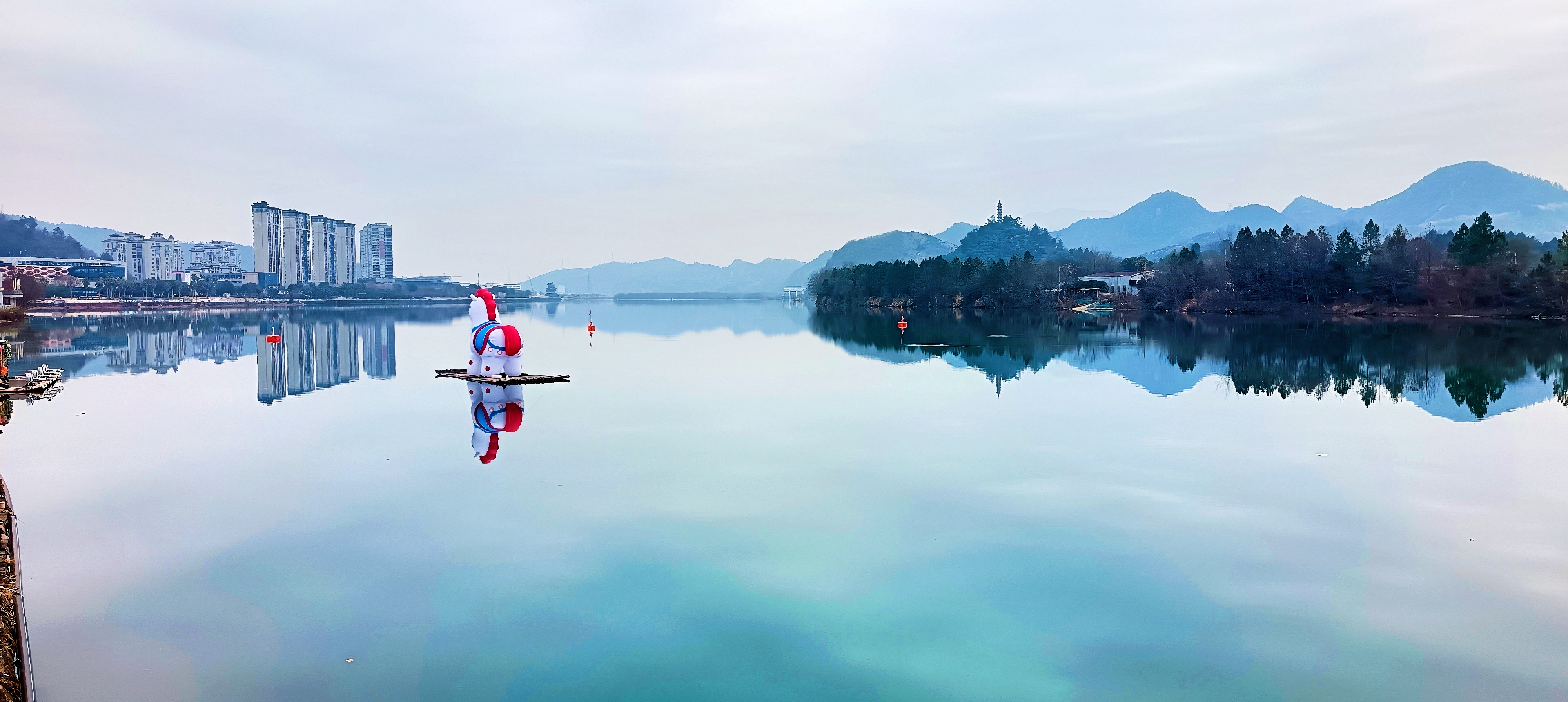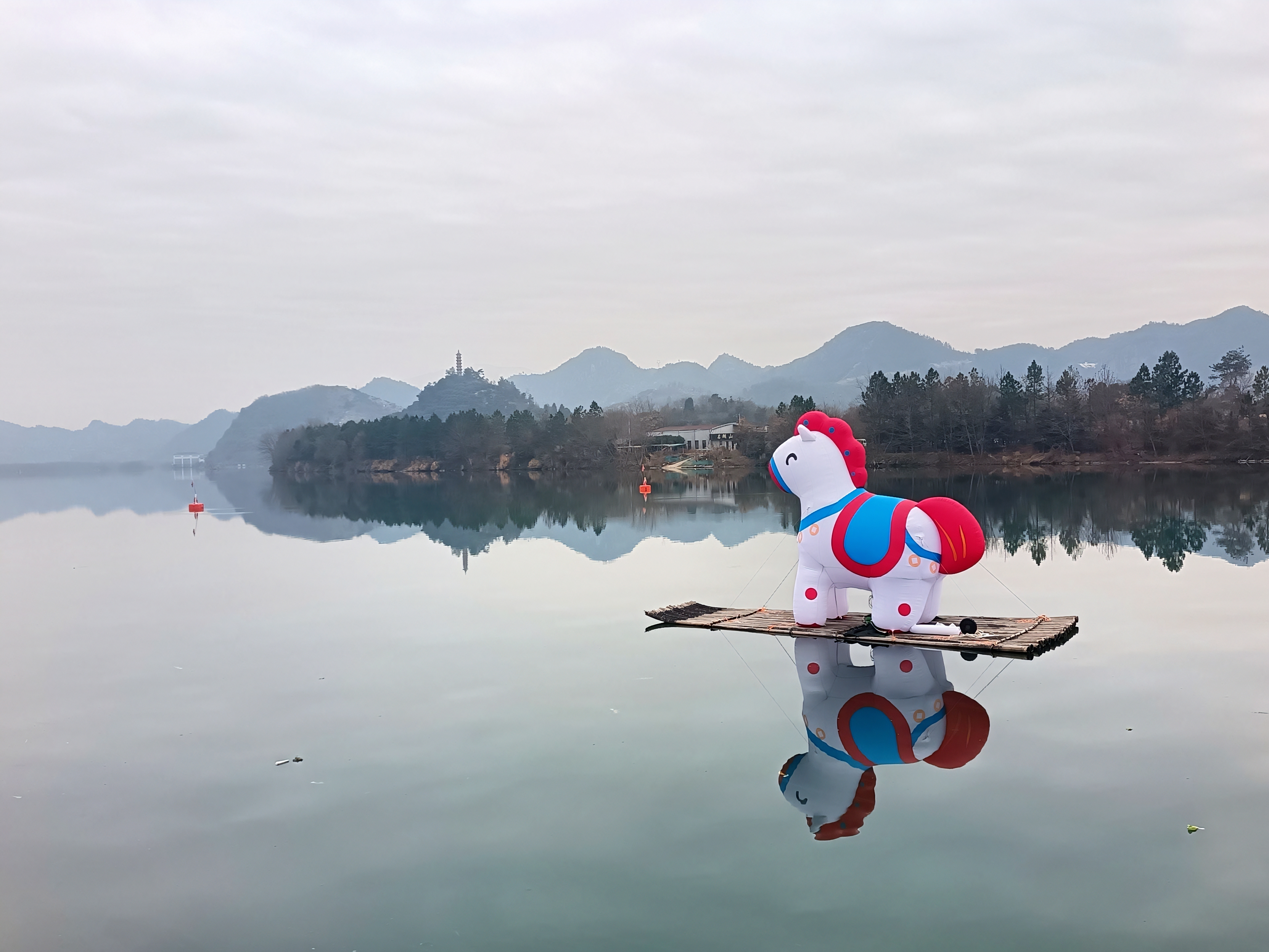 仙居绿道南峰山段冬日随手拍:充气马跃湖面,梅花映竹筏,倒影里山、城、木栈道悄悄对话~
