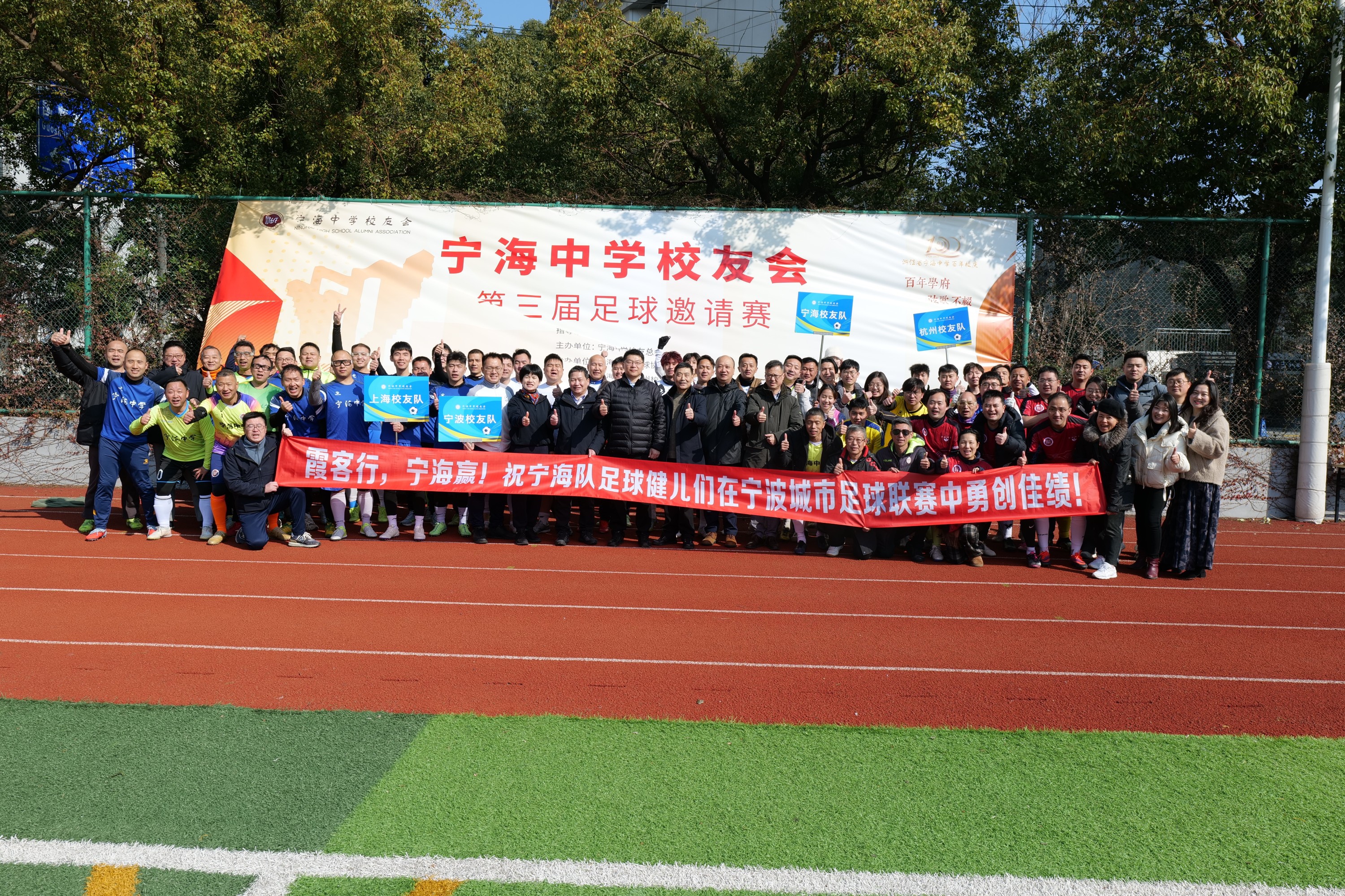 2026年1月24日,宁海中学校友会第三届足球邀请赛在复旦大学邯郸校区足球场热血开赛。上海、杭州、宁波、宁海四地校友代表队跨越山海相聚,以球为媒重叙同窗情,以竞技凝聚同心力,续写“团结、朴实、勤奋、创新”的宁中精神新篇。 上海队与宁海队会师决赛,常规时间难分高下,最终通过点球大战决胜负,上海队摘得桂冠,宁海队斩获亚军,杭州队与宁波队并列季军。