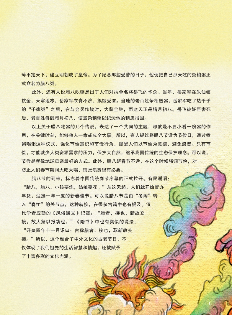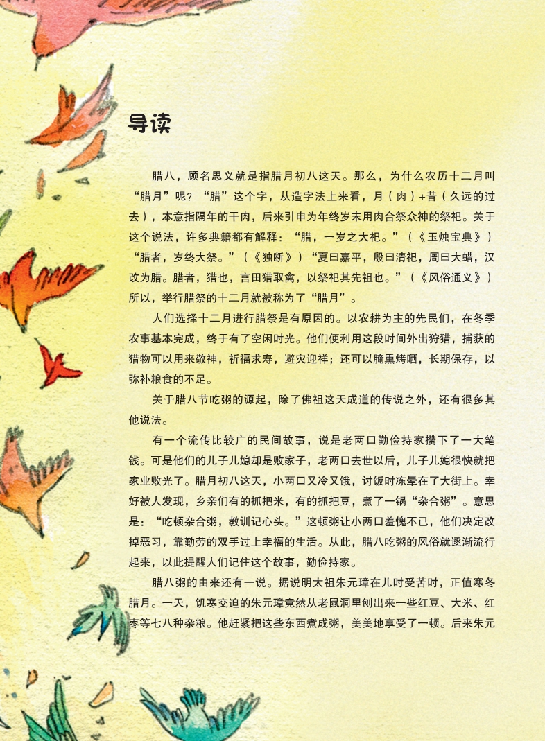 《腊八》(节日里的中国)一书是潮新闻悦视听版块新一期阅读挑战推荐阅读书目之一,今天正好是腊八,来阅读一下这本书。 一、主要内容 这本书是“节日里的中国”绘本丛书中的一册,专为亲子阅读打造。它以腊八节为核心,从“腊月”的字源与祭祀传统讲起,串联起多个关于腊八节的传说与习俗: - 佛陀成道的起源故事:两名牧牛女子以乳糜供养佛陀,使其在腊月初八成道,这一行为演变为喝腊八粥的习俗。 - 民间劝善故事:败家子在腊八日受乡亲“杂合粥”点化,重拾勤俭家风。 - 朱元璋的典故:朱元璋落难时从鼠洞刨粮煮粥,称帝后将此粥命名为“腊八粥”以纪念过往。 - 纪念岳飞的传说:百姓为岳家军送“千家粥”,此后每逢腊月初八便煮杂粮粥缅怀岳飞。 除了传说,书中还介绍了腊八节作为春节序幕的文化意义,以及“过了腊八就是年”的民俗内涵,传递了节俭惜福、传承文化的核心思想。 二、作者与绘者简介 - 文字作者:孙亚敏 儿童文学创作者,擅长将传统民俗转化为适合孩子理解的文字,在“节日里的中国”系列中负责文本创作,注重故事的趣味性与文化深度的平衡。 - 绘者:Amber Ma(马欣然) 旅美自由插画师,毕业于纽约视觉艺术学院。她擅长用水彩营造奇幻童趣的画面,笔下人物与场景充满灵动的想象力,融合了东方审美与现代插画技法,作品曾获多项国际插画奖项。 三、写作与创作特点 1. 内容结构清晰 以“导读+故事+拓展”的形式展开,先解释节日的文化根源,再用多个传说丰富内容,最后延伸到民俗与现实意义,适合亲子共读时循序渐进地理解文化。 2. 故事性与知识性结合 将抽象的文化知识融入生动的民间故事,既满足孩子的阅读兴趣,又能让家长在共读中传递传统价值观。 3. 插画风格独特 Amber Ma的水彩插画色彩浓烈饱满,人物造型夸张灵动,融入了中国传统纹样与奇幻元素,让画面充满视觉冲击力,契合儿童的审美偏好。 4. 亲子互动设计 附赠的“亲子阅读”手册包含游戏与拓展内容,能引导孩子动手实践,深化对腊八节的认知,增强亲子间的文化互动。
