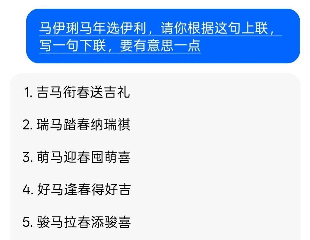 马伊琍马年选伊利。上联太有梗,我火速掏出AI来应战!截图为证,这波AI对的下联居然意外工整?!不得不说科技狠活有点东西,你们的AI给出了什么神仙答案?