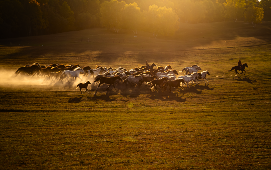 夕阳熔金,群马奔腾于无垠草野,尘土在光里升腾成诗。牧马人的剪影掠过林缘,骏马鬃毛翻飞如焰。光影交错间,大地呼吸,生命奔涌——这壮阔的黄昏,是自然写给自由最炽热的情书。