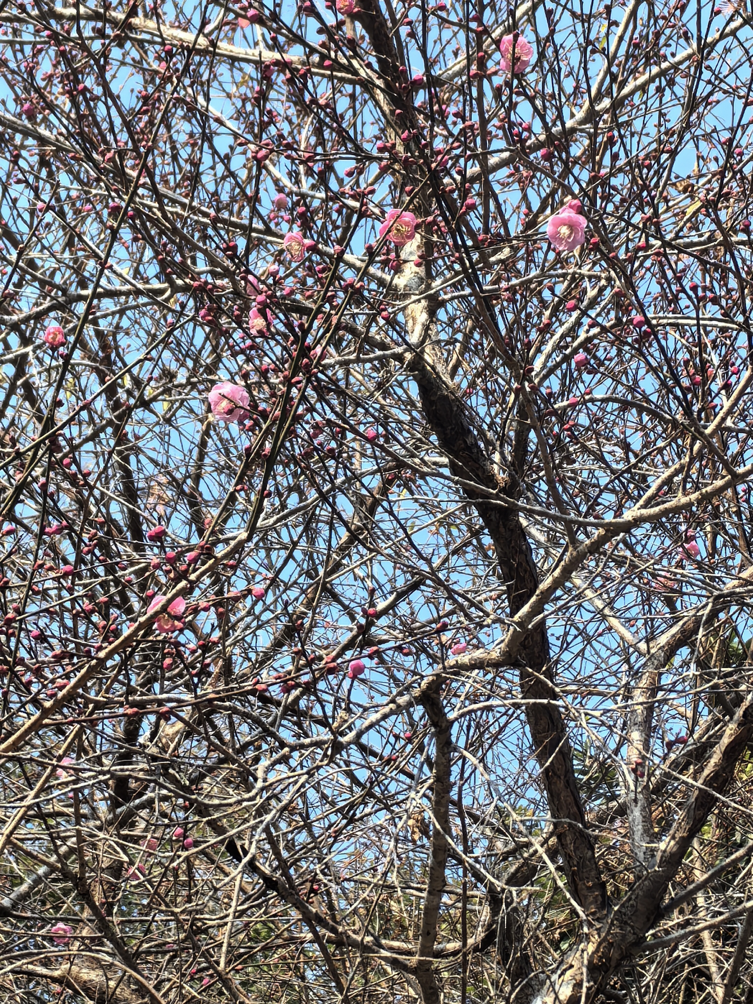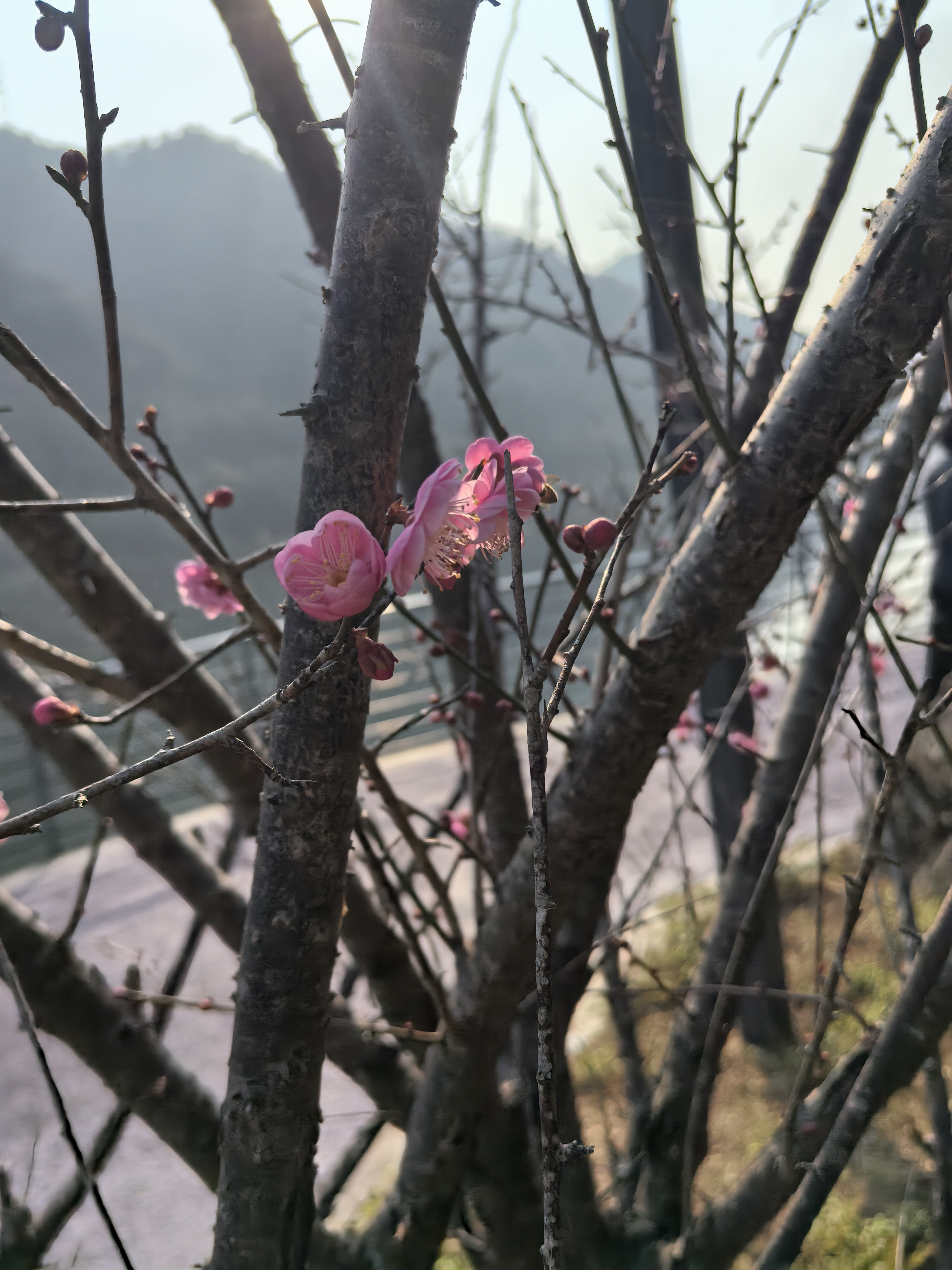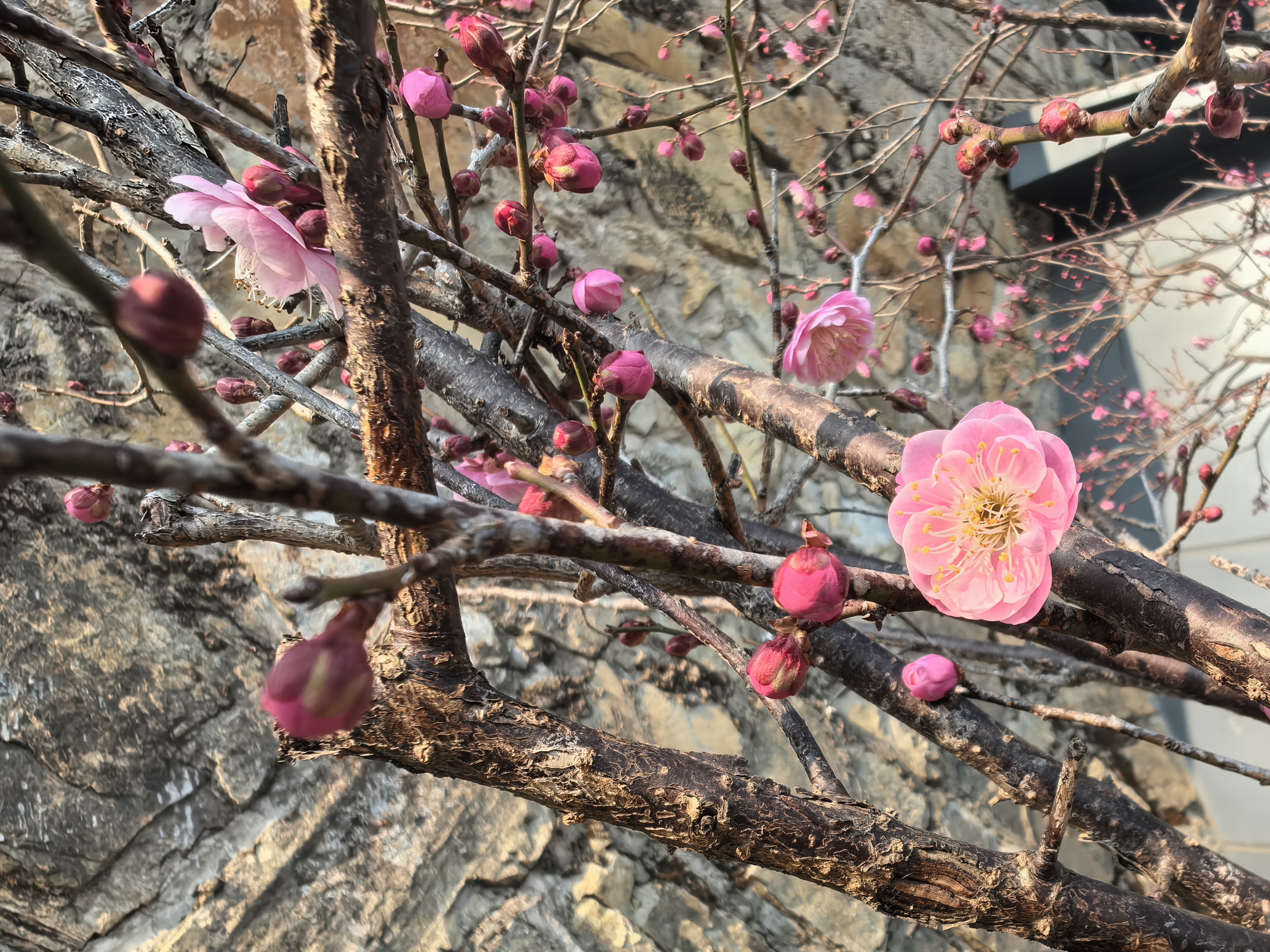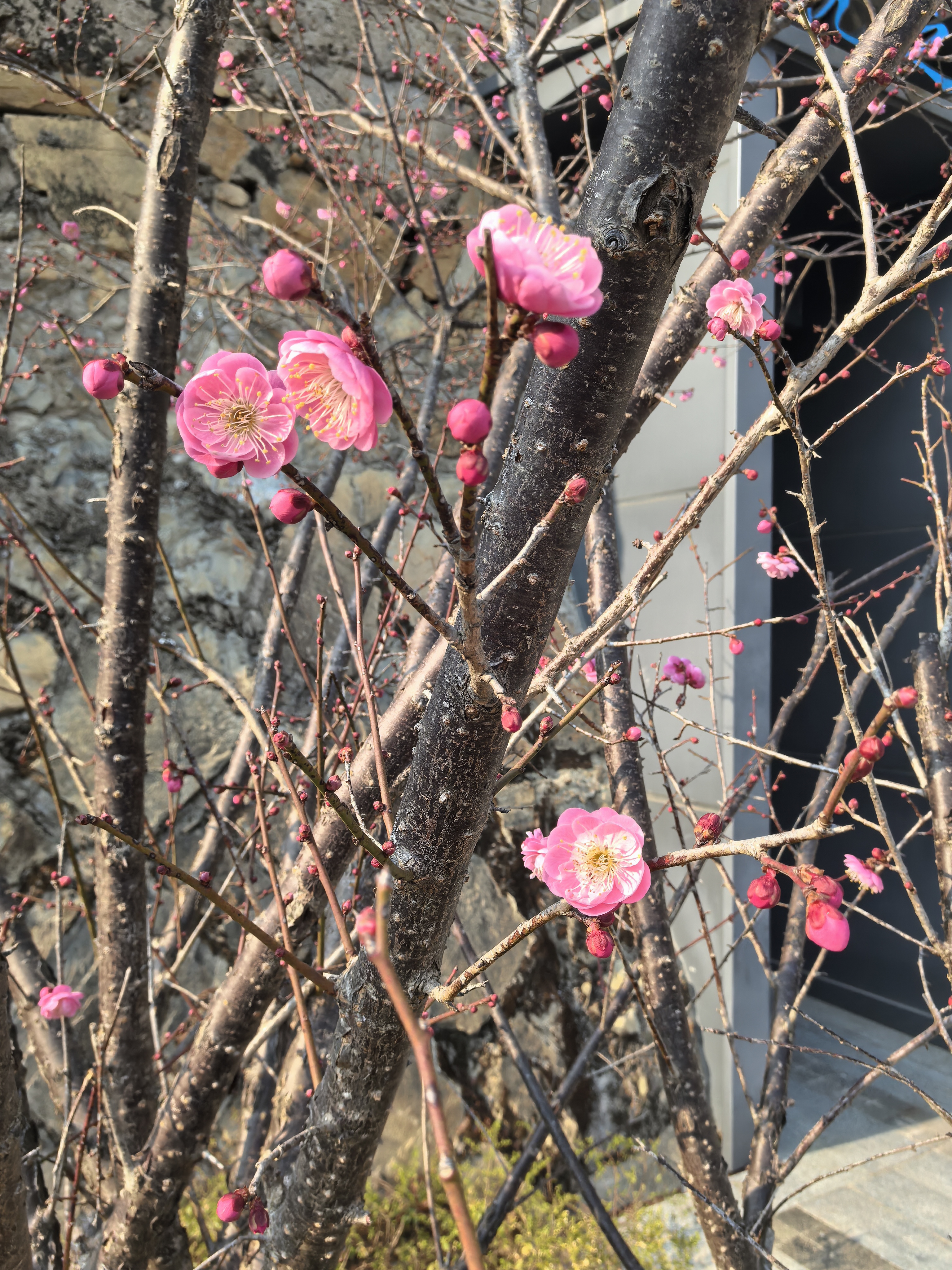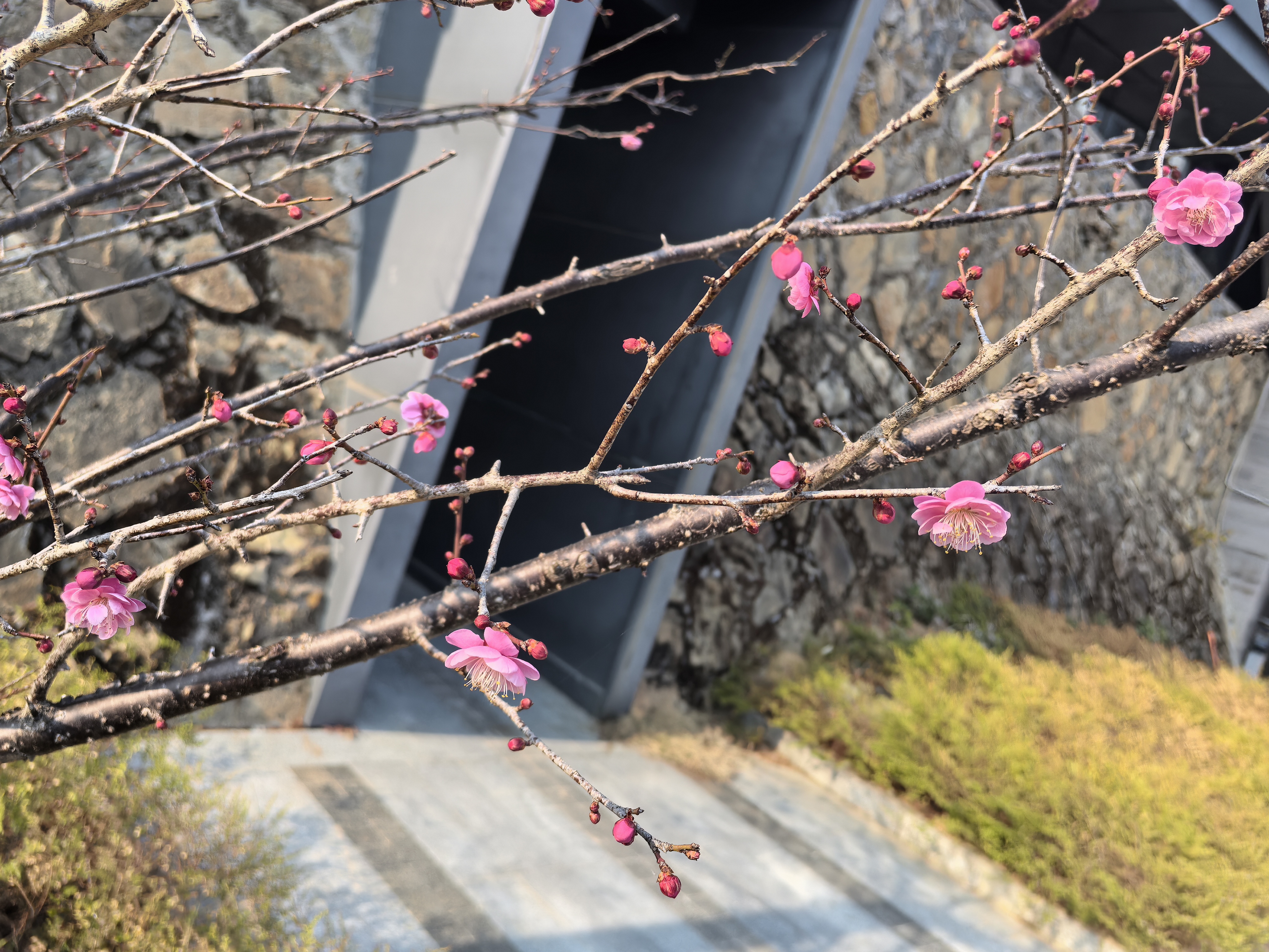 粉瓣初绽映石墙,湖光山色共梅香;枯枝新芽间,春在绿湖静处悄然流淌。