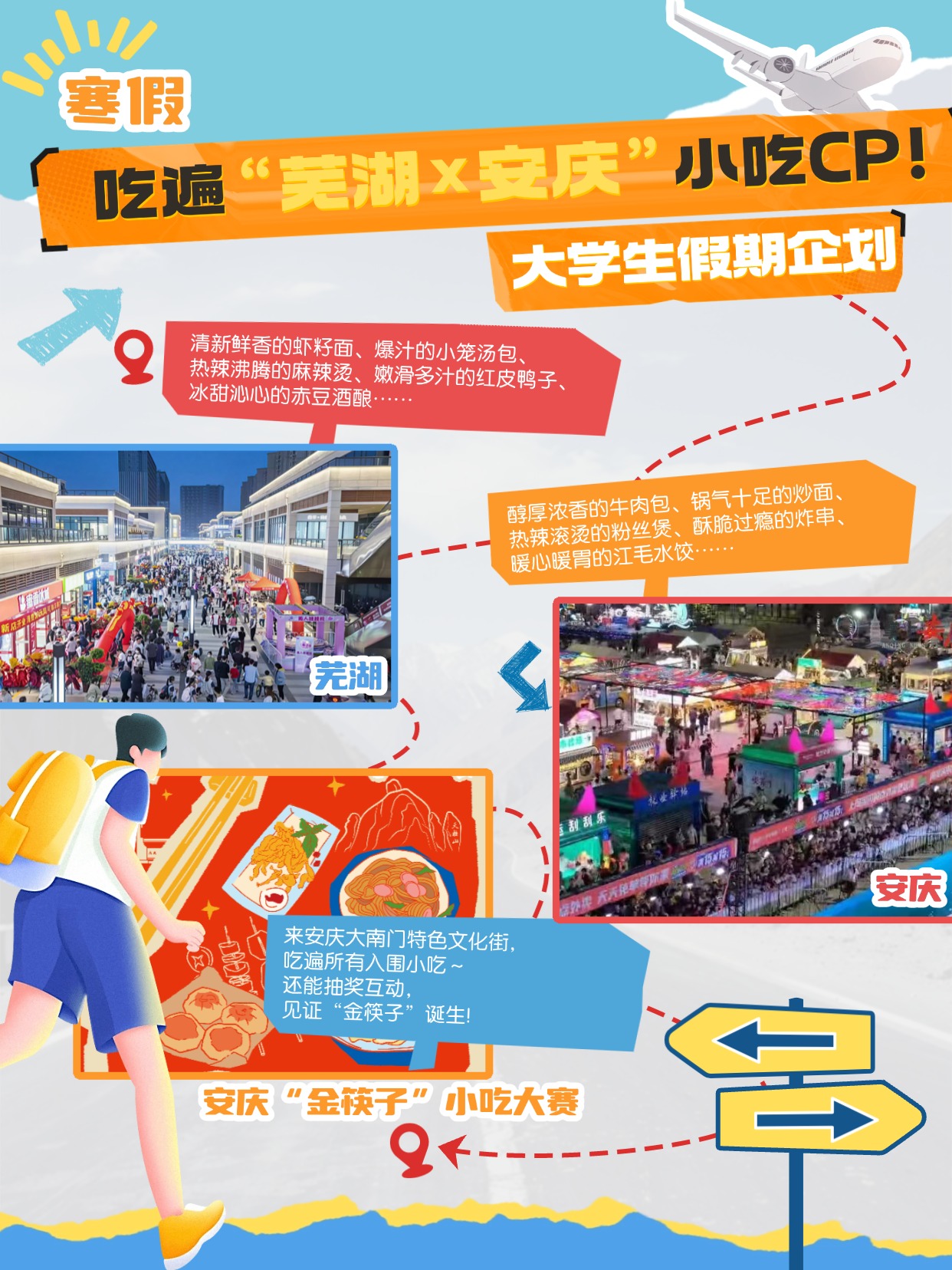 大学生假期企划!吃遍“芜湖×安庆” 大学生假期企划!吃遍“芜湖×安庆”小吃CP 大学生的快乐是什么? 是假期!是出发!是“想吃的东西立刻吃到”! 这个假期,沿长江一路吃遍“芜湖×安庆”小吃CP! ✅ 提前收好这份CP清单 “打饱嗝CP”——安庆大南门牛肉包+芜湖虾籽面 “鲜脆CP”——安庆老鸡汤泡炒米+芜湖酥烧饼 “碳水CP”——安庆炒面+芜湖小笼汤包 “冷热CP”——安庆粉丝煲+芜湖赤豆酒酿 “香辣CP”——安庆炸串+芜湖麻辣烫 “油光CP”——安庆江毛水饺+芜湖红皮鸭子 …… 第一站→芜湖 清新鲜香的虾籽面、爆汁的小笼汤包、 热辣沸腾的麻辣烫、嫩滑多汁的红皮鸭子、 冰甜沁心的赤豆酒酿…… 早餐到夜宵,顿顿不重样! 第二站→安庆 醇厚浓香的牛肉包、锅气十足的炒面、 热辣滚烫的粉丝煲、酥脆过瘾的炸串、 暖心暖胃的江毛水饺…… 从街头,一路香到巷尾! 终点站→“金筷子”小吃大赛现场 3月1日,来安庆大南门特色文化街,吃遍所有入围小吃~ 还能抽奖互动,见证“金筷子”诞生! 青春没有售价,快乐吃饭就在当下! 这个假期,@你的饭搭子,一起出发! #安庆金筷子小吃大赛#安庆芜湖小吃CP#宝藏小城#大学生美食出游攻略#寒假#安庆美食#芜湖美食