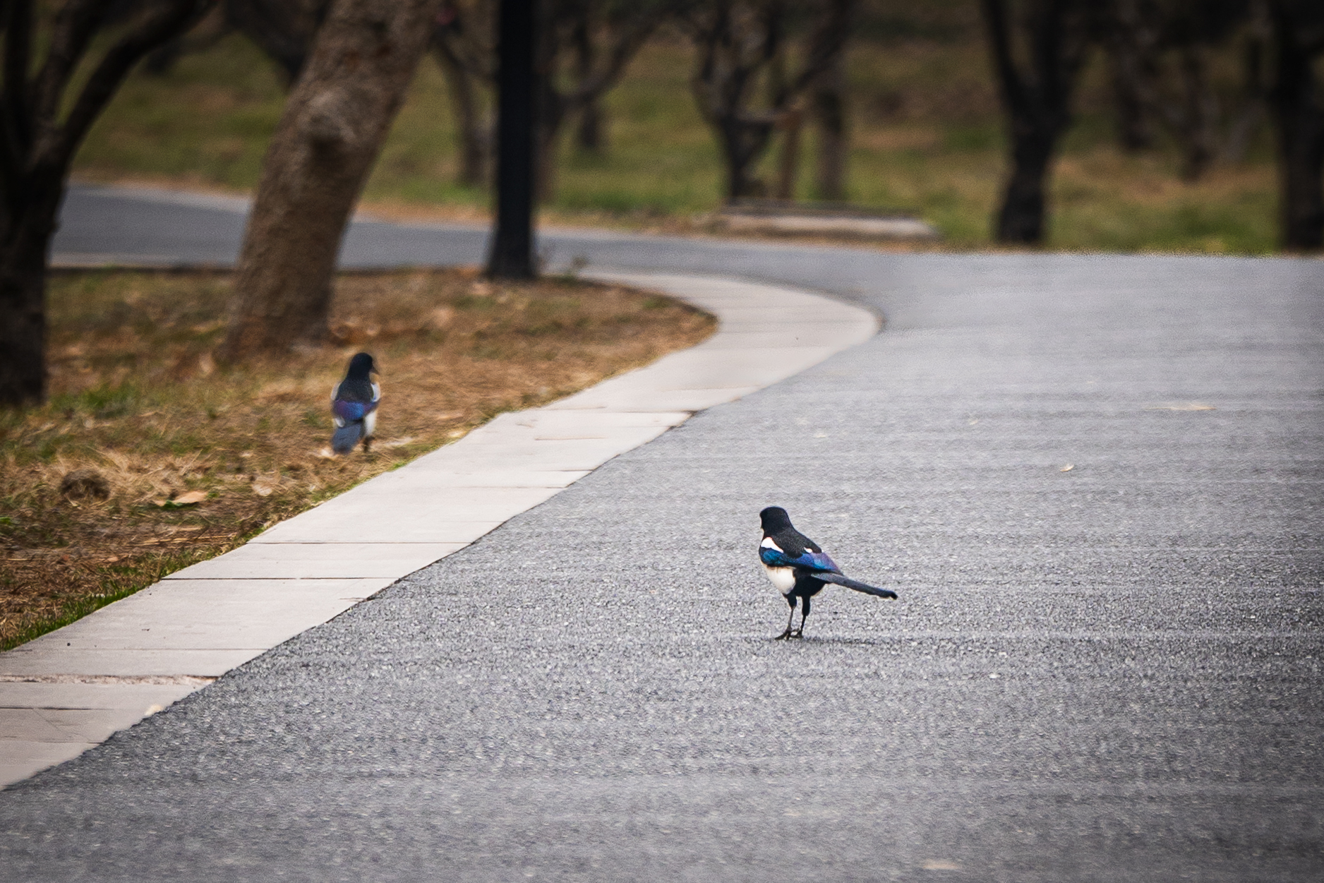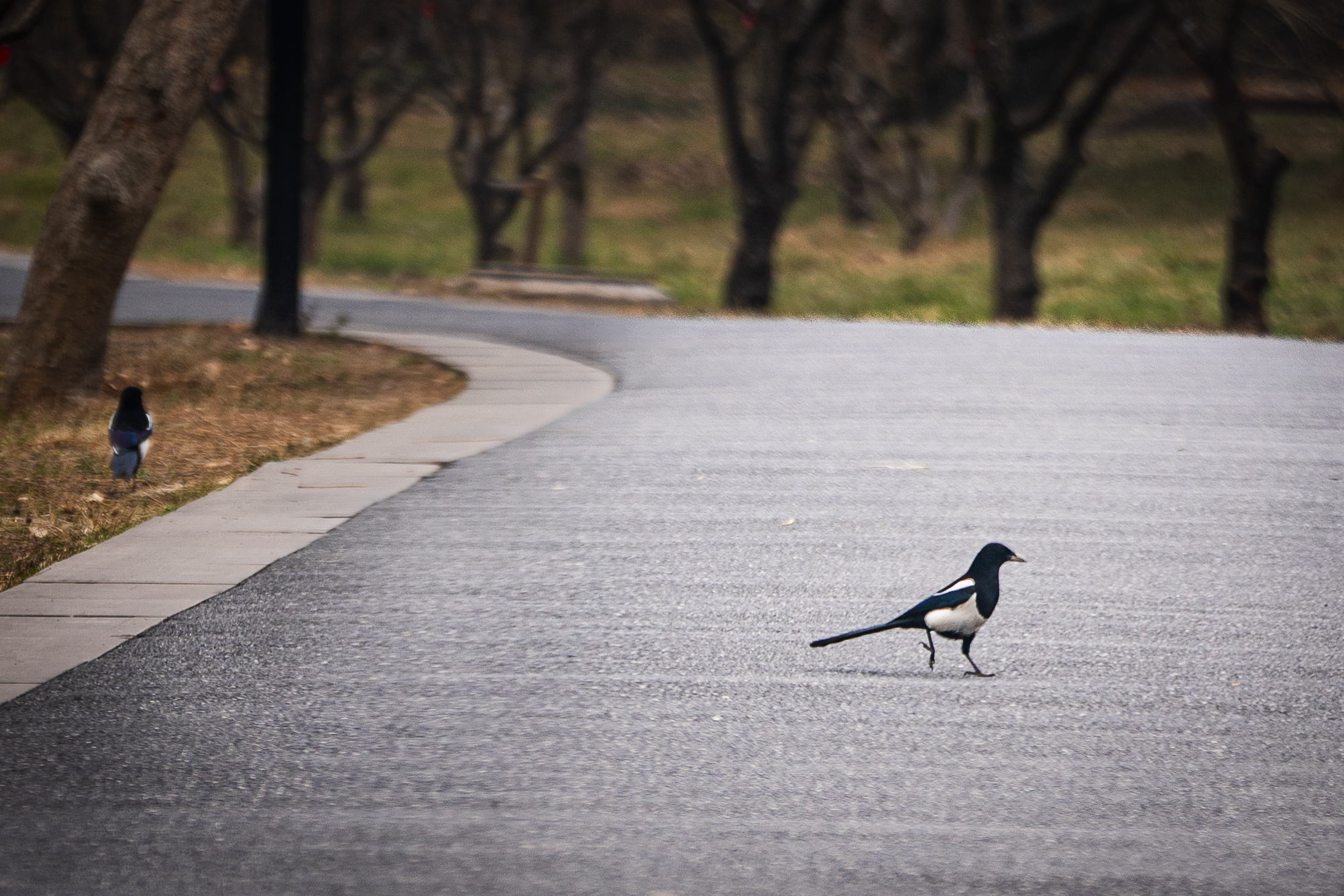 喜鹊两口子闹别扭啦! 周日去西溪湿地曲水寻梅,路遇小喜鹊拦路,寓意好事发生,还是仅仅偶遇呢?