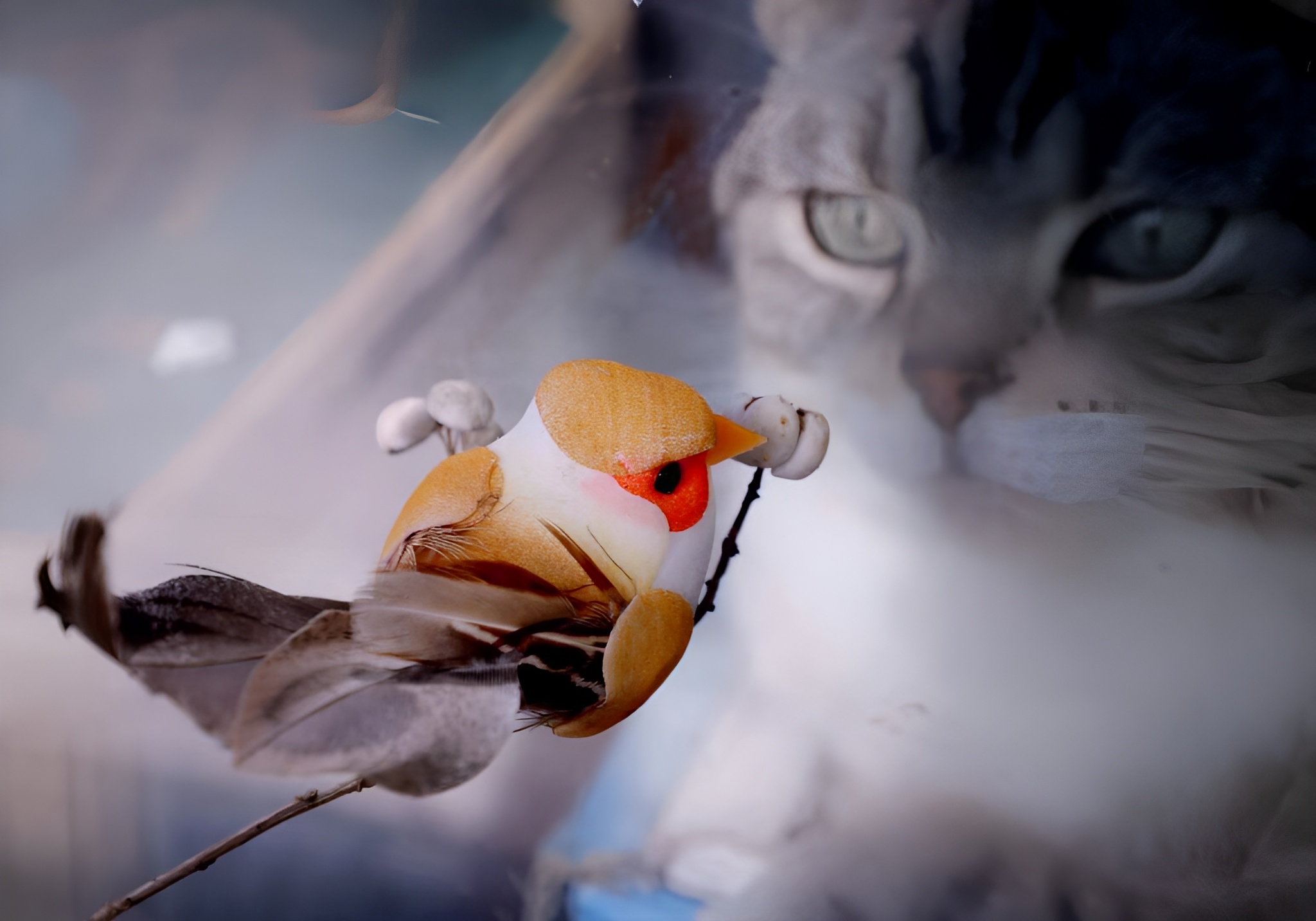 窗边,橘白相间的猫静卧,羽与枝轻倚,柔光里它凝视着世界,毛茸茸的温柔,正悄然生长。