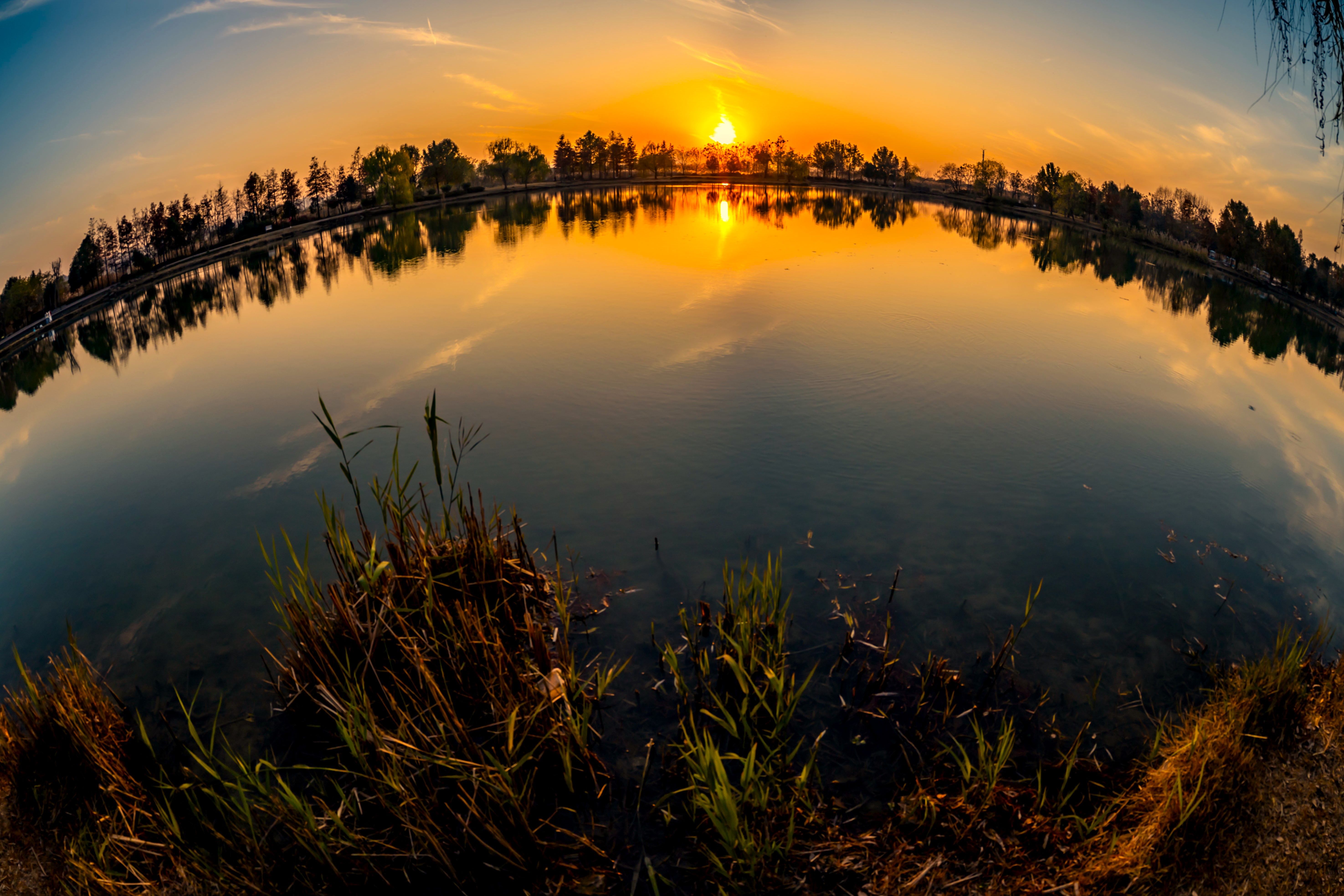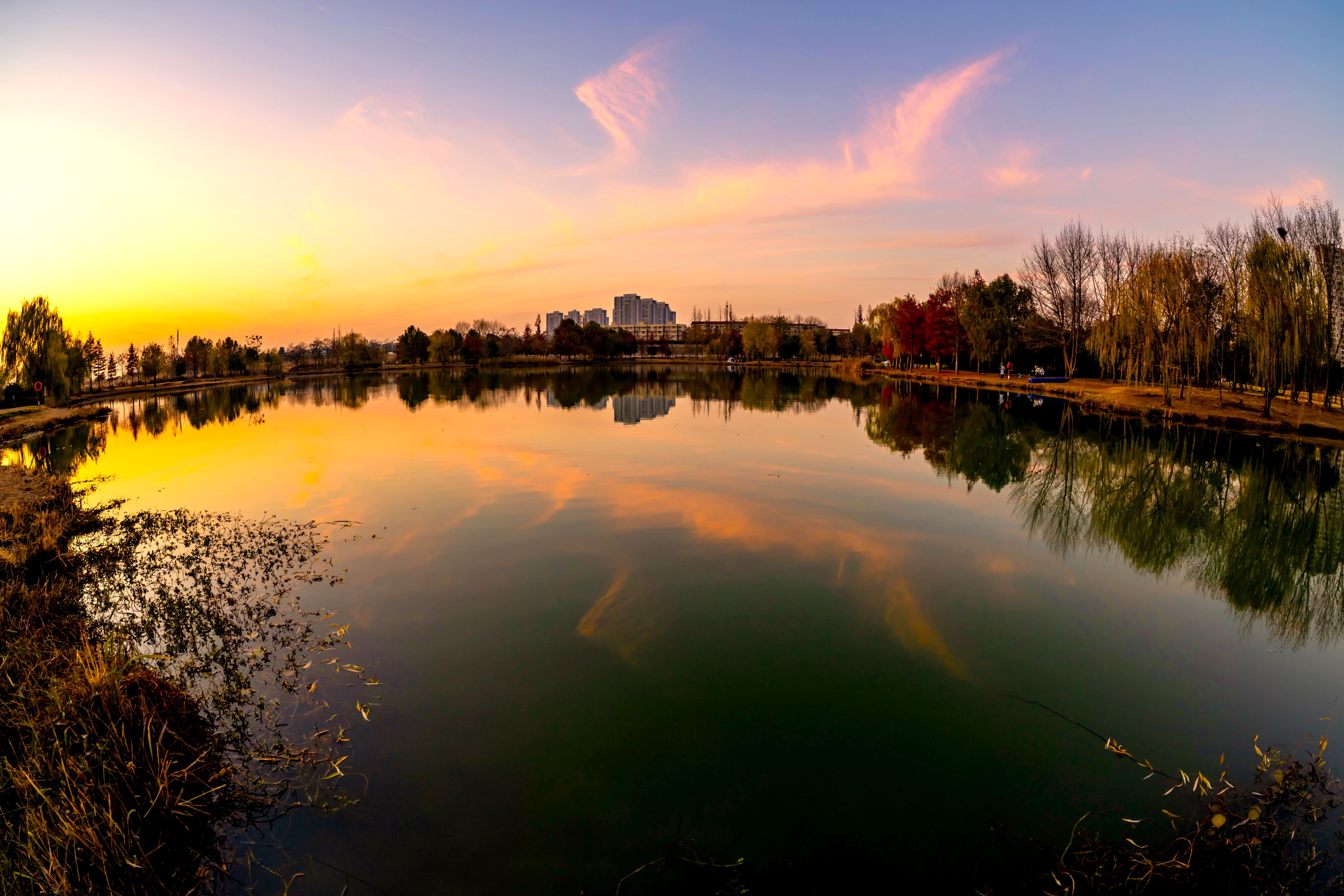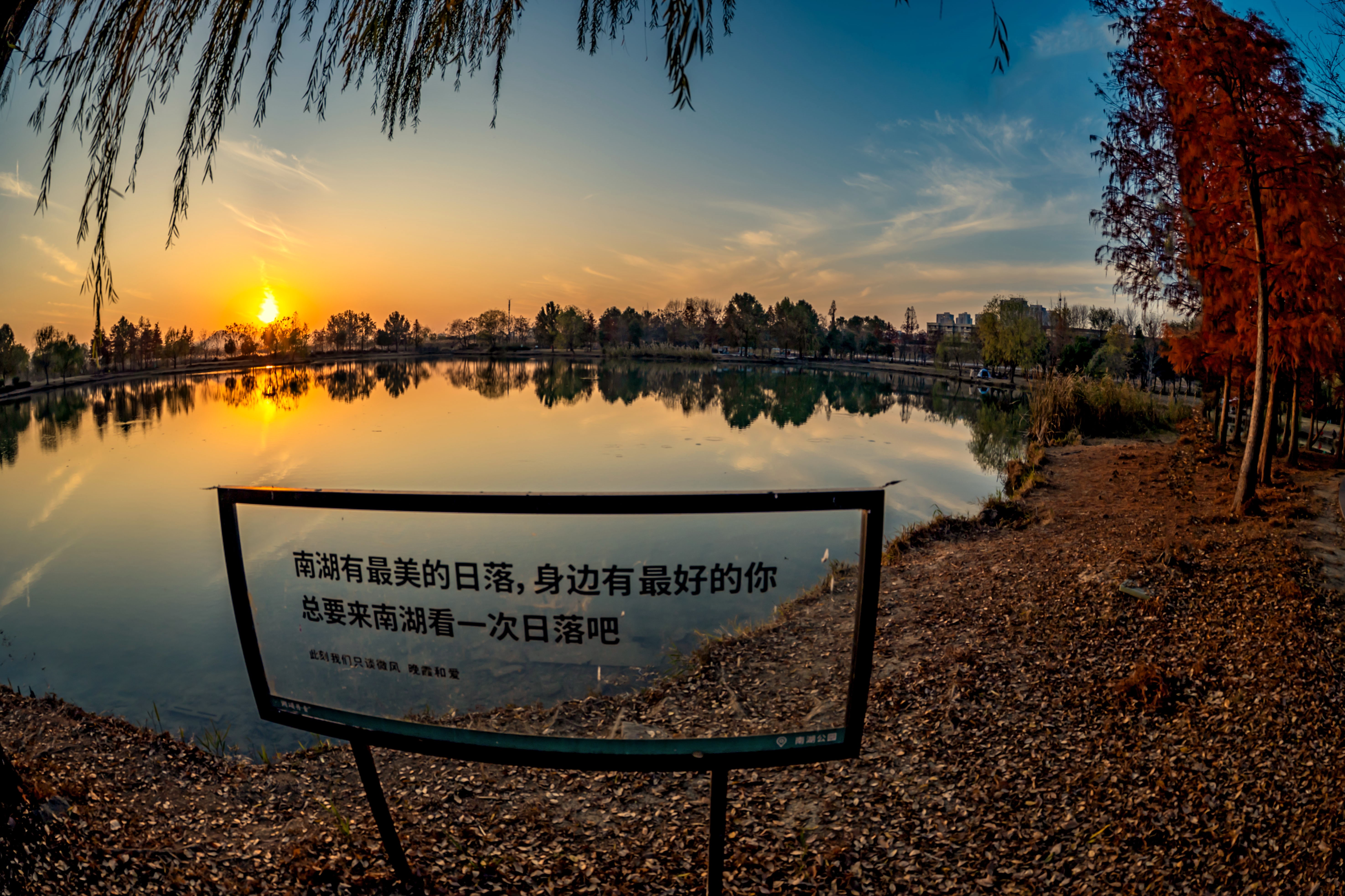 南湖公园的黄昏太上头!夕阳把天染成蜜桃色,柳枝剪影轻轻晃在镜面湖上,远处楼群悄悄融进晚霞里~蹲在水边小径拍了组鱼眼,连指示牌都自带氛围感。余杭南湖,城市与自然偷着谈恋爱的地方~