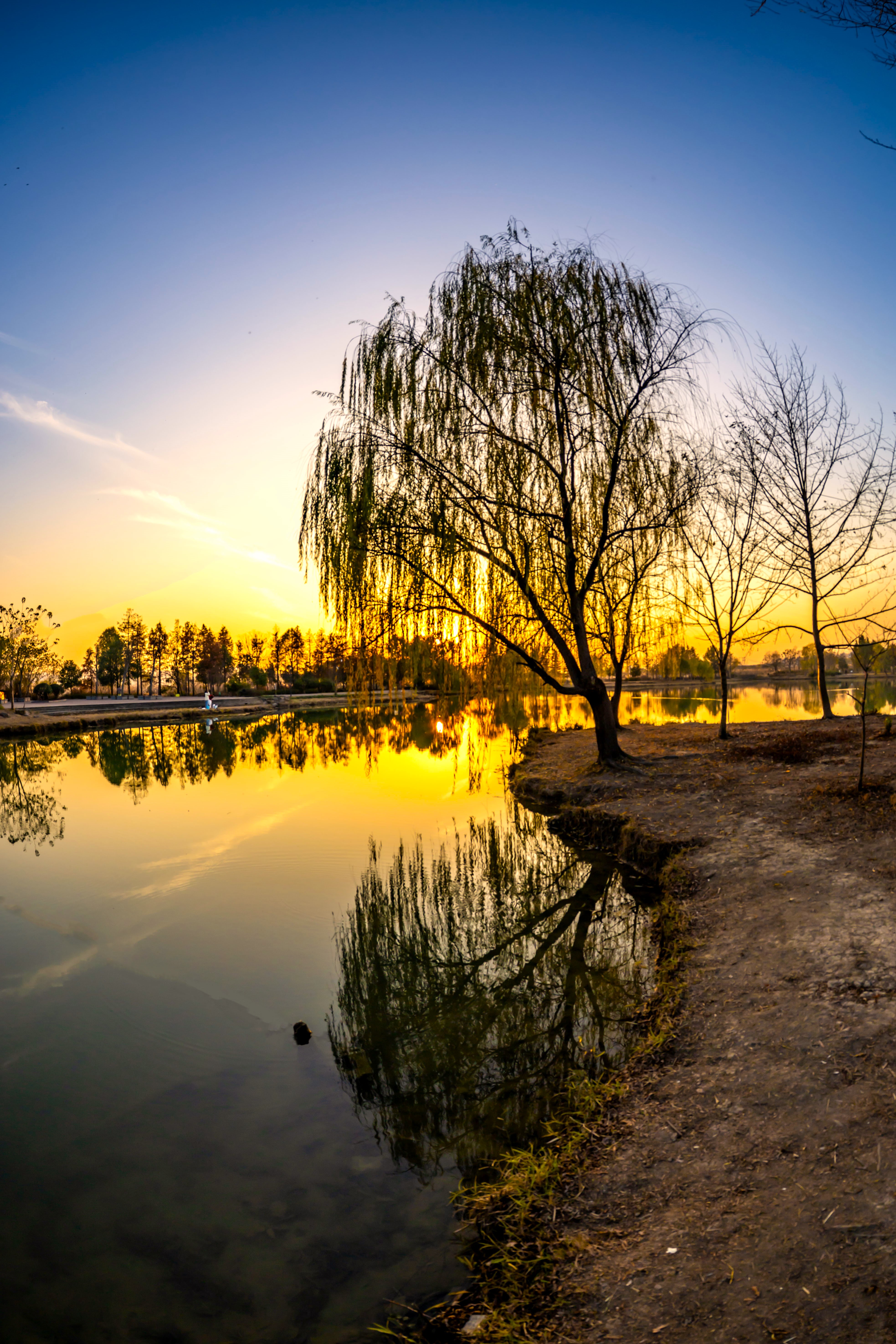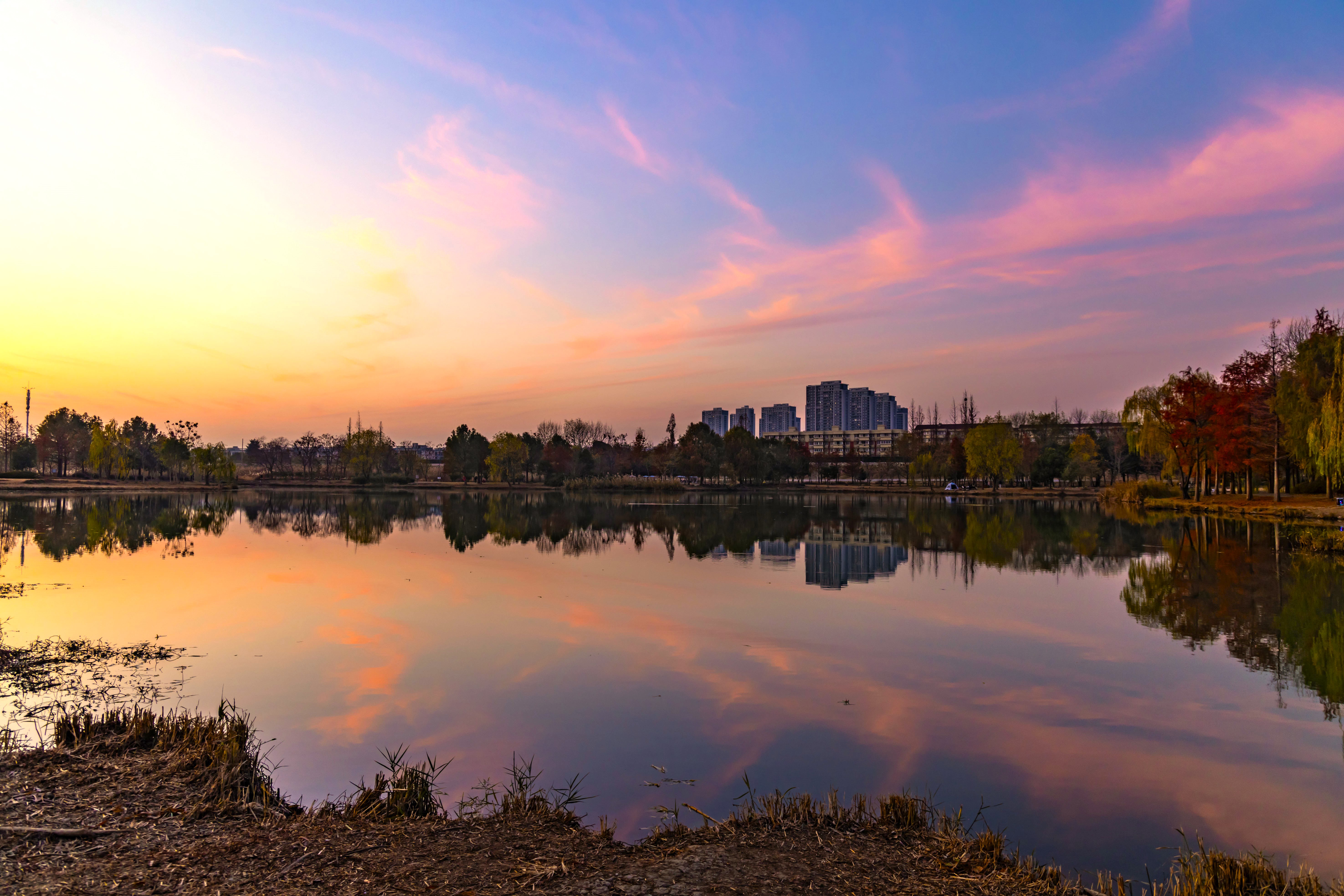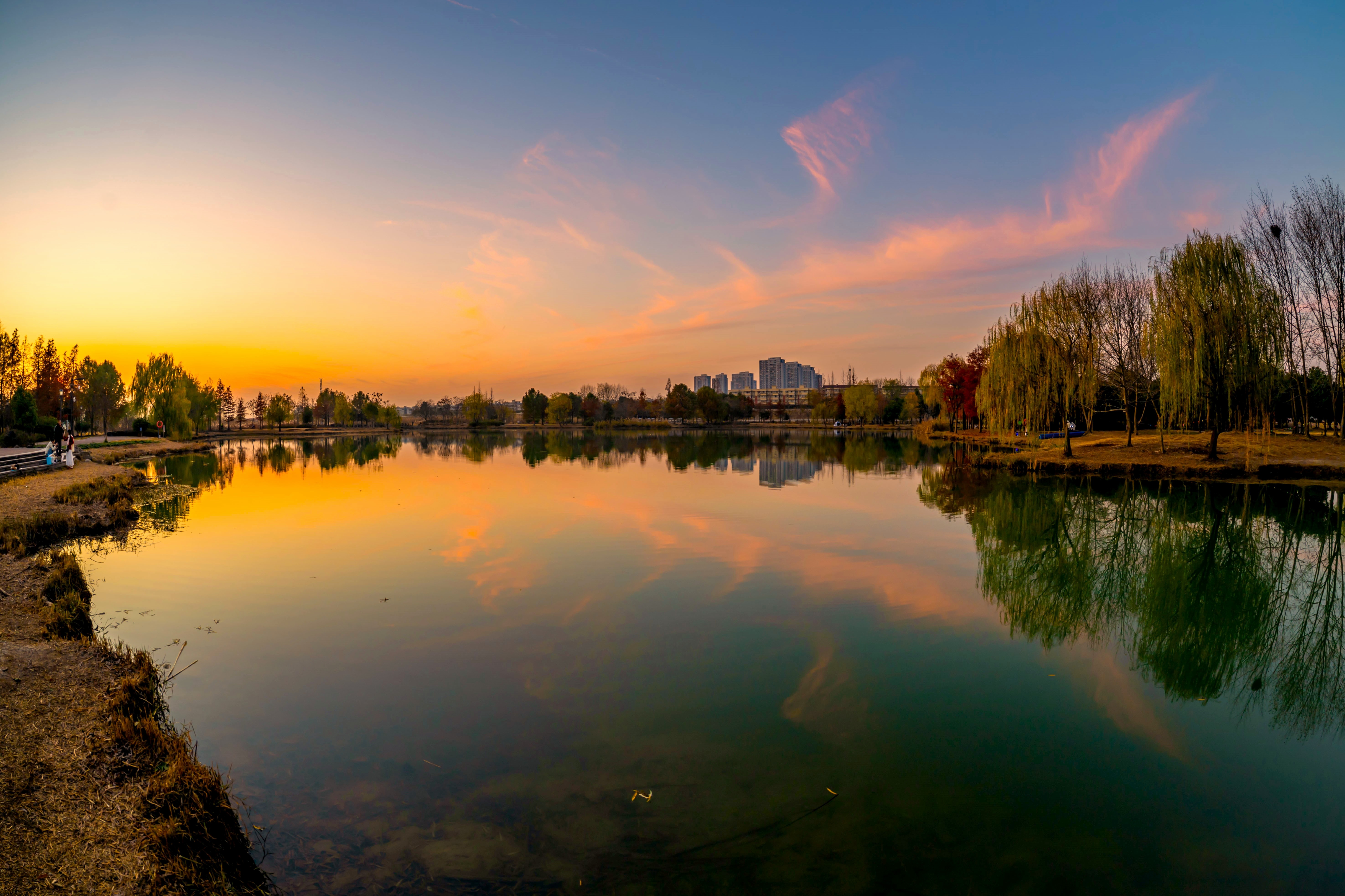 南湖公园的黄昏太上头!夕阳把天染成蜜桃色,柳枝剪影轻轻晃在镜面湖上,远处楼群悄悄融进晚霞里~蹲在水边小径拍了组鱼眼,连指示牌都自带氛围感。余杭南湖,城市与自然偷着谈恋爱的地方~