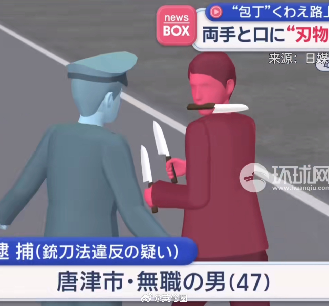 【日本警方逮捕一名三刀流男子】日媒:手持两把、嘴叼一把菜刀,日本一男子被警方当场逮捕 据全日本新闻网1月26日报道,日本佐贺县唐津市一名47岁无业男子因携带三把菜刀在街头行走被警方逮捕。警方接报后赶到现场,发现该男子双手各持一把菜刀,嘴里还叼着一把,刀身长度分别为18厘米、17.5厘米和13.5厘米。警方以涉嫌违反《枪刀法》将其当场拘捕。面对指控,该男子否认违法,称“只是去认识的人家里取蔬菜”。(环球网)