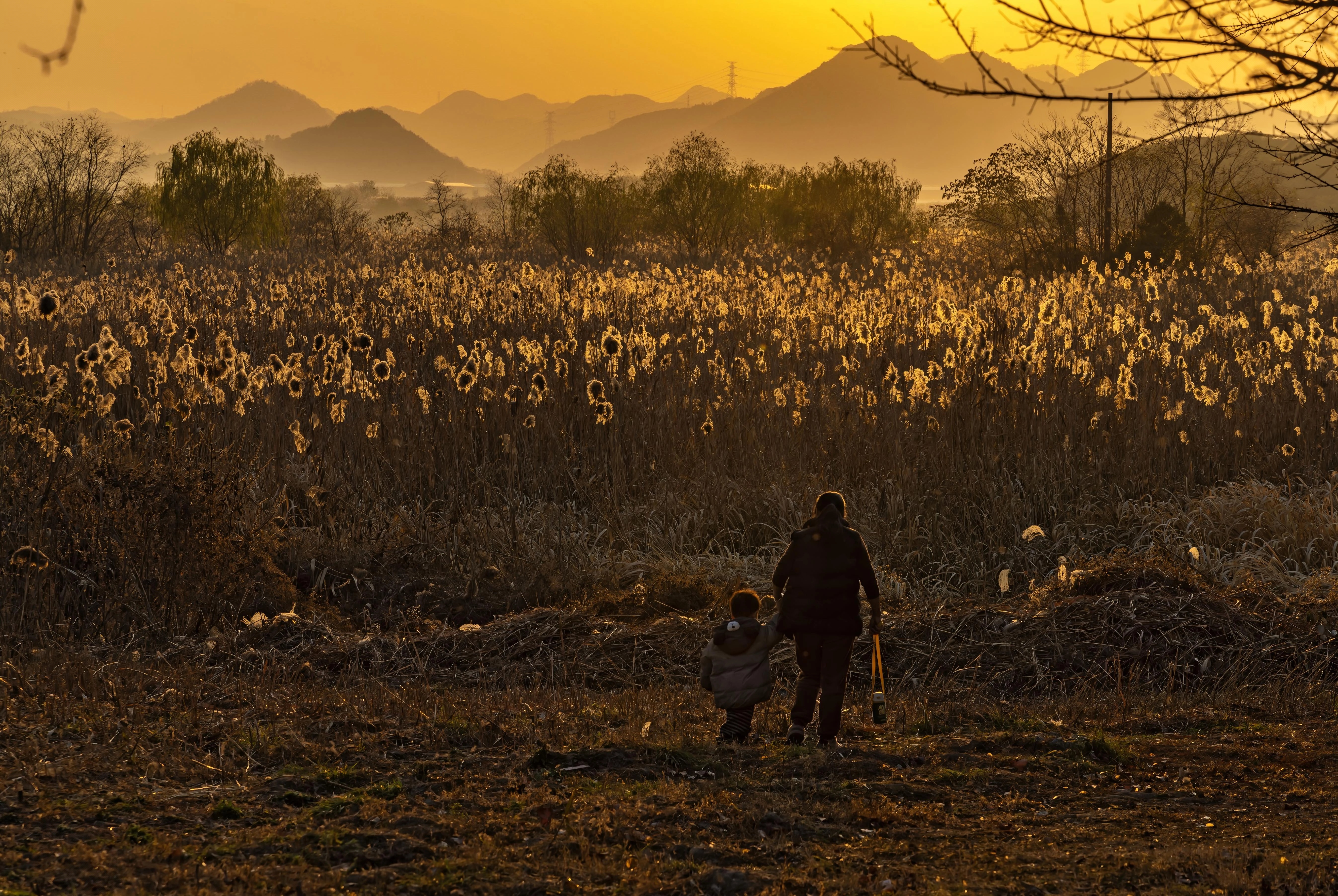冬日黄昏,祖孙俩慢悠悠踱过枯草田埂,芦苇在夕照里摇曳,远山温柔地卧着。剪影拉长,暖光洒满农耕区,连干枯的植物都泛着柔光~这大概就是最松弛的亲子时光吧!