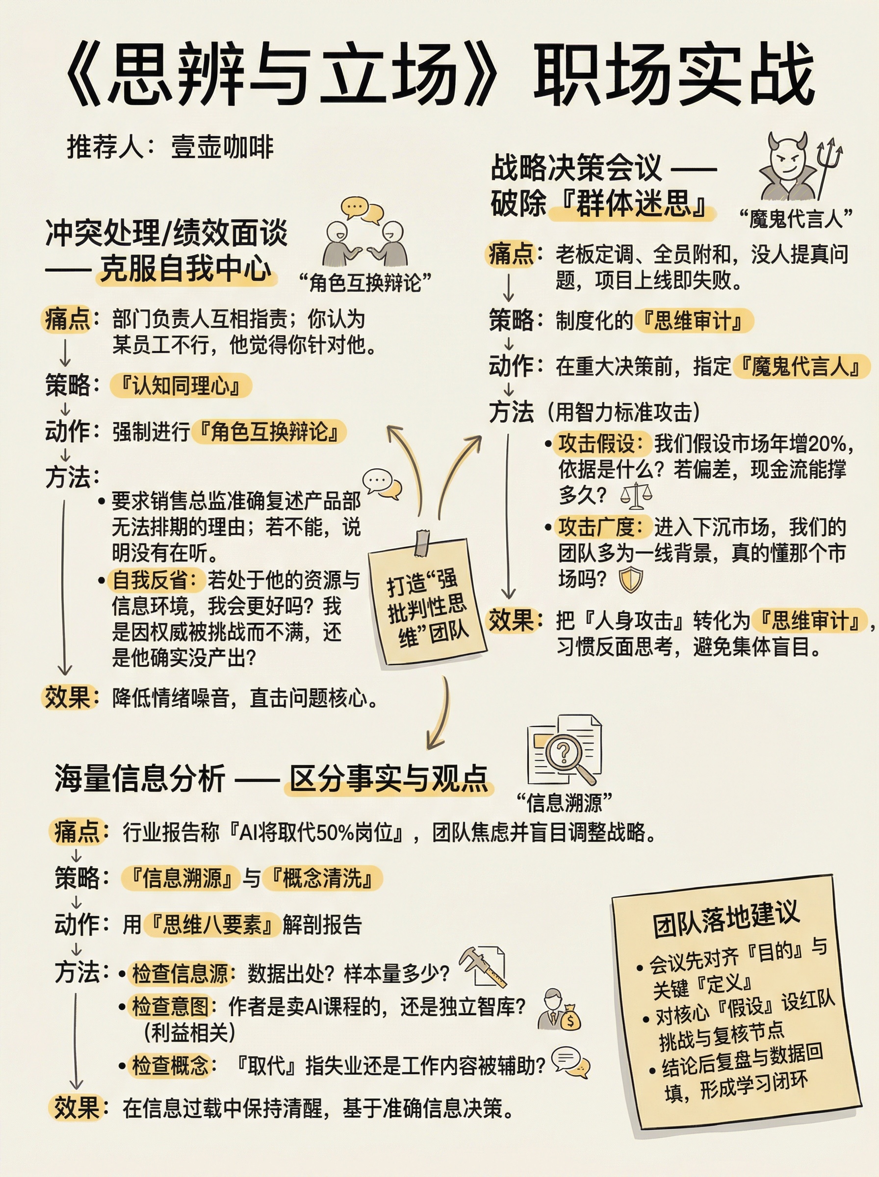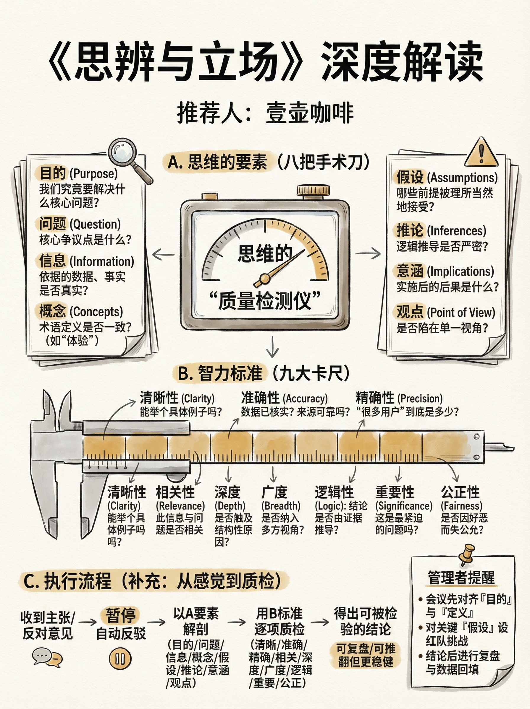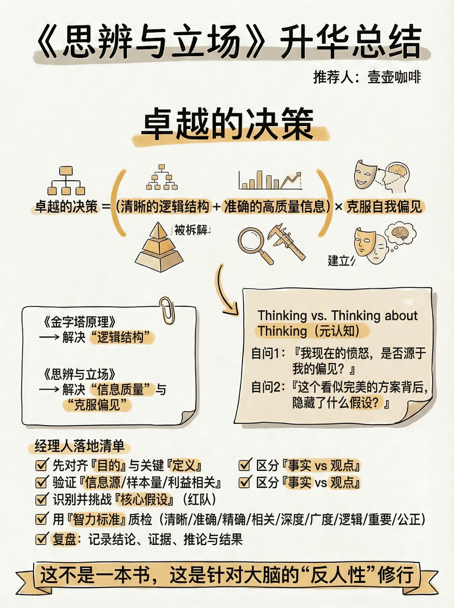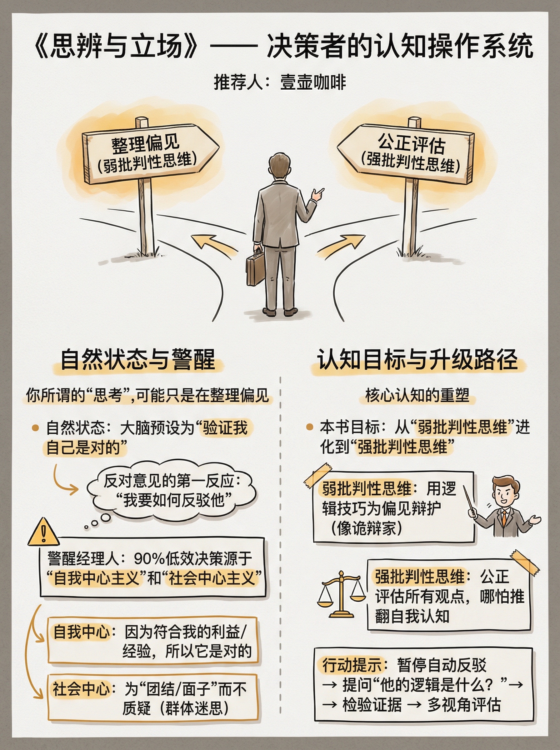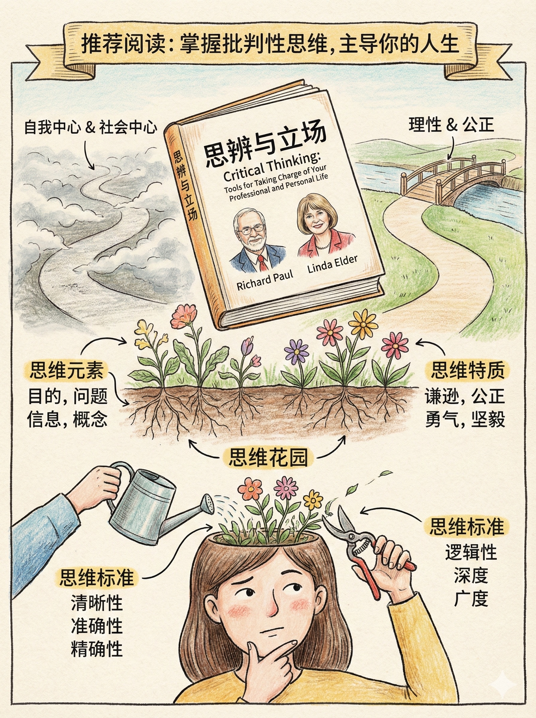 最近刚读完《思辨与立场》才明白“以前总觉得,只要智商高、反应快,就是会思考。”原来是错的,未经审视的思考,大多是偏见、谎言和自我欺骗的混合体。 🌫️ 真正的思考,不需要咄咄逼人,也不需要证明自己是对的。 你需要的是——公正的思维(Fair-mindedness)。⚖️ 因为人生,其实就是由我们做出的无数个决定构成的。而决定的质量,取决于我们思考的质量。 《思辨与立场》不仅仅教你逻辑技巧,更是一场打破“自我中心”的修行。🧘 它提醒我们:我们的大脑天生是自私的(Egocentric),只喜欢接受符合自己利益的信息。 今天又因为别人的反对意见而愤怒了? 没关系。 正如书中所说,觉察到自己的“自我中心”和“防御机制”,这本身就是一次极好的思维升级。 愿我们都能成为那个“对自己思维进行思考”的智者,拥有看清世界真相的立场。👁️