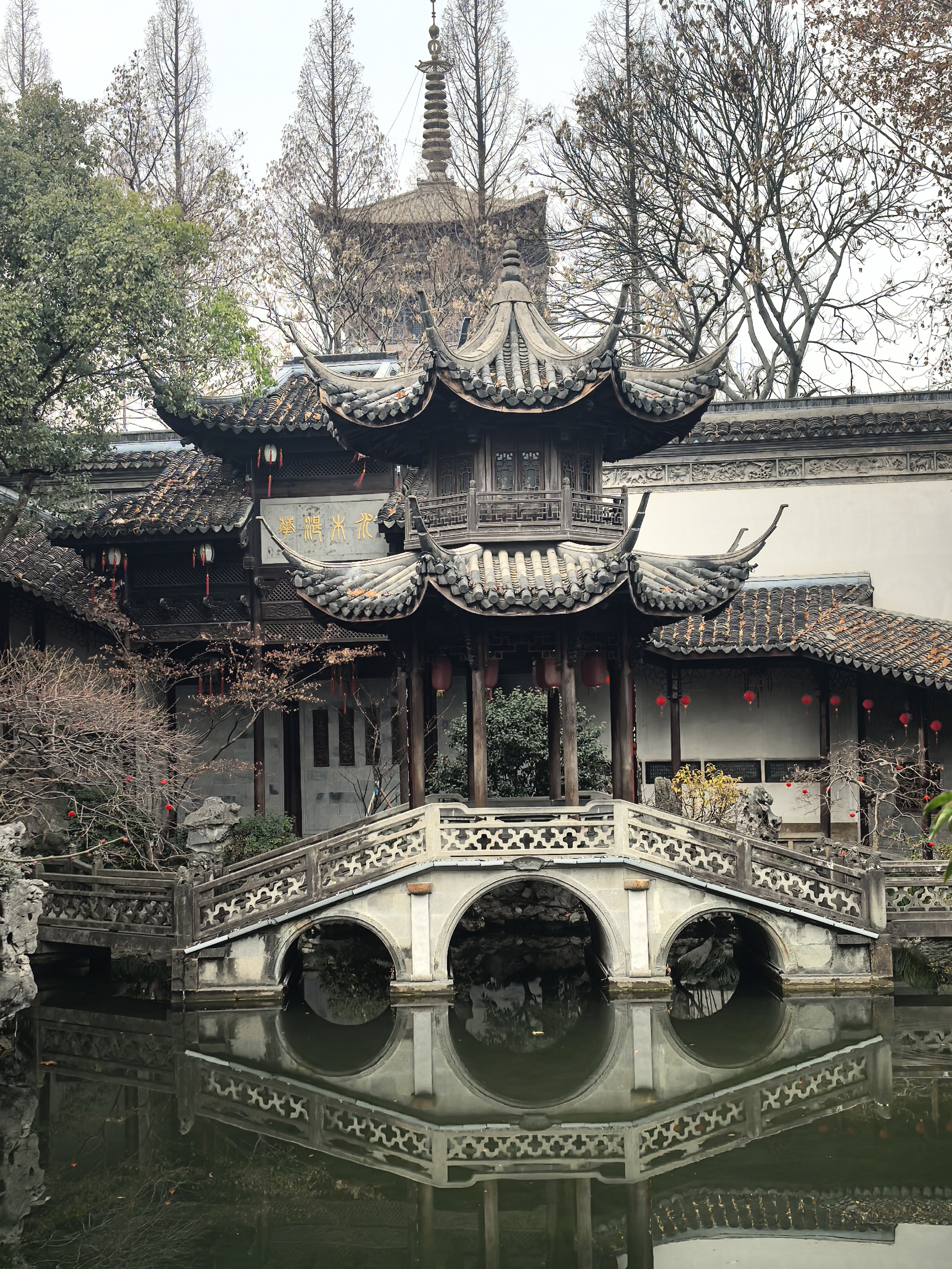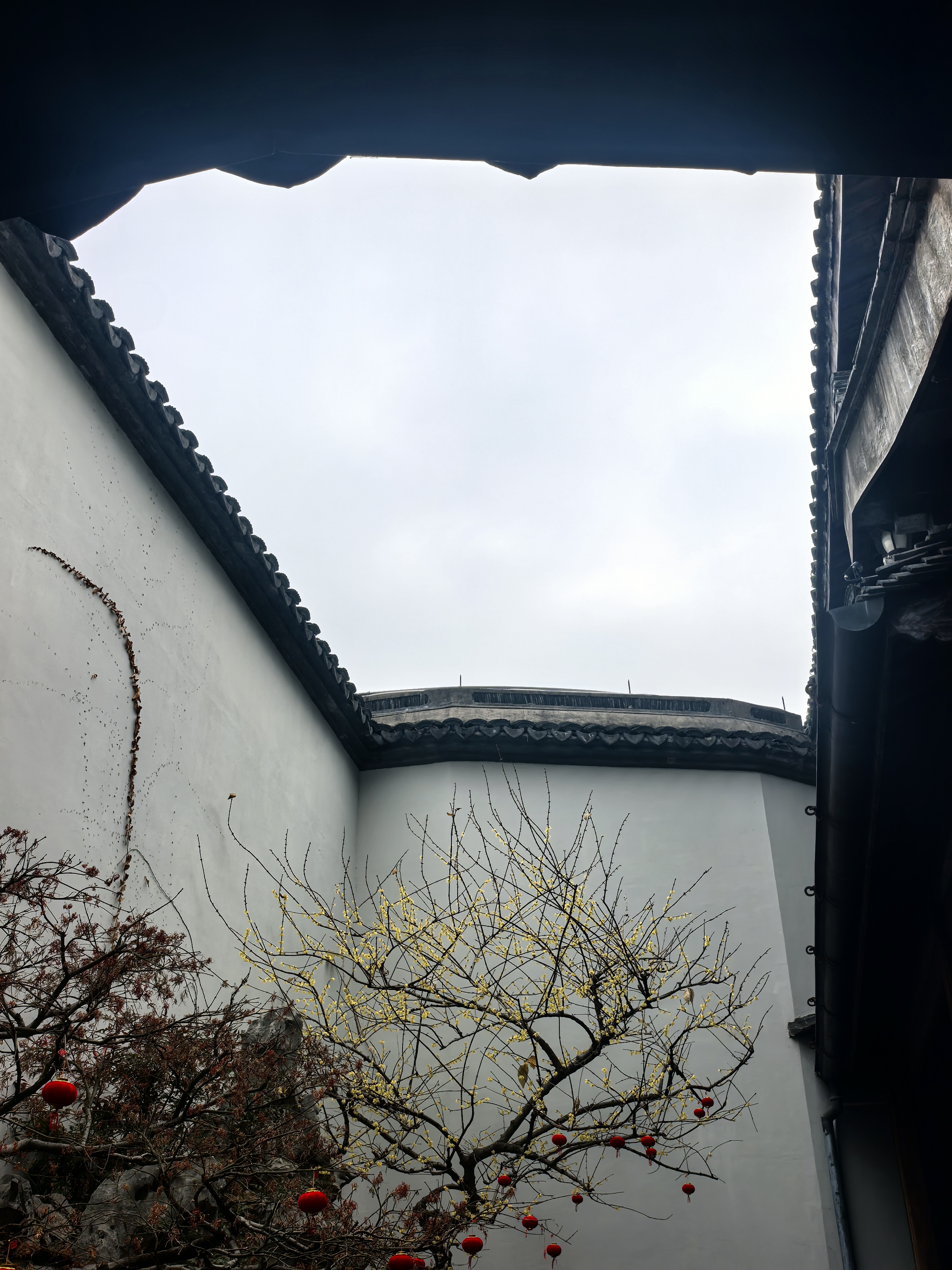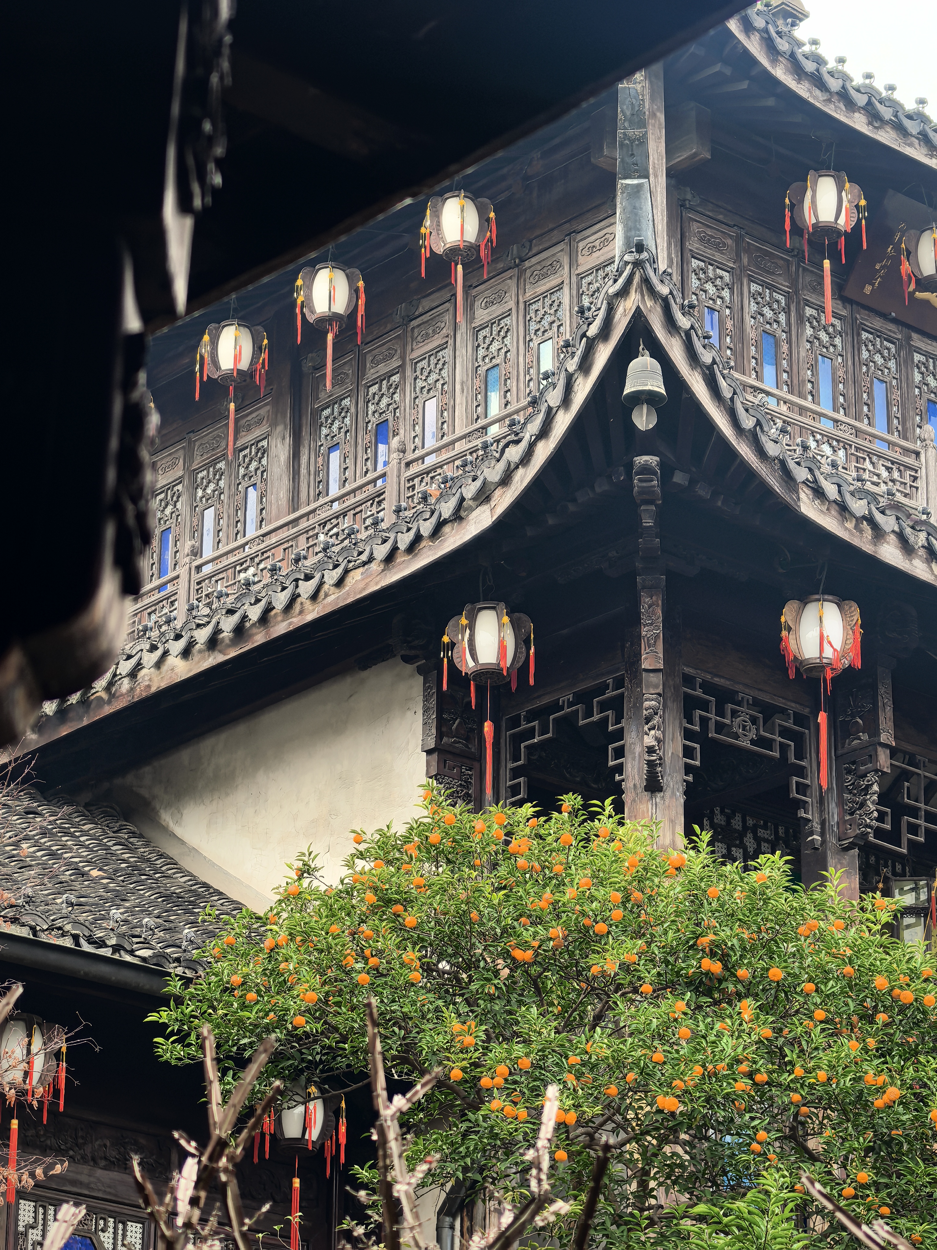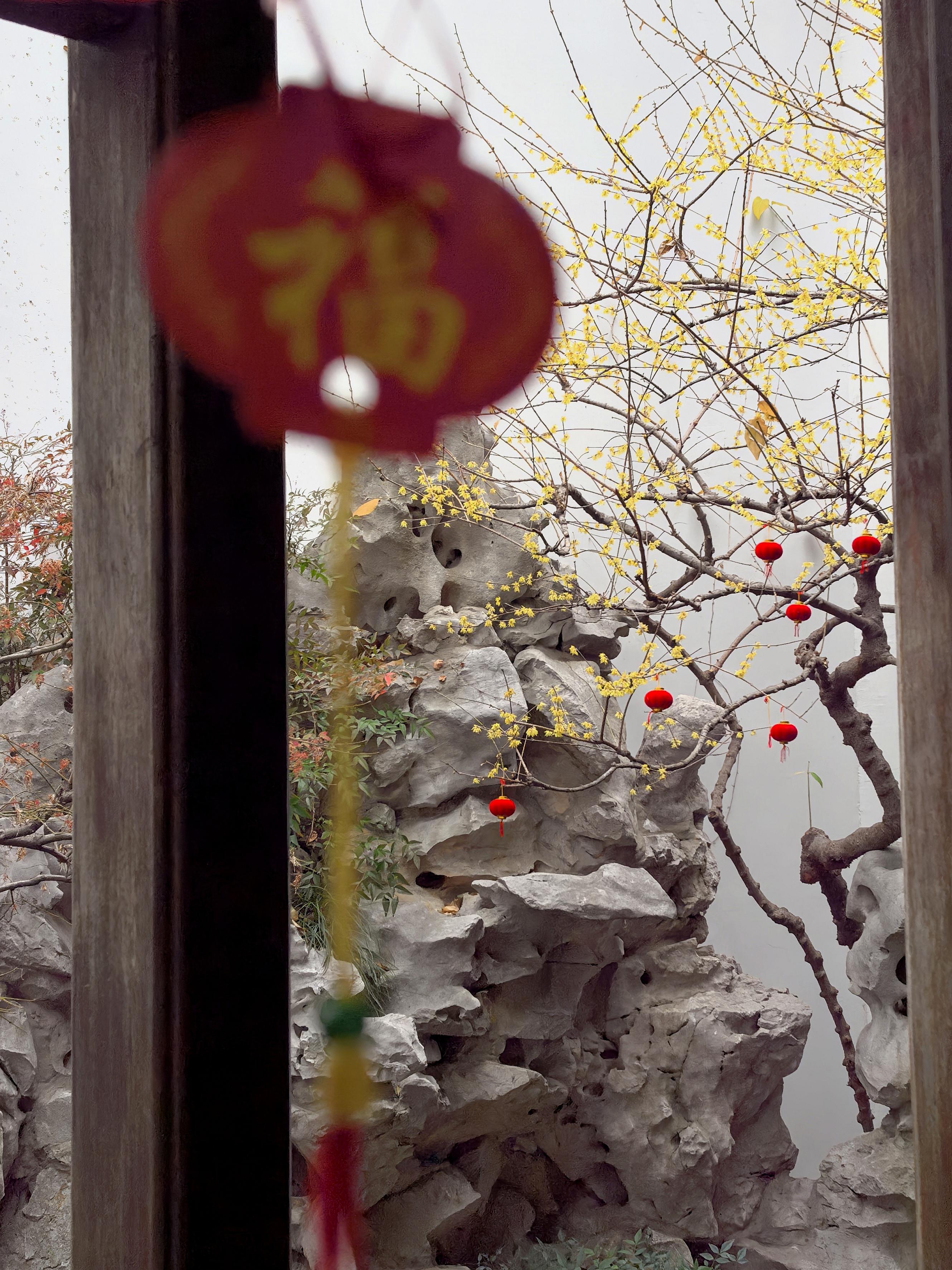 走到胡雪岩故居边上,临时决定拐进来看一看那株藏着江南园标风味的蜡梅。。 这株墙角蜡梅开得正热闹,嫩黄的花瓣缀在虬曲枝头,透着一股温婉与禅意,与黛瓦粉墙相映成趣,清冷的香气似要穿透时光。 其实胡雪岩故居内还有一株很有味道的红梅,长在假山白墙边,只是此刻还只绽出花苞,要等春节后才能赏了。 水池里红锦鲤成群游弋,橘红与浅白的鳞光在澄澈水面漾开,搅碎了亭台楼阁的倒影,飞檐翘角、雕梁画栋的亭榭,在水中晕成墨色的诗,与枯树的枝桠缠绵交错,恍若一幅流动的水墨。 红灯笼从木栏间探出,红红的“福”字与梅枝上的小红果相映,为清寂的庭院添了几分烟火气。 石桥静卧水面,廊下人影绰约,古意与生机在此刻相融,隆冬的胡雪岩故居,既有岁月沉淀的静谧,又藏着生命跃动的暖意。