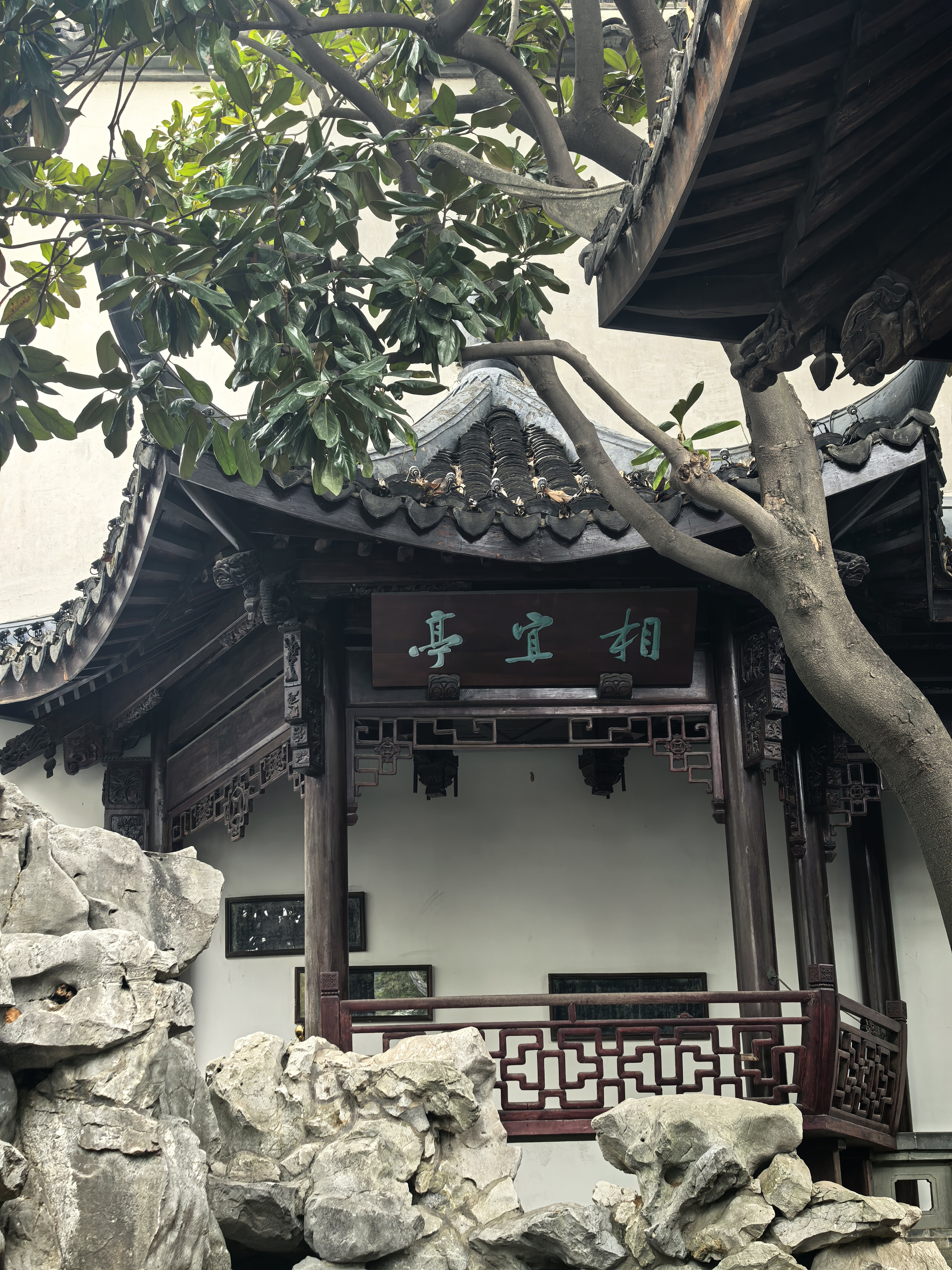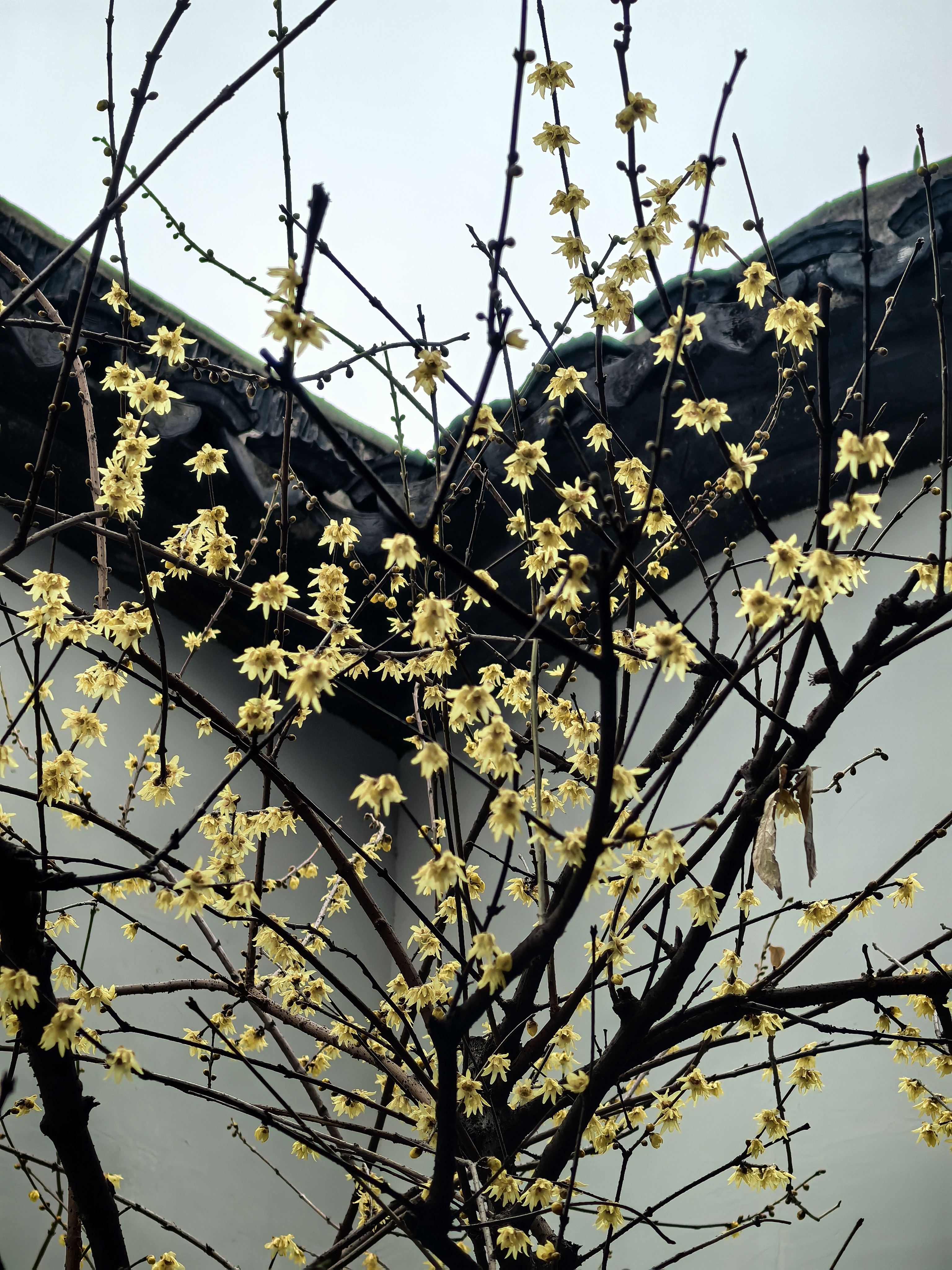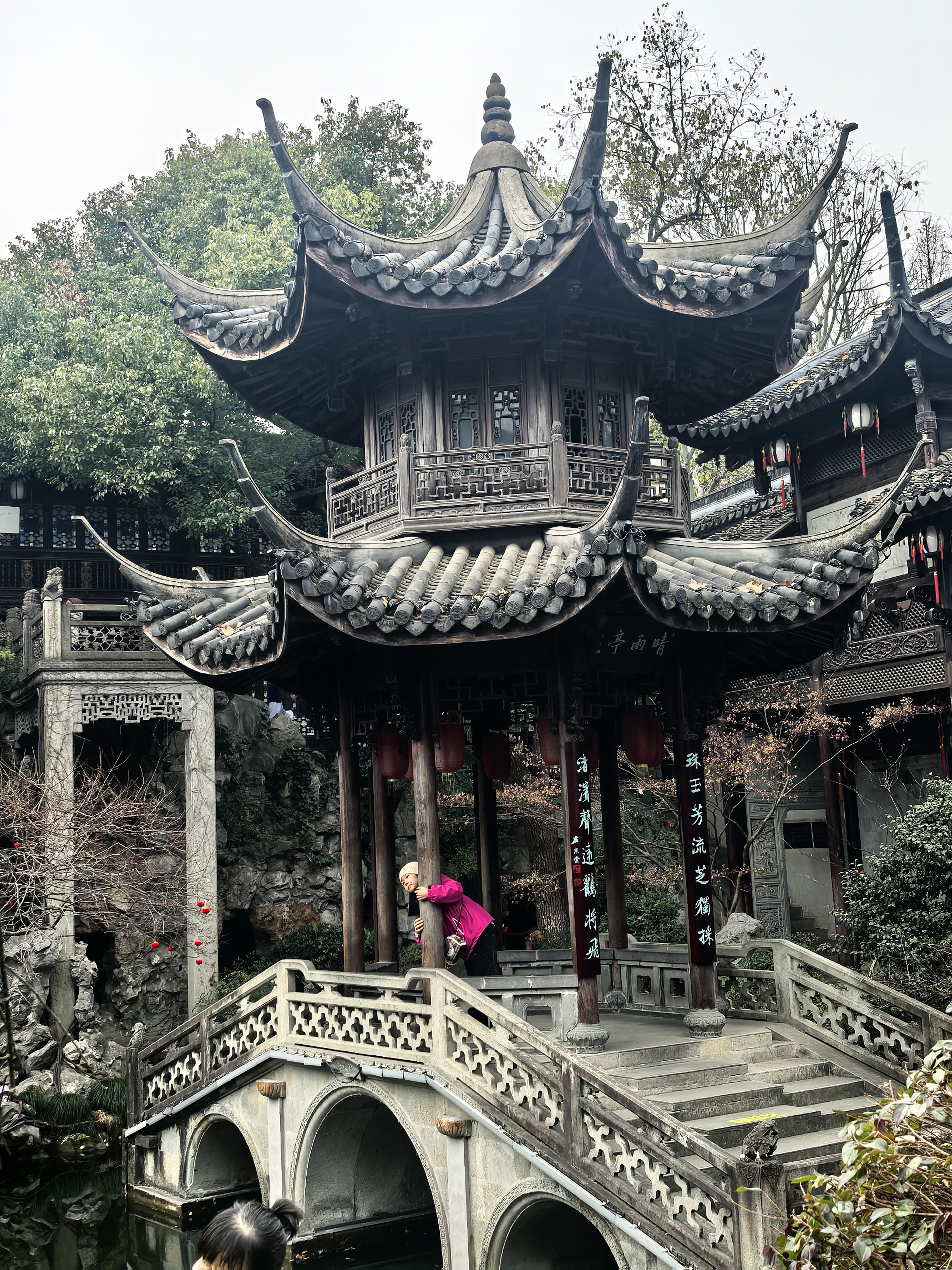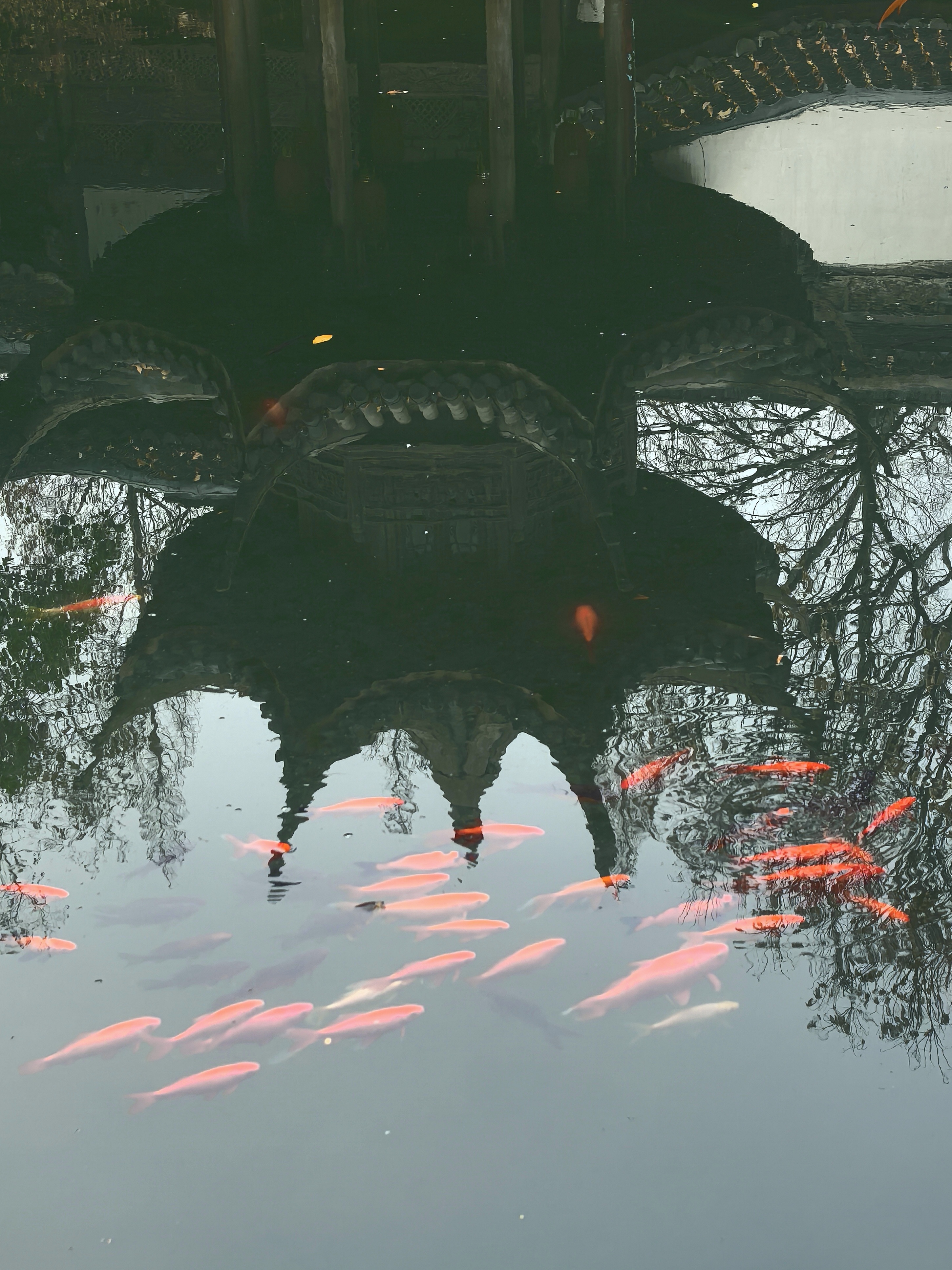 走到胡雪岩故居边上,临时决定拐进来看一看那株藏着江南园标风味的蜡梅。。 这株墙角蜡梅开得正热闹,嫩黄的花瓣缀在虬曲枝头,透着一股温婉与禅意,与黛瓦粉墙相映成趣,清冷的香气似要穿透时光。 其实胡雪岩故居内还有一株很有味道的红梅,长在假山白墙边,只是此刻还只绽出花苞,要等春节后才能赏了。 水池里红锦鲤成群游弋,橘红与浅白的鳞光在澄澈水面漾开,搅碎了亭台楼阁的倒影,飞檐翘角、雕梁画栋的亭榭,在水中晕成墨色的诗,与枯树的枝桠缠绵交错,恍若一幅流动的水墨。 红灯笼从木栏间探出,红红的“福”字与梅枝上的小红果相映,为清寂的庭院添了几分烟火气。 石桥静卧水面,廊下人影绰约,古意与生机在此刻相融,隆冬的胡雪岩故居,既有岁月沉淀的静谧,又藏着生命跃动的暖意。
